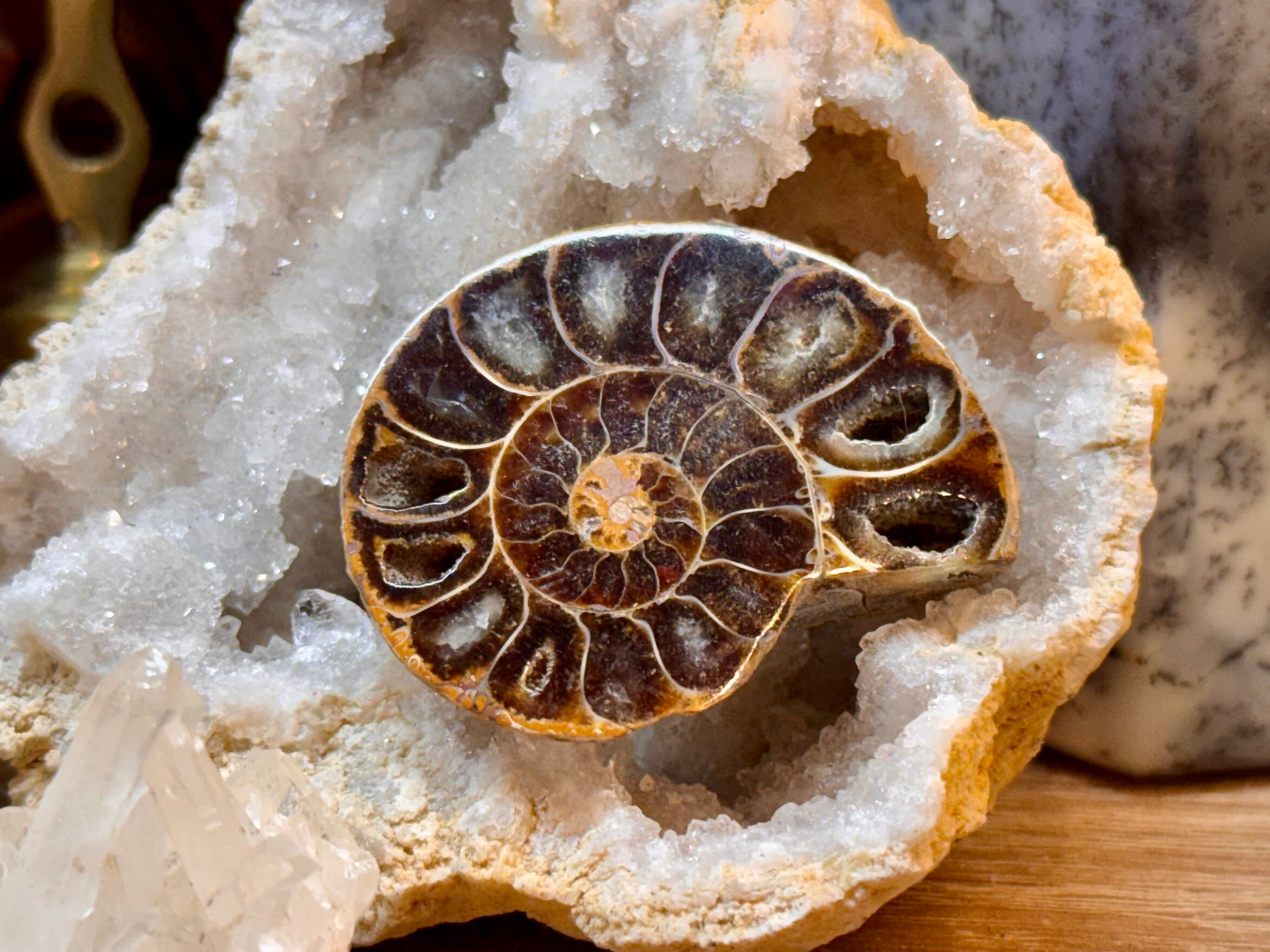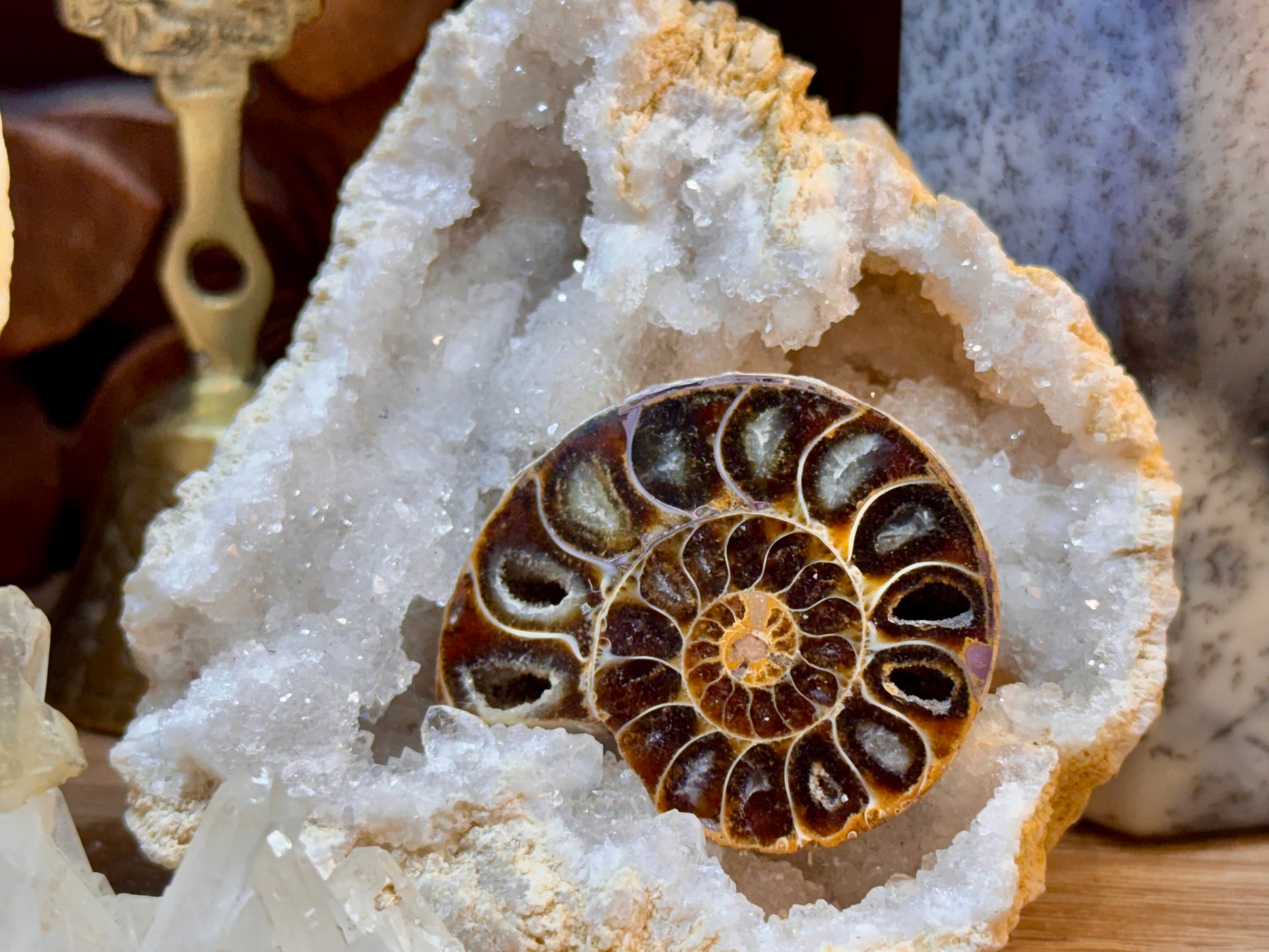 De part sa forme représentant le “nombre d’or”, ce fossile marin aurait de multiples propriétés numériques et géométriques. La forme en spirale de l’ammonite symbolise l’éternité et l’infini.