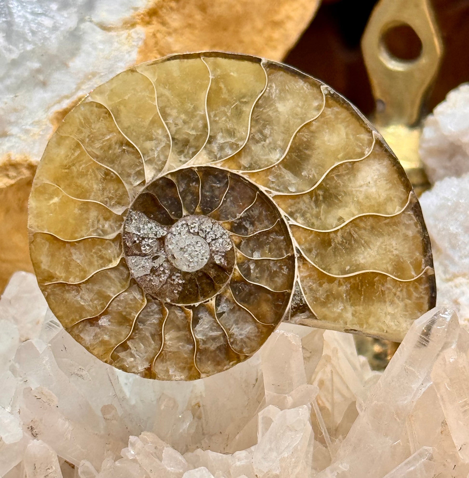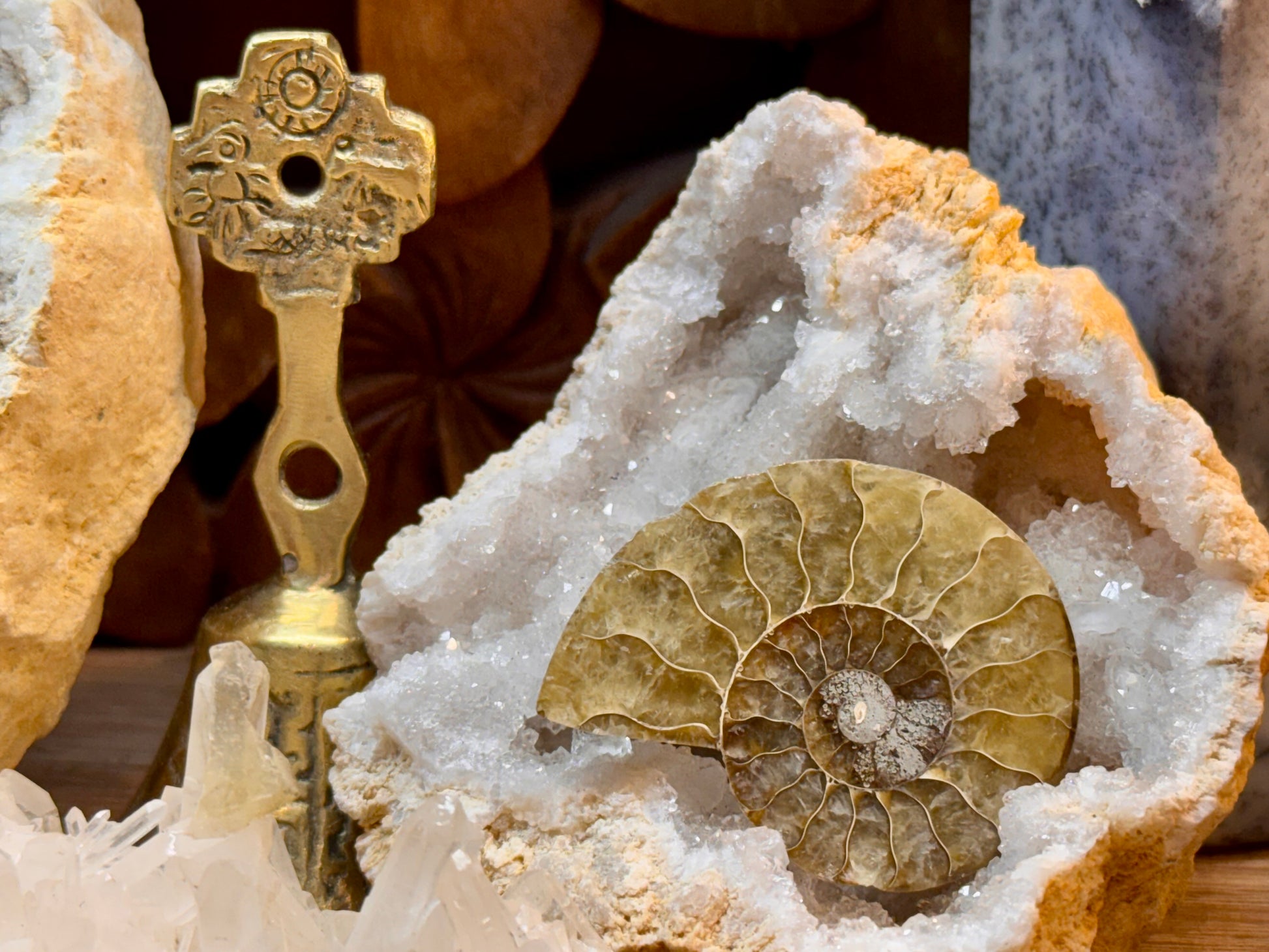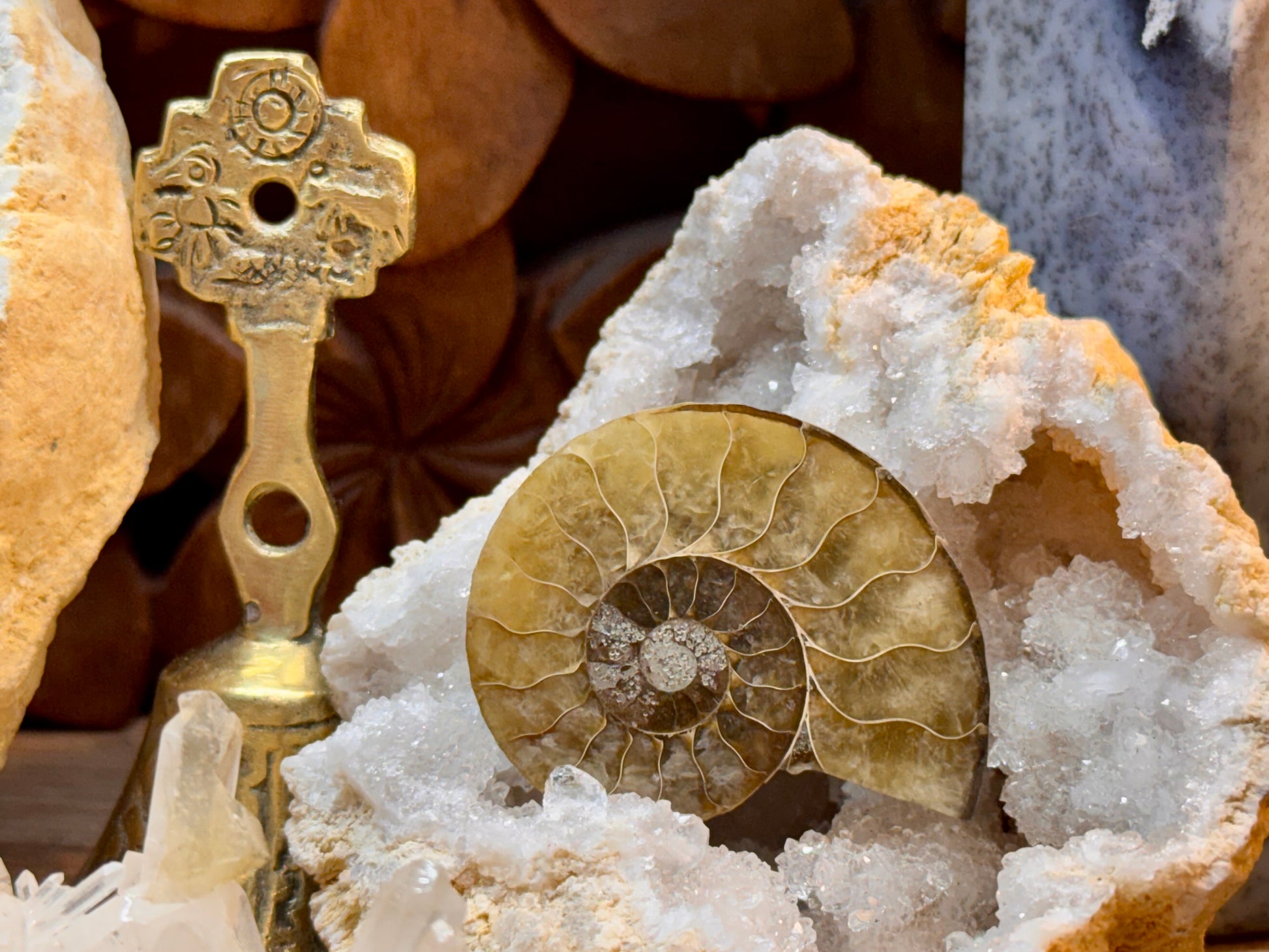 De part sa forme représentant le “nombre d’or”, ce fossile marin aurait de multiples propriétés numériques et géométriques. La forme en spirale de l’ammonite symbolise l’éternité et l’infini.
