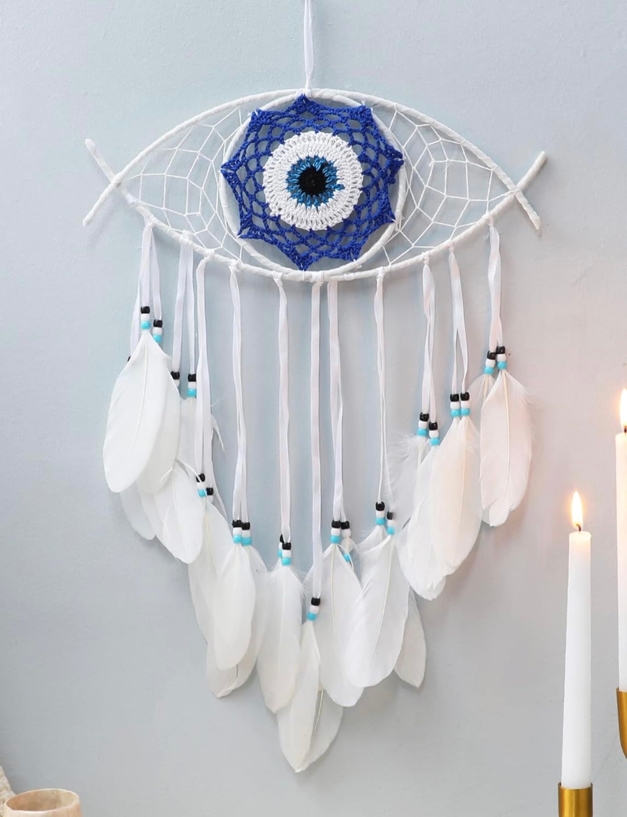 Cet attrape-rêves contre le mauvais œil est fabriqué à la main avec un filet blanc exquis tissé à la main et un macramé bleu, suspendu avec des plumes blanches fluides, décoré de perles.