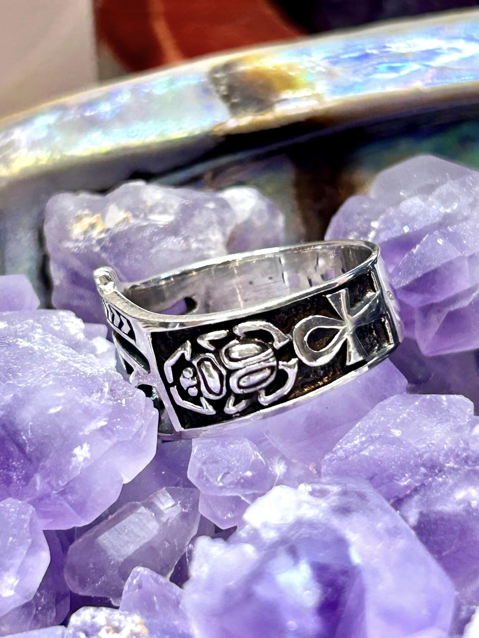 Bague avec symboles de protection égyptienne : œil d’Horus, Scarabée et croix d’Anka