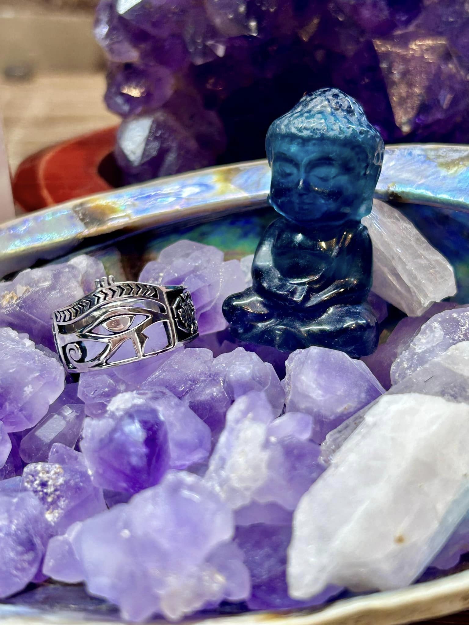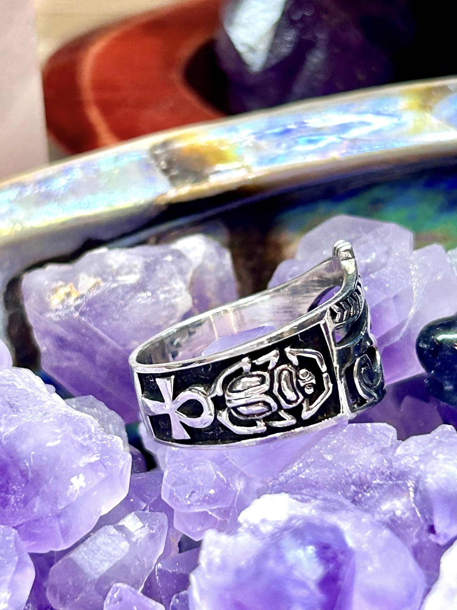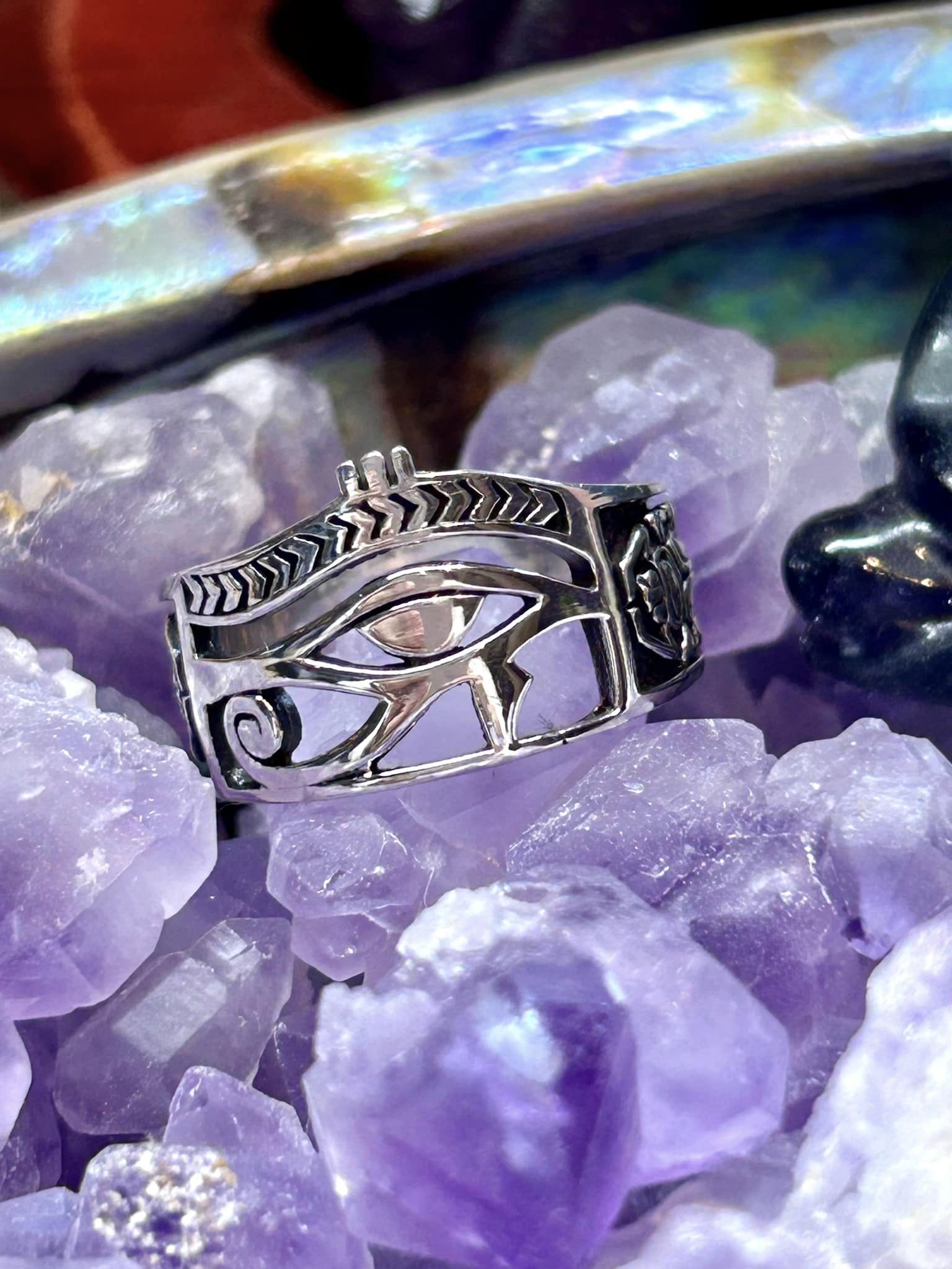 Bague avec symboles de protection égyptienne : œil d’Horus, Scarabée et croix d’Anka