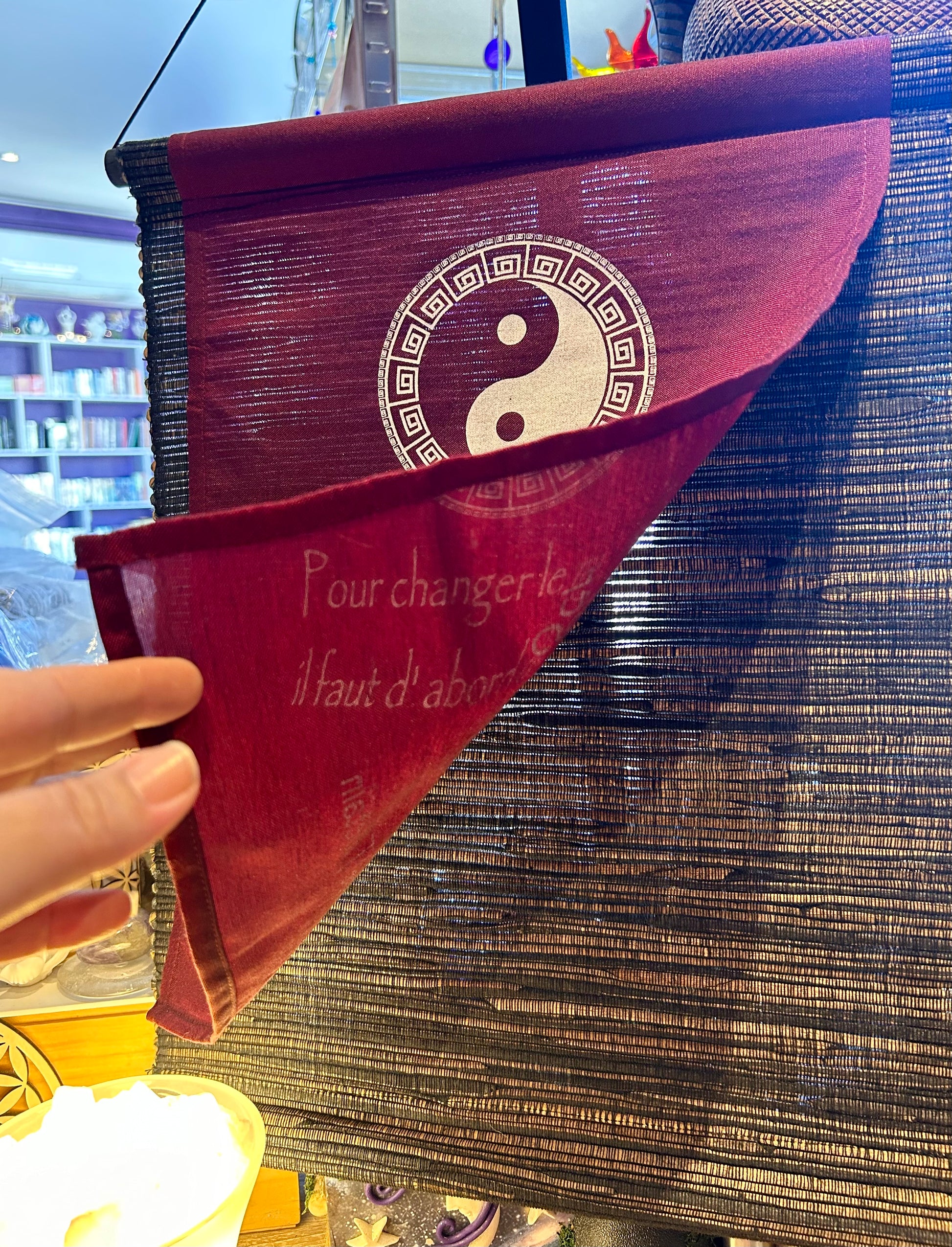Tissu bordeaux et fond tissé et bois