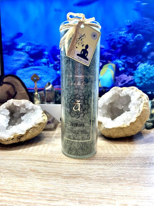 L'amour, la vitalité et la communion avec la nature sont typiquement associés au quatrième chakra, Anahata. Ainsi, nous pouvons être ouverts aux autres. Cette bougie est symbole de la communication et de la nature. Hauteur 20,5 cm - Diamètre : 6 cm. Environ 100 heures de combustion.