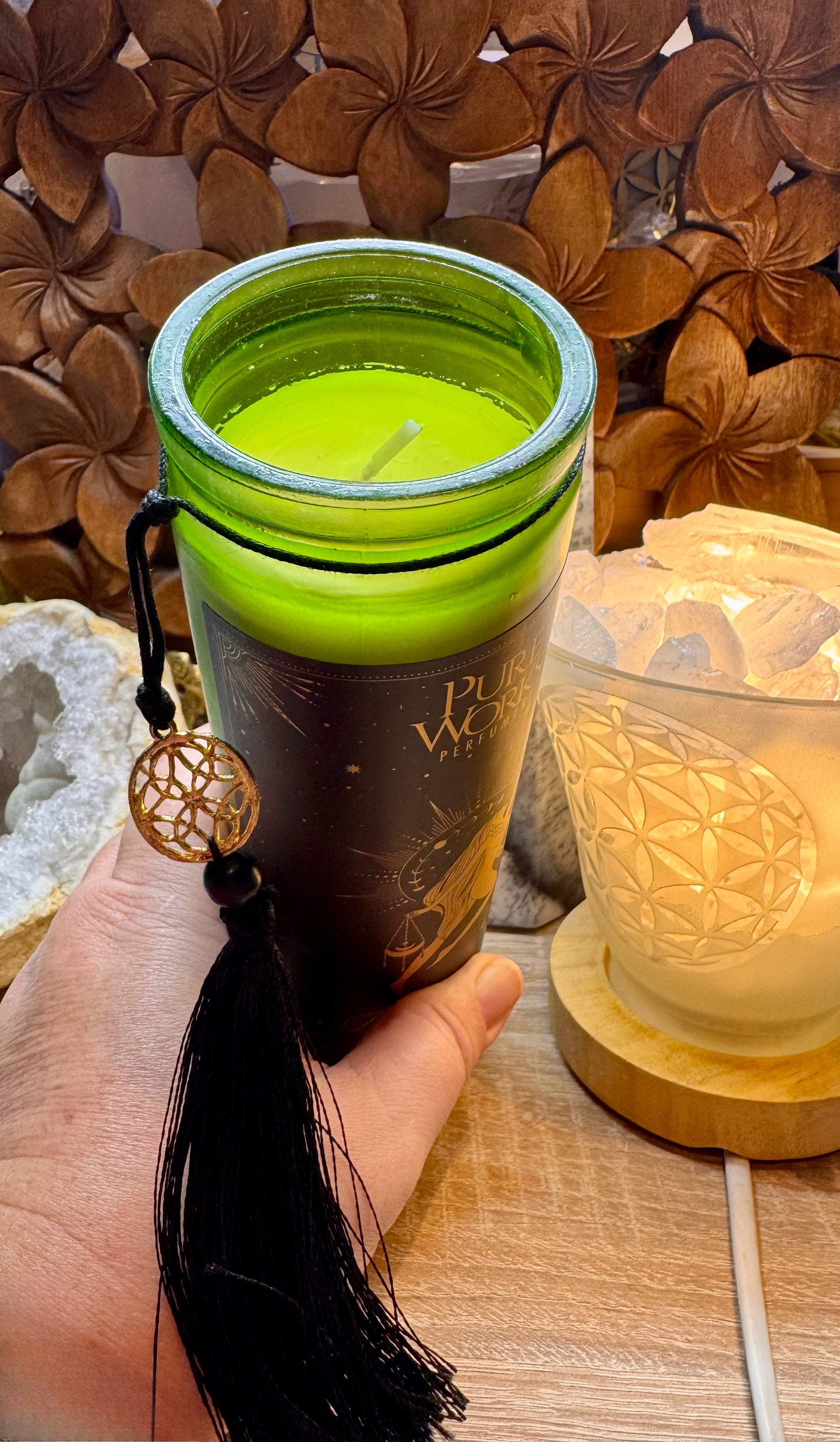 Bougie d'intention brillante dans un grand pot en verre coloré, coulée à la main à partir de cire de soja et de palme sans toxines.