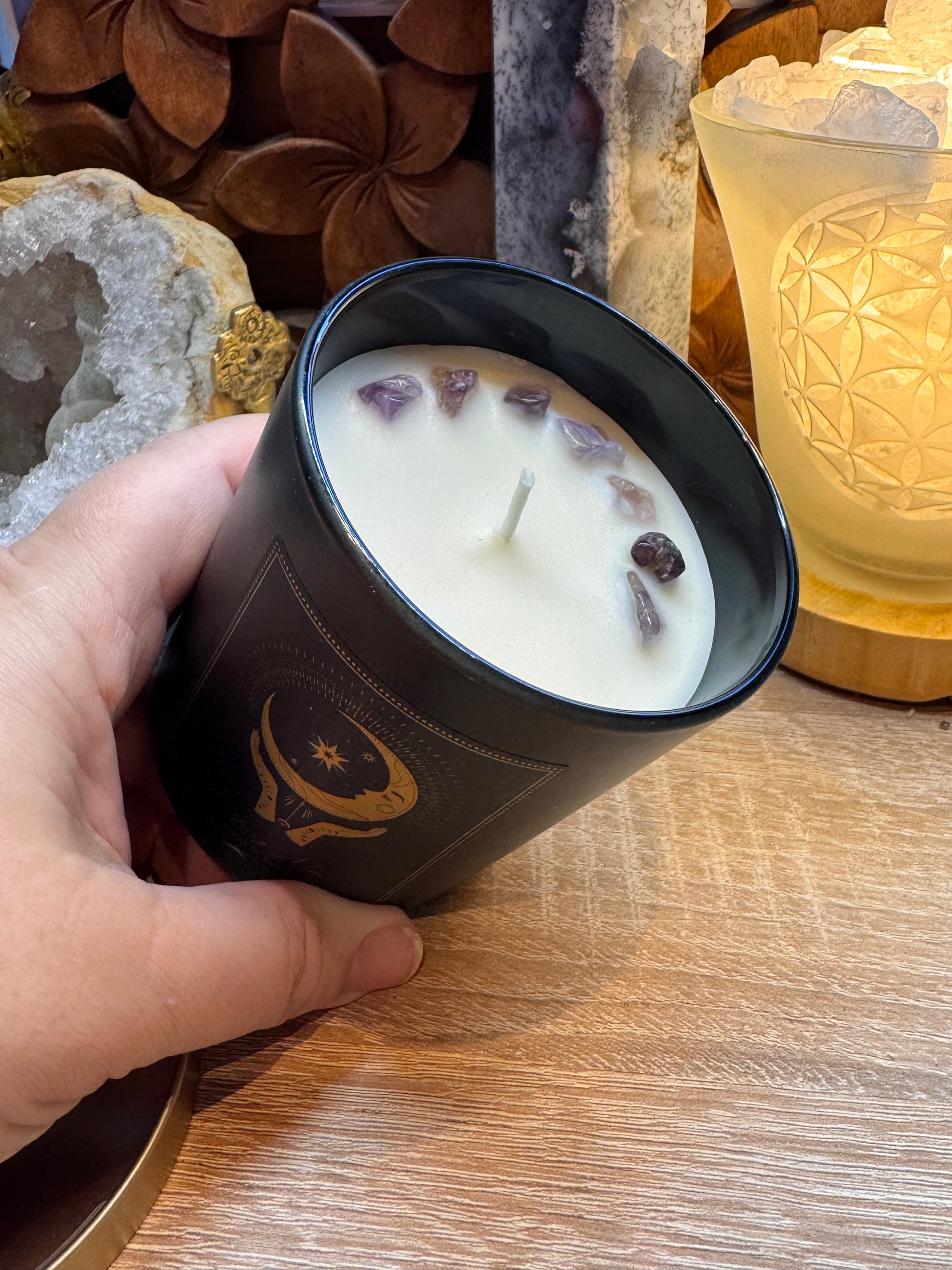 Bougie d'intention brillante en verre, coulée à la main à partir de cire de soja et de palme sans toxine.