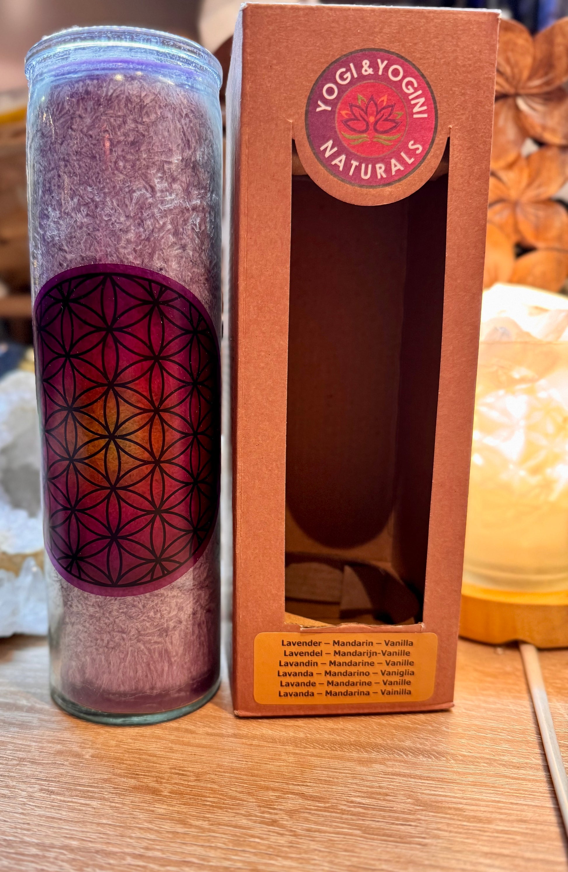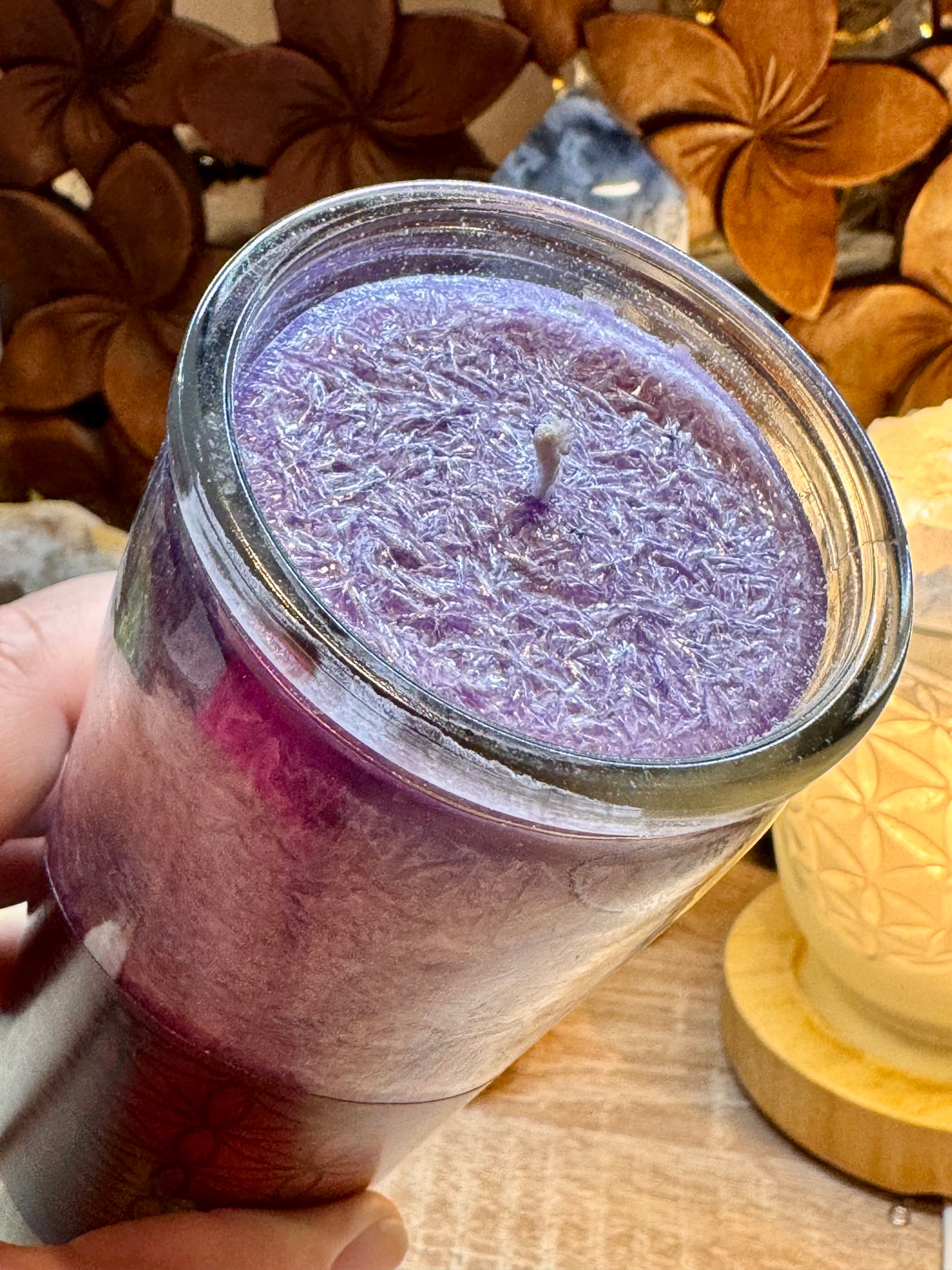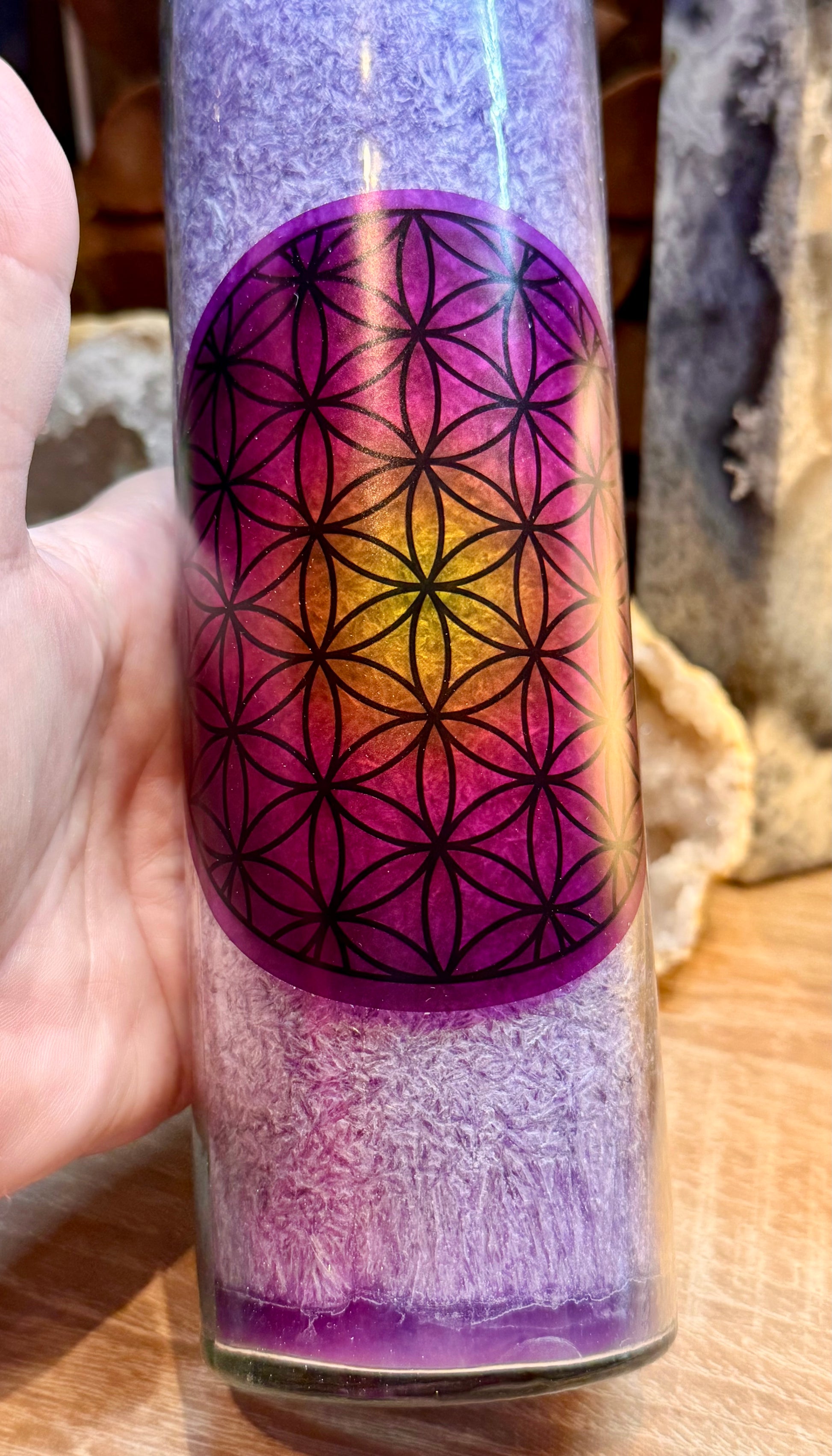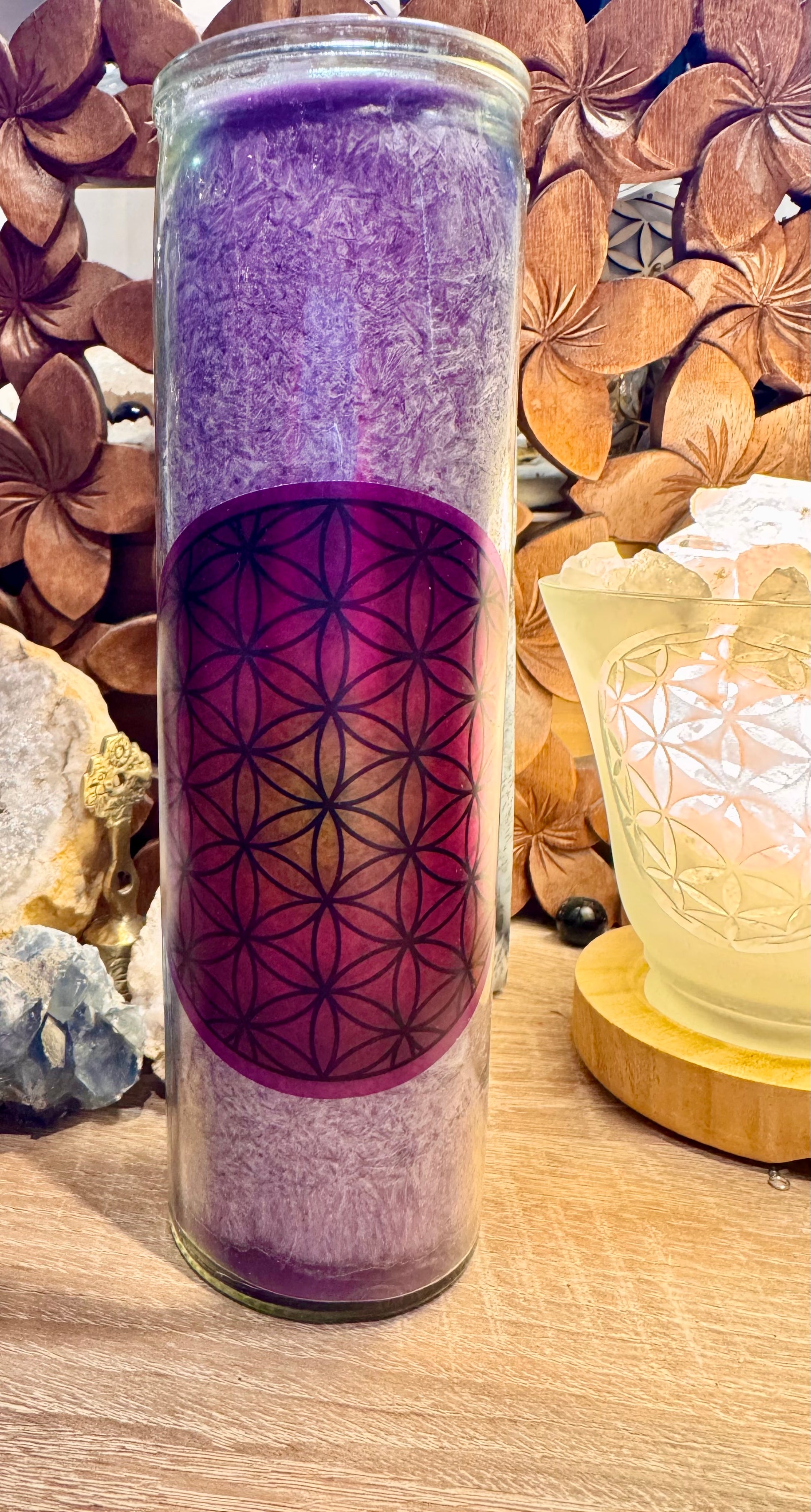 Bougie violette parfumée de stéarine (huile de palme) en verre recyclé, avec symbole fleur de vie.