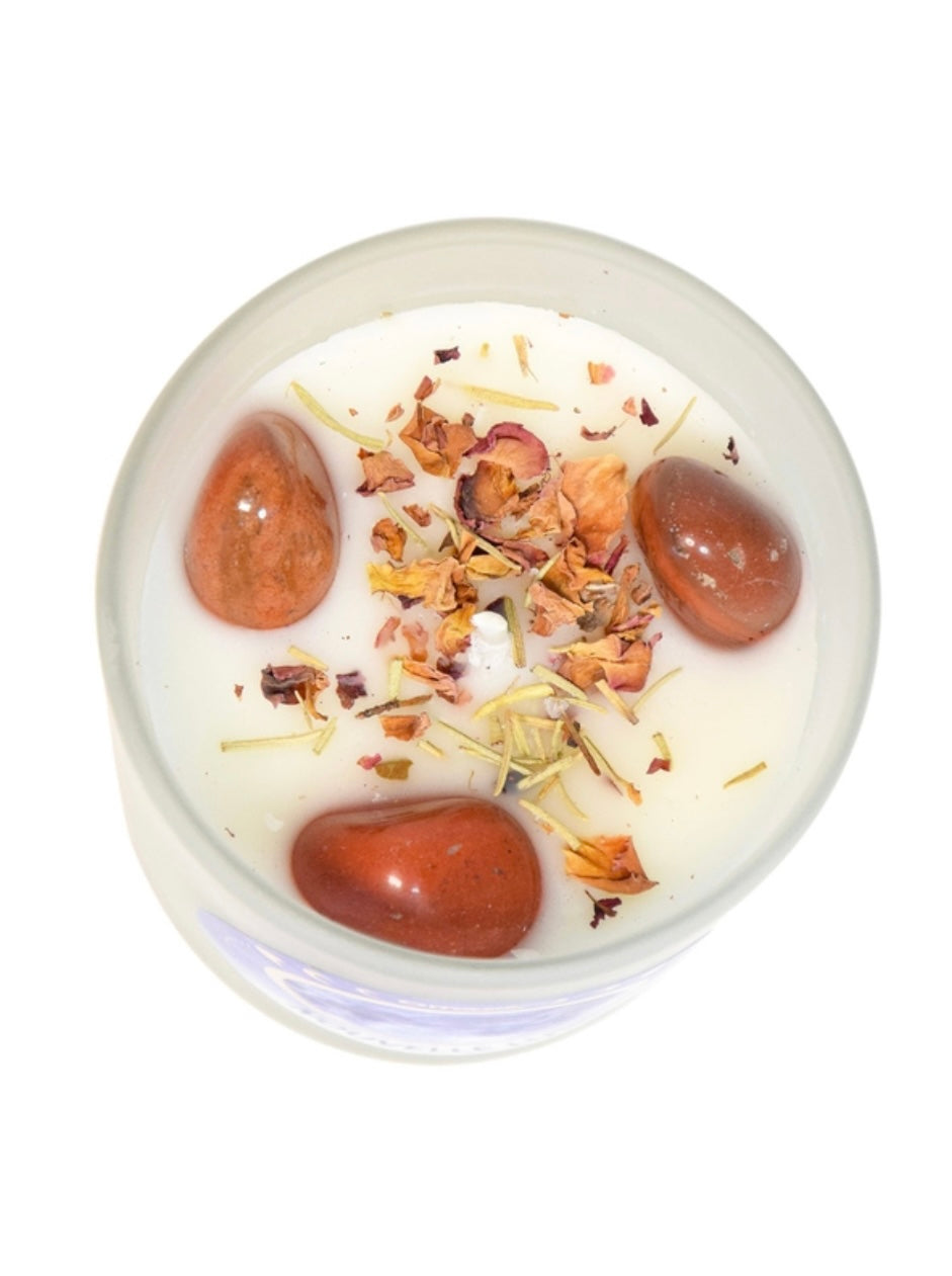 Bougie parfumée plantes et cristaux. Pour vous permettre de créer une atmosphère olfactive idéale pour vous accompagner lors du passage à un nouveau cycle de Lune, nous avons imaginé cette bougie parfumée. Les notes rayonnantes et vitaminées de la bergamote et de la mandarine mêlées à un cœur fleuri jasmin mimosa laissent place à un fond enveloppant et boisé de patchouli et de vétiver. Ornée romarin séché, de pétales de rose et de cristaux de jaspe rouge, pierre de courage, cette bougie saura vous faire bénéficier de ses vertus énergisantes, propices à l’affirmation de soi et au renouveau.