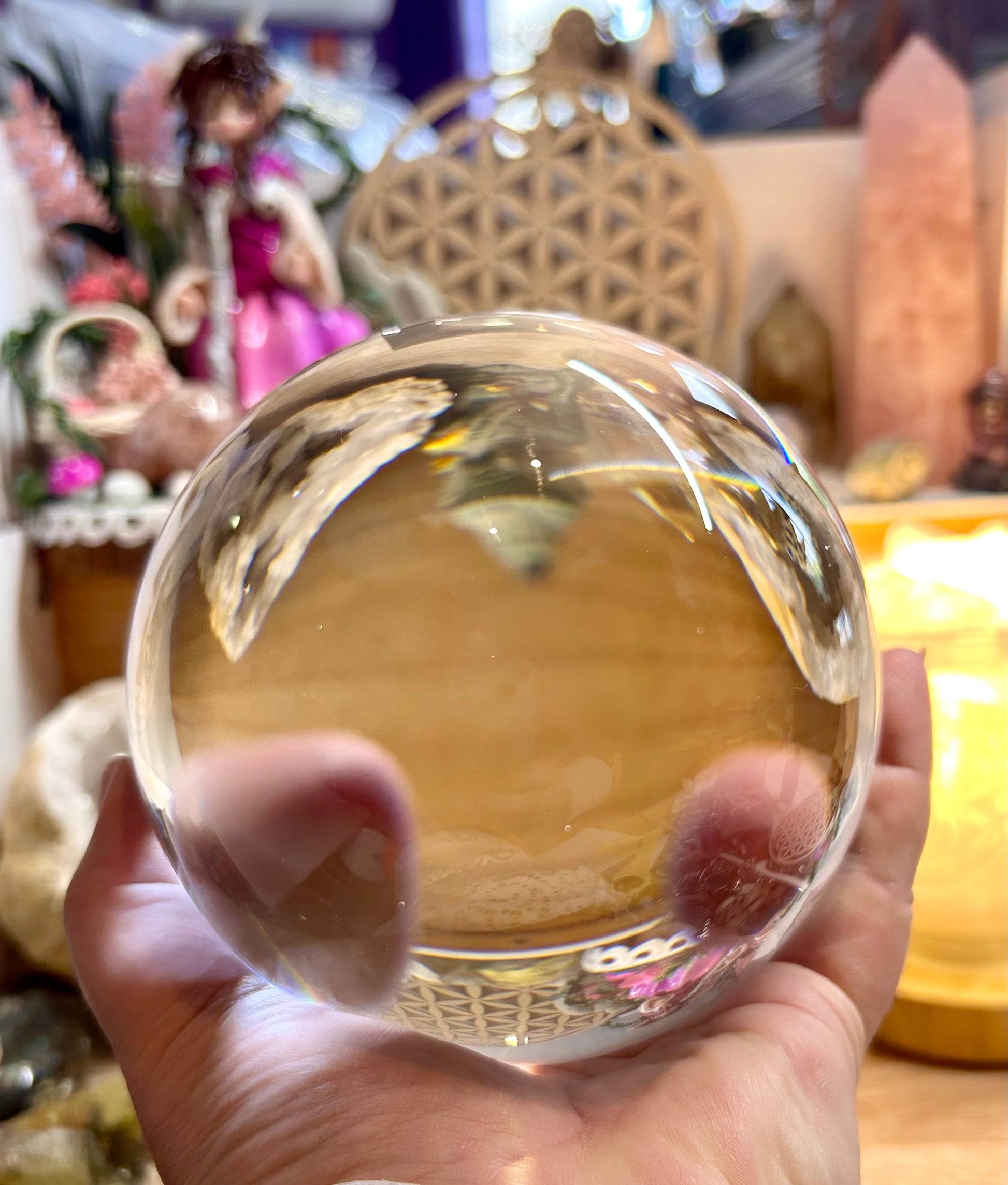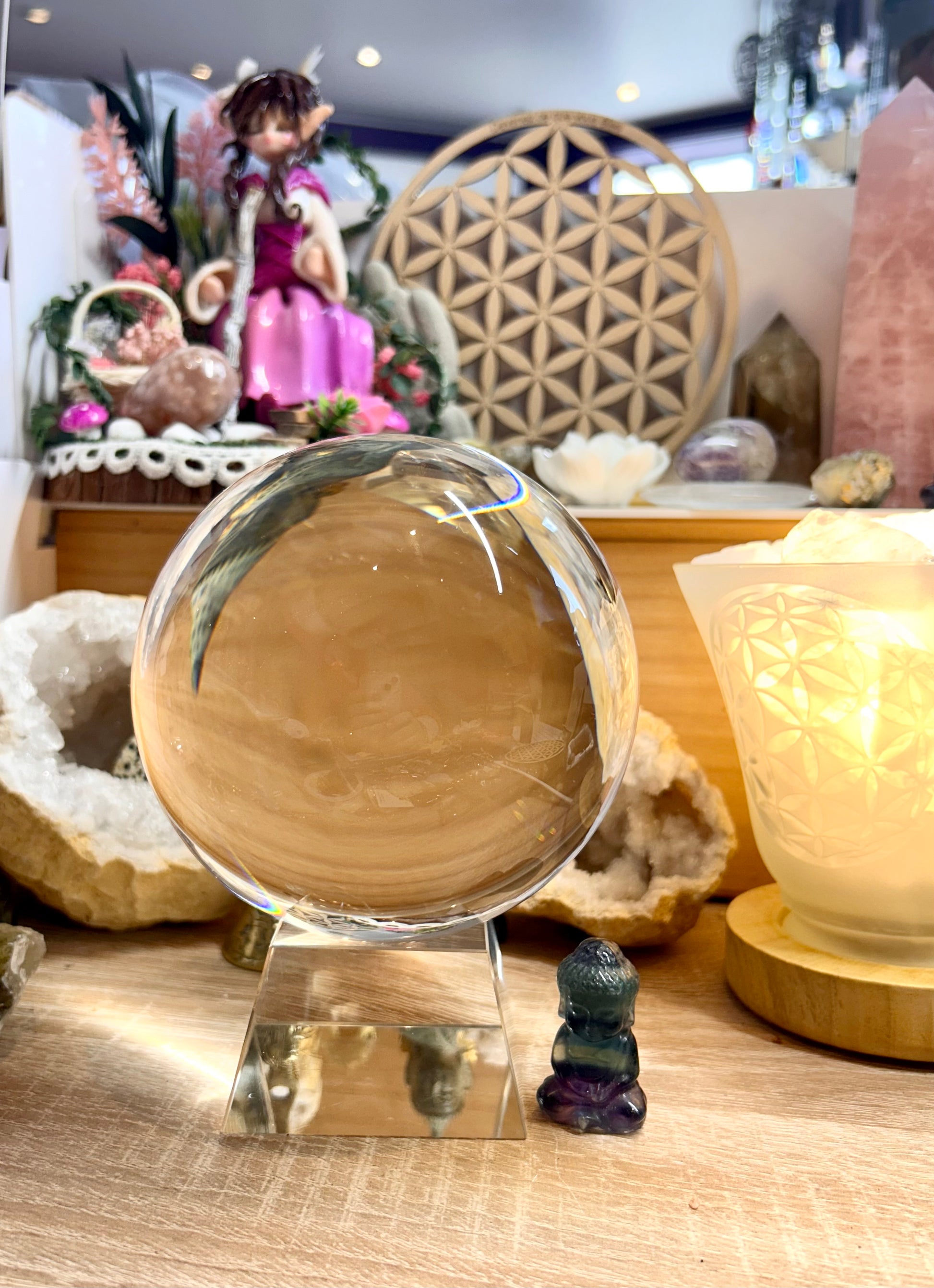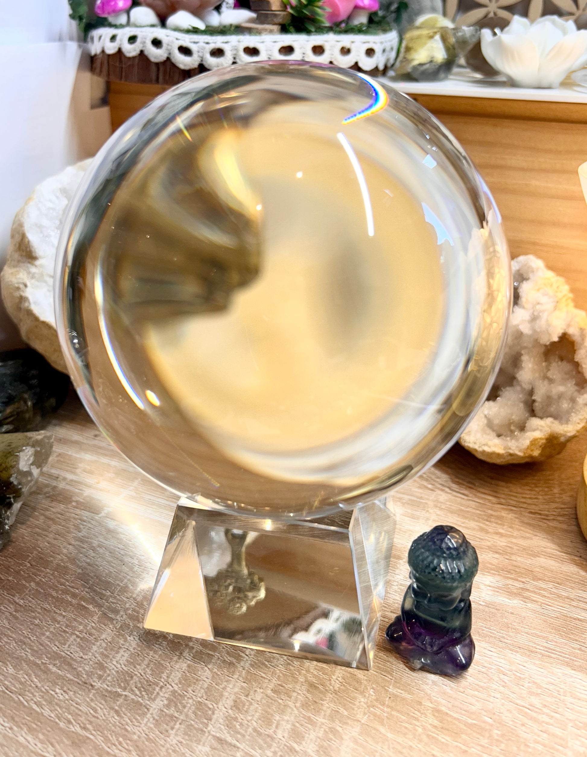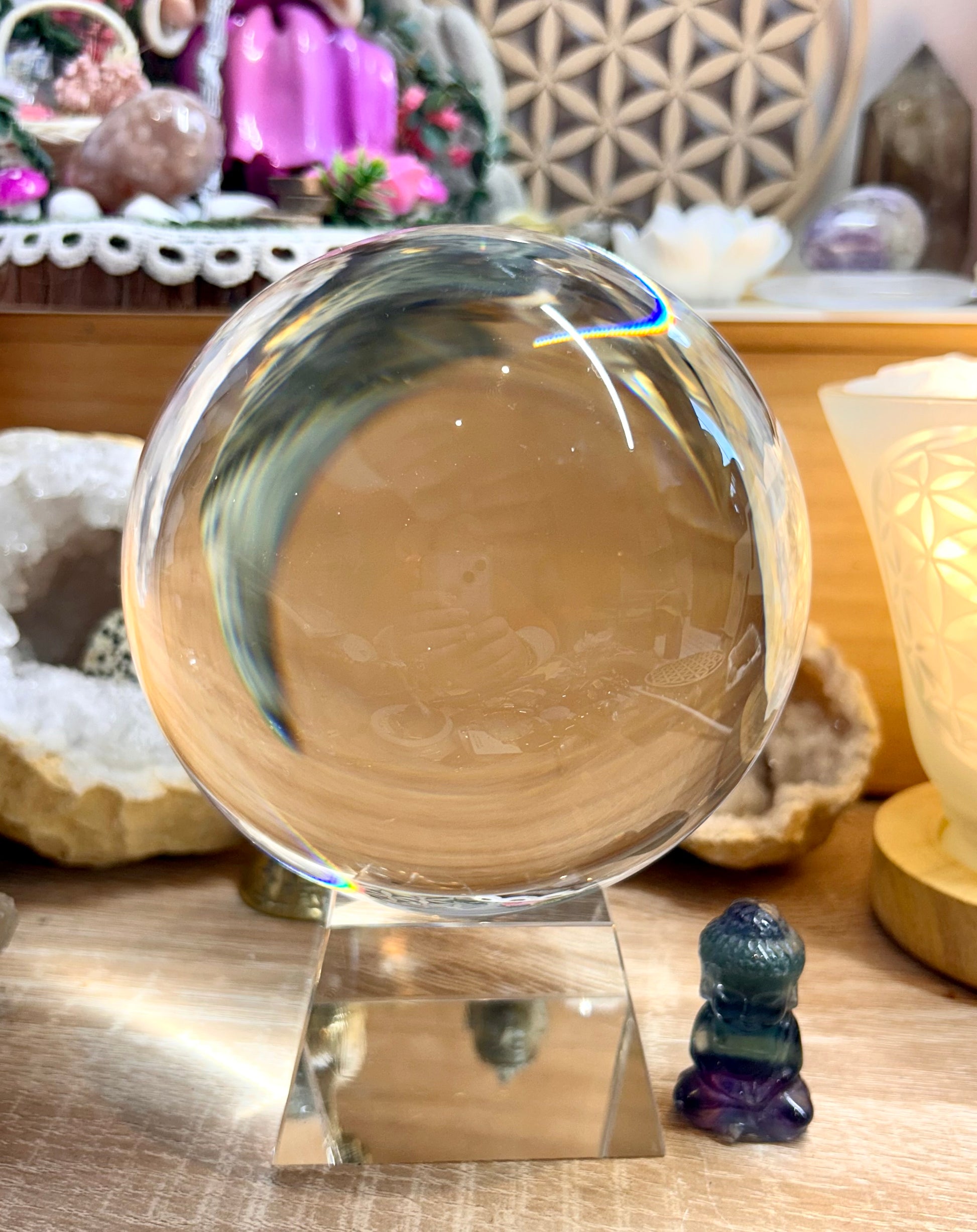 Sphère avec support, en verre cristal de qualité K9 (verre au plomb) avec une clarté optique élevée.