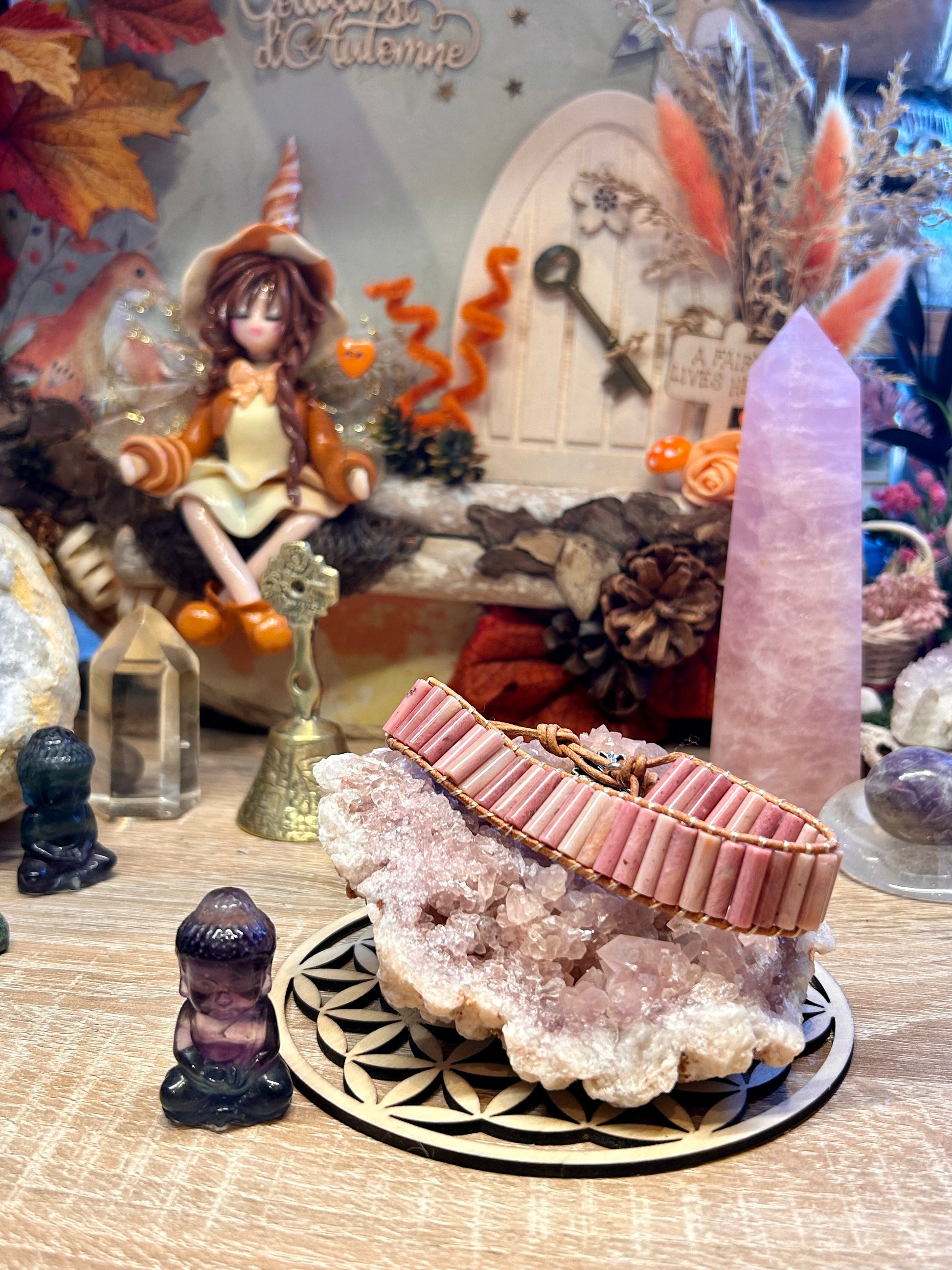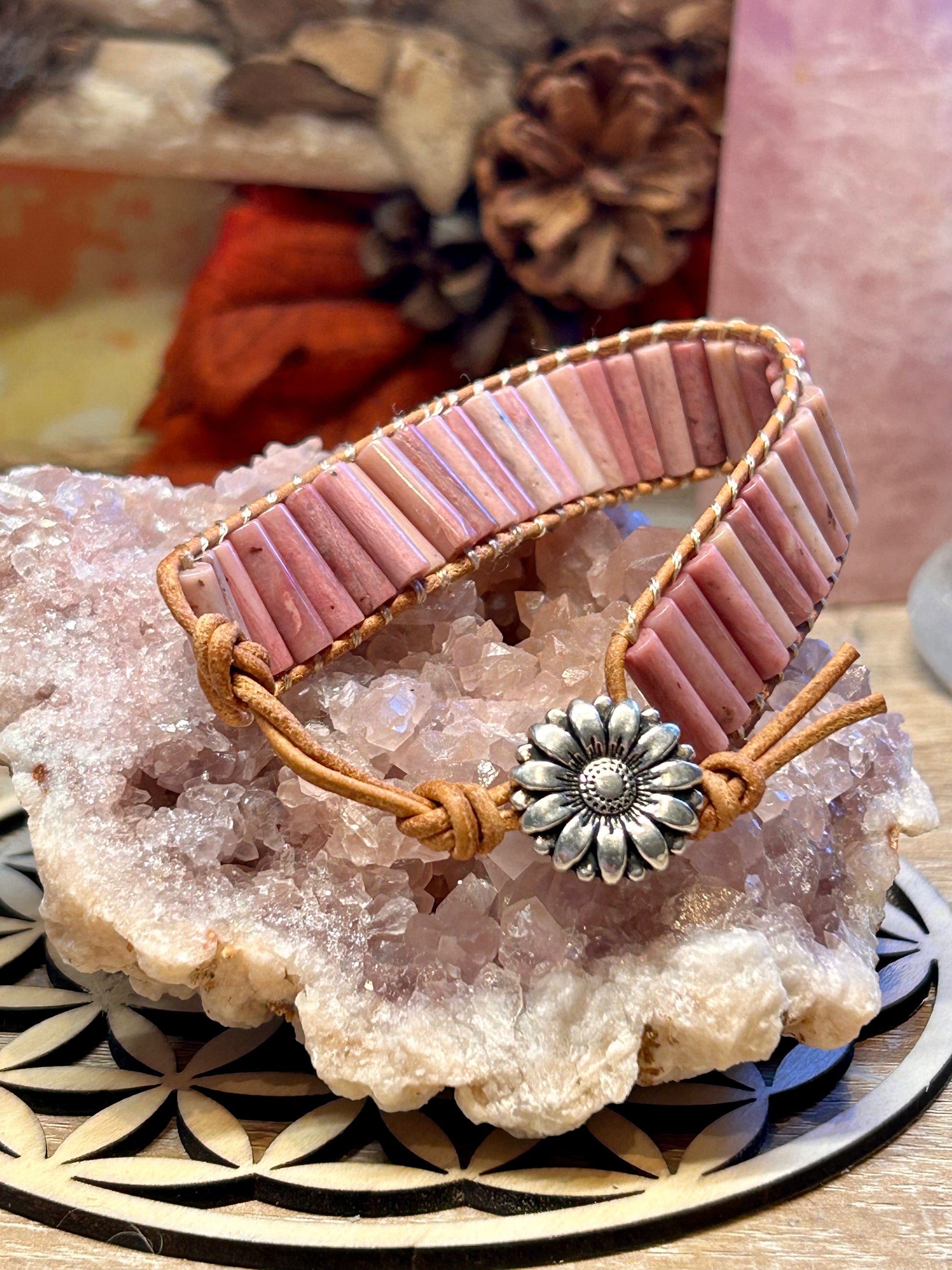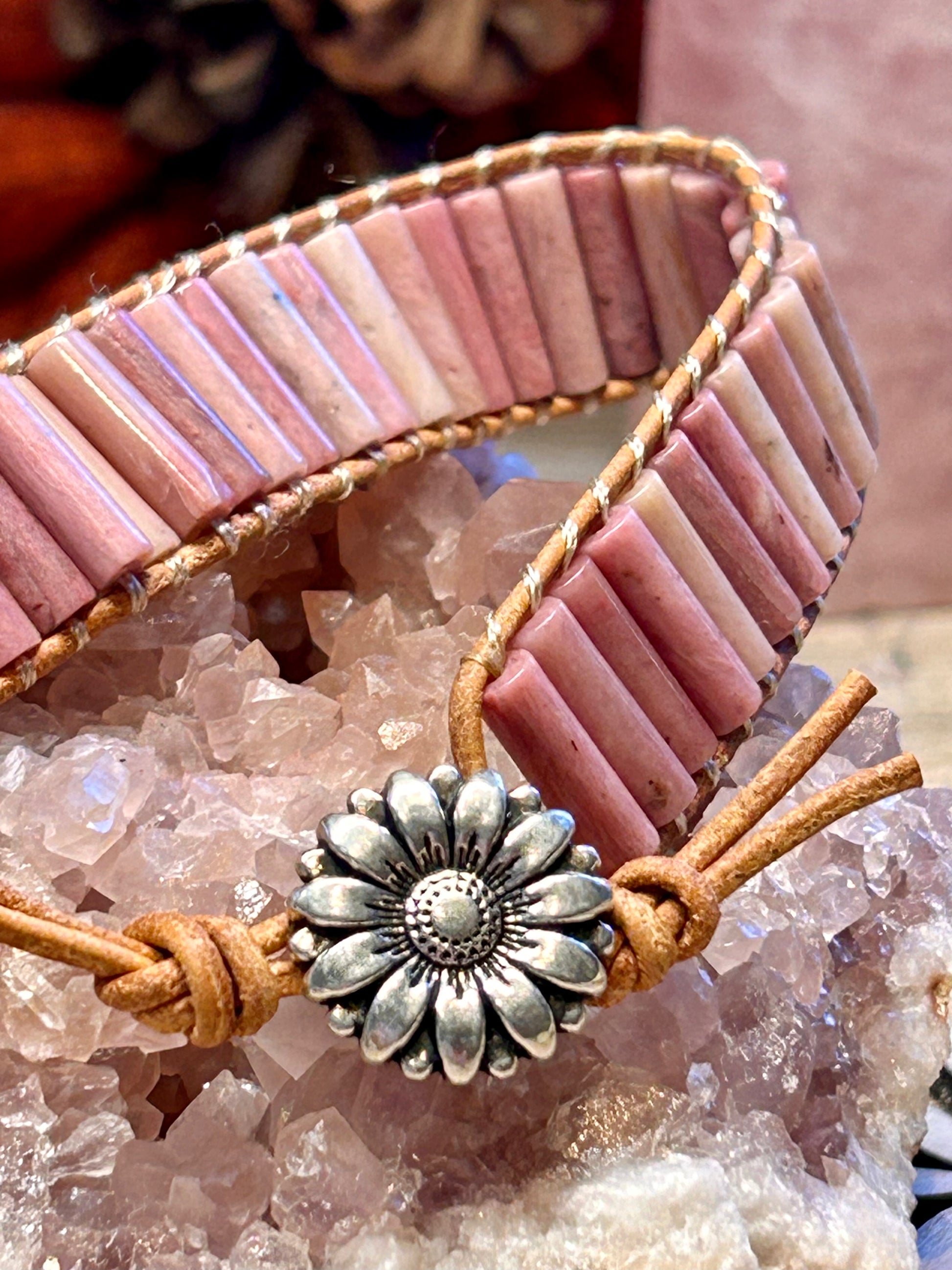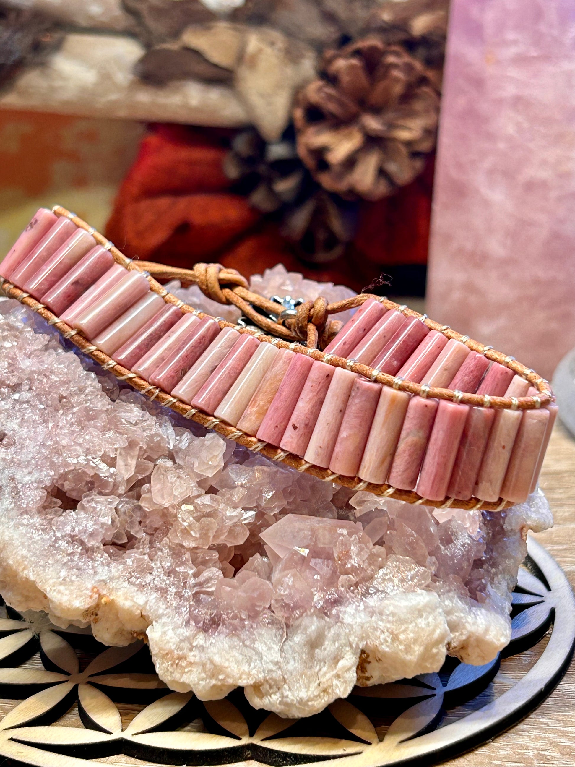 Bracelet cuir avec tubes de rhodonite