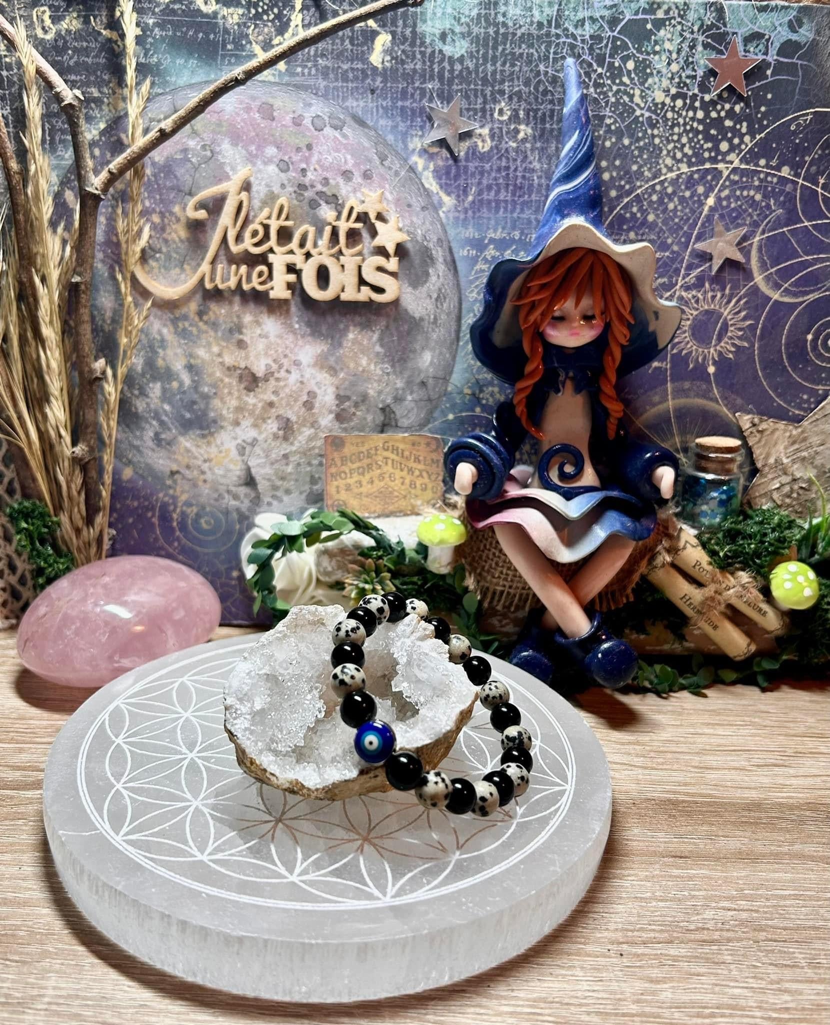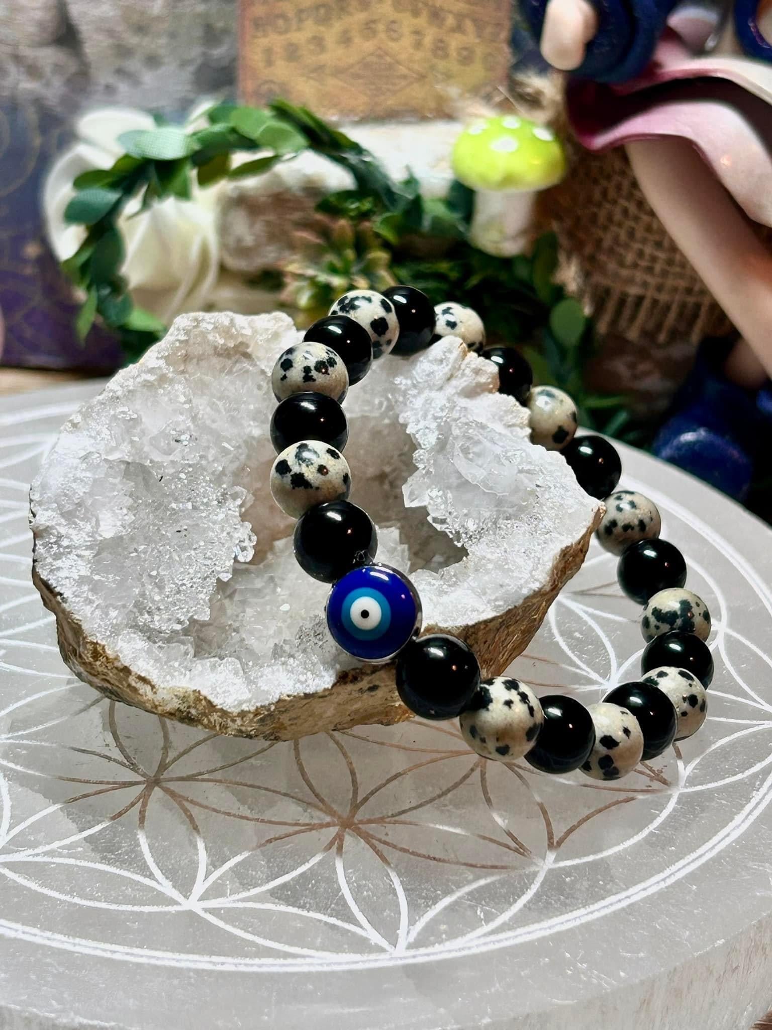 Bracelet de protection œil bleu avec pierre d’obsidienne noire et jaspe dalmatien