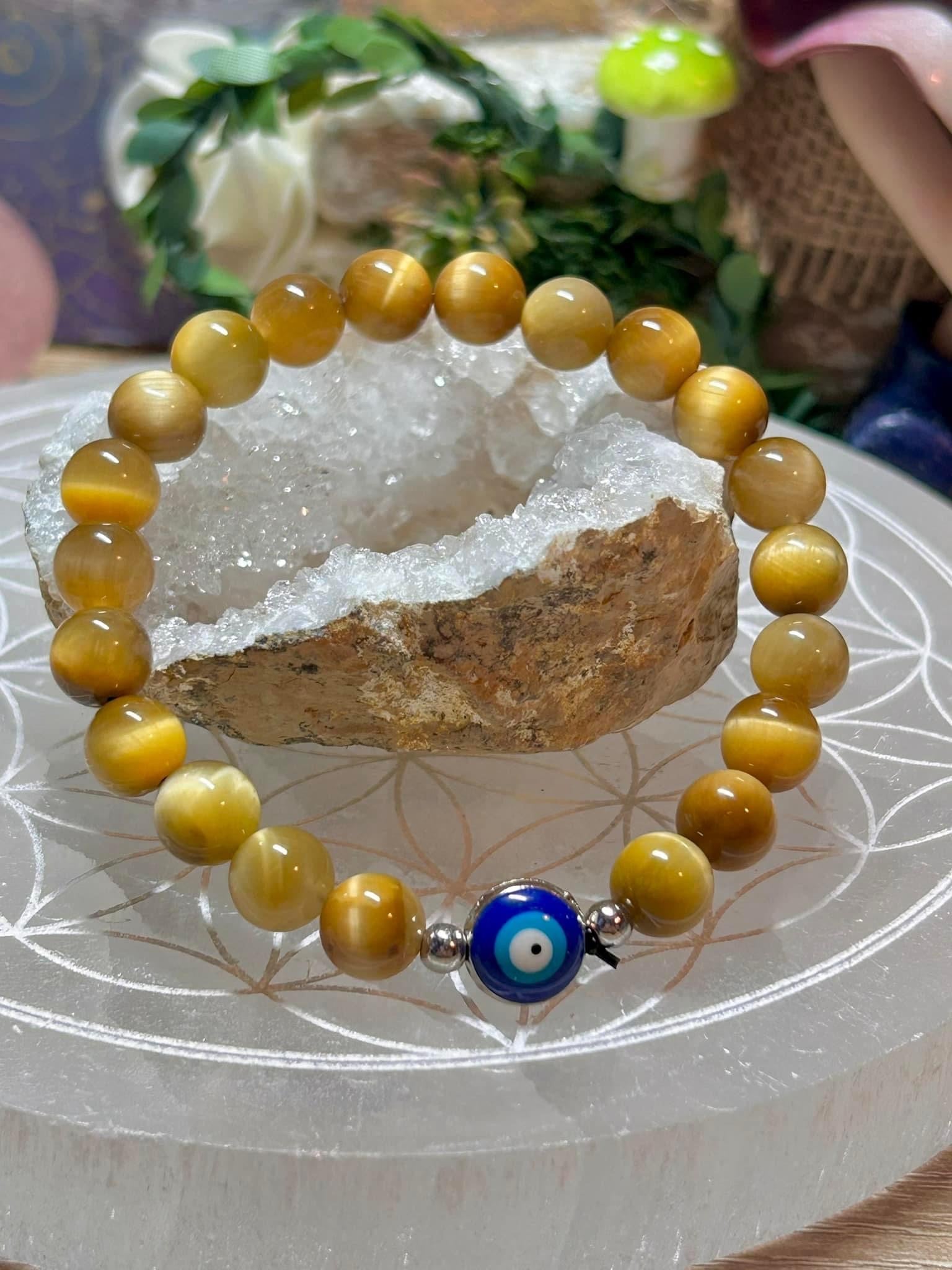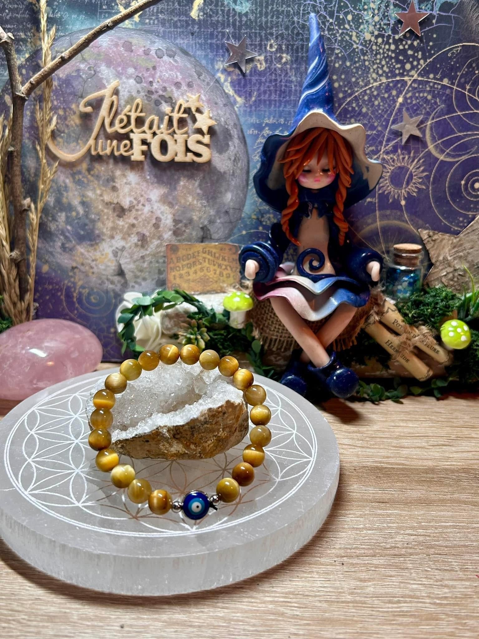 Bracelet de protection en œil de tigre doré avec l’œil bleu