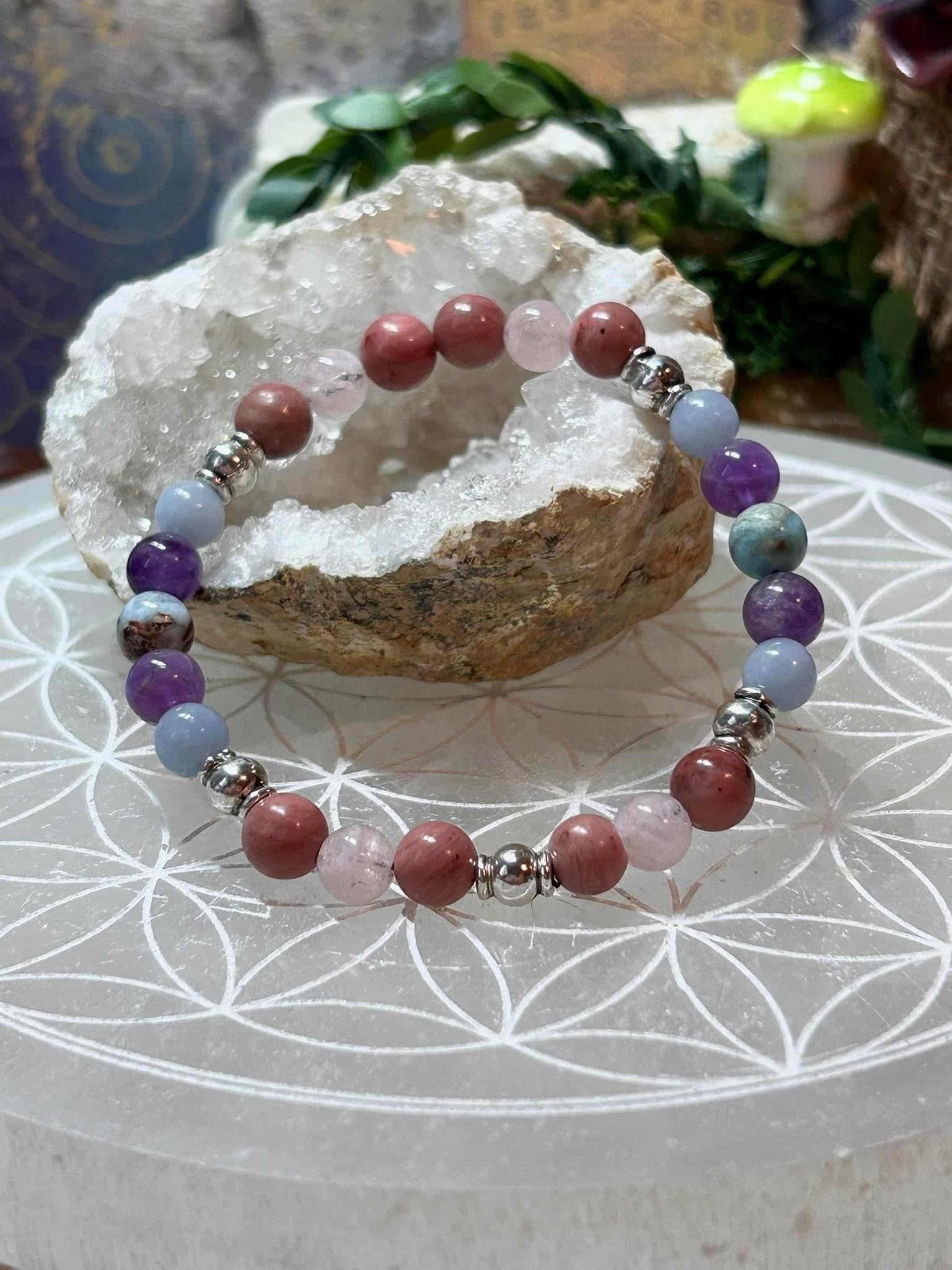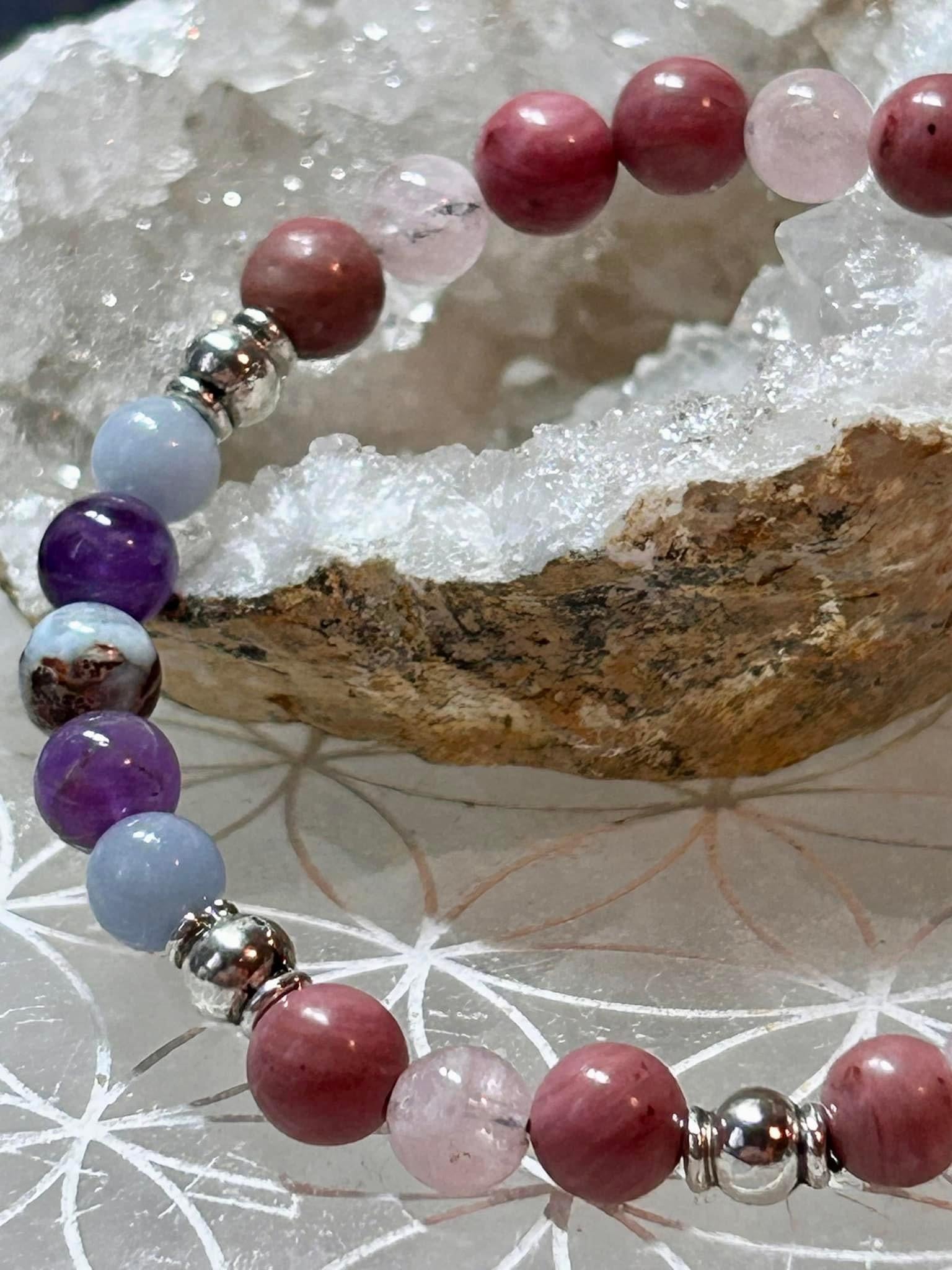 Morganite, Rhodonite, Angélite, Améthyste et Larimar
