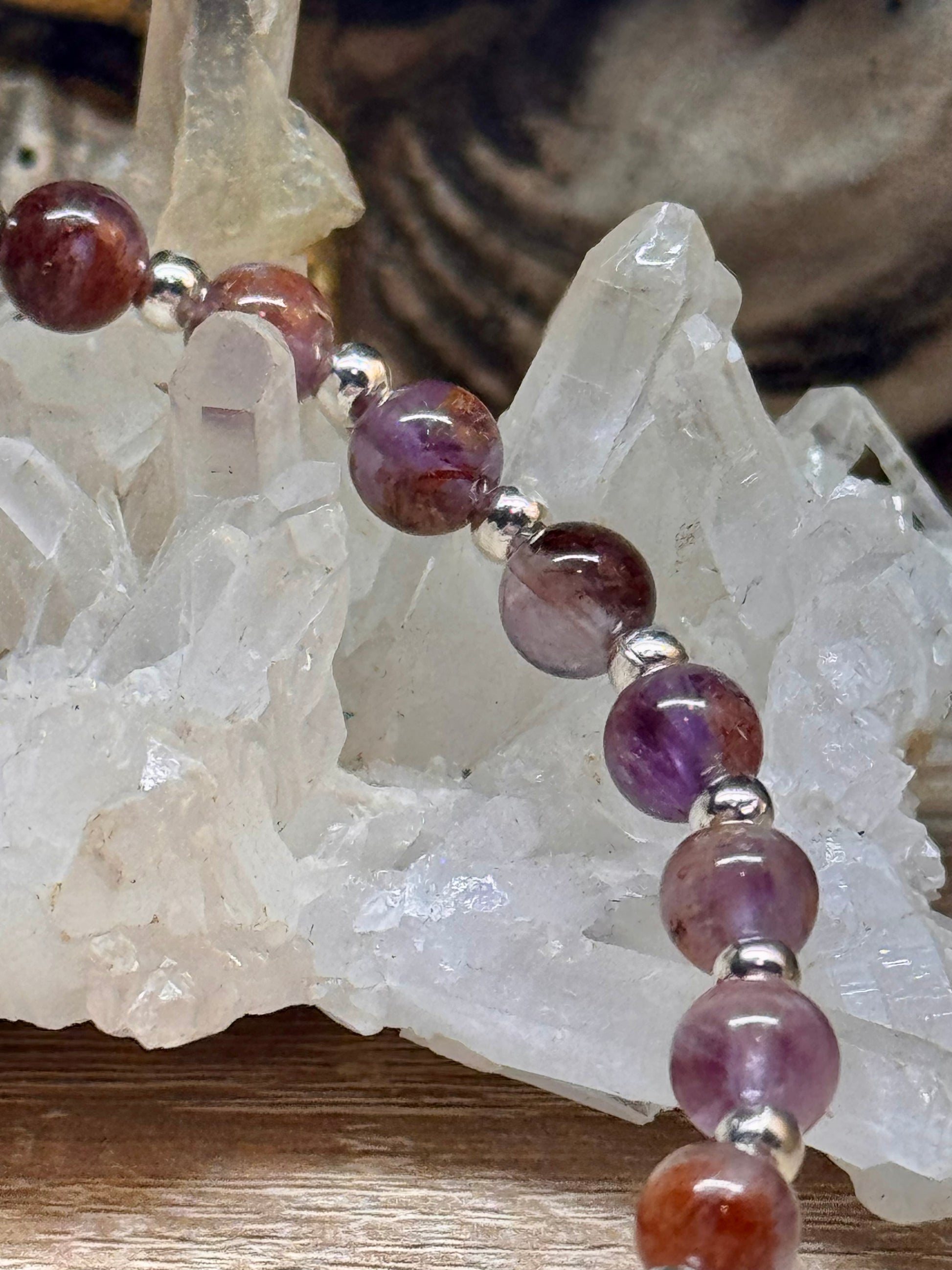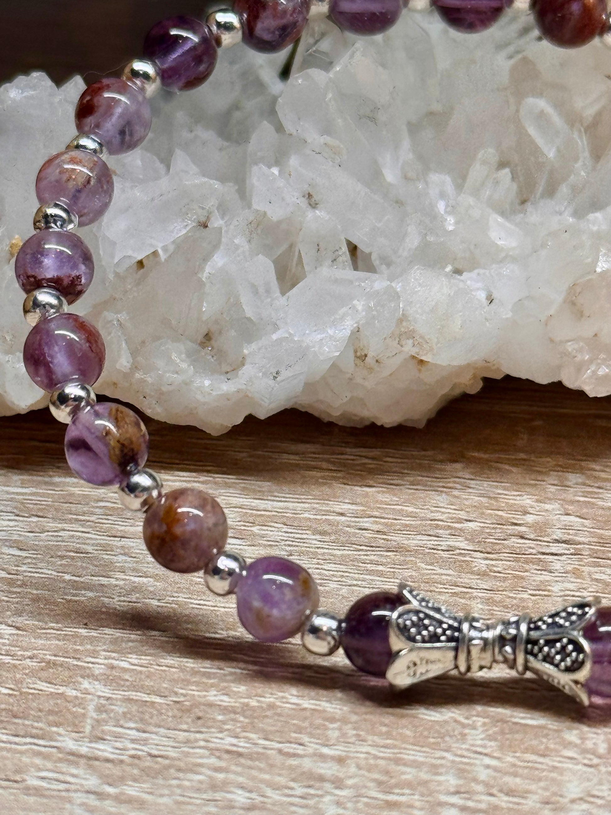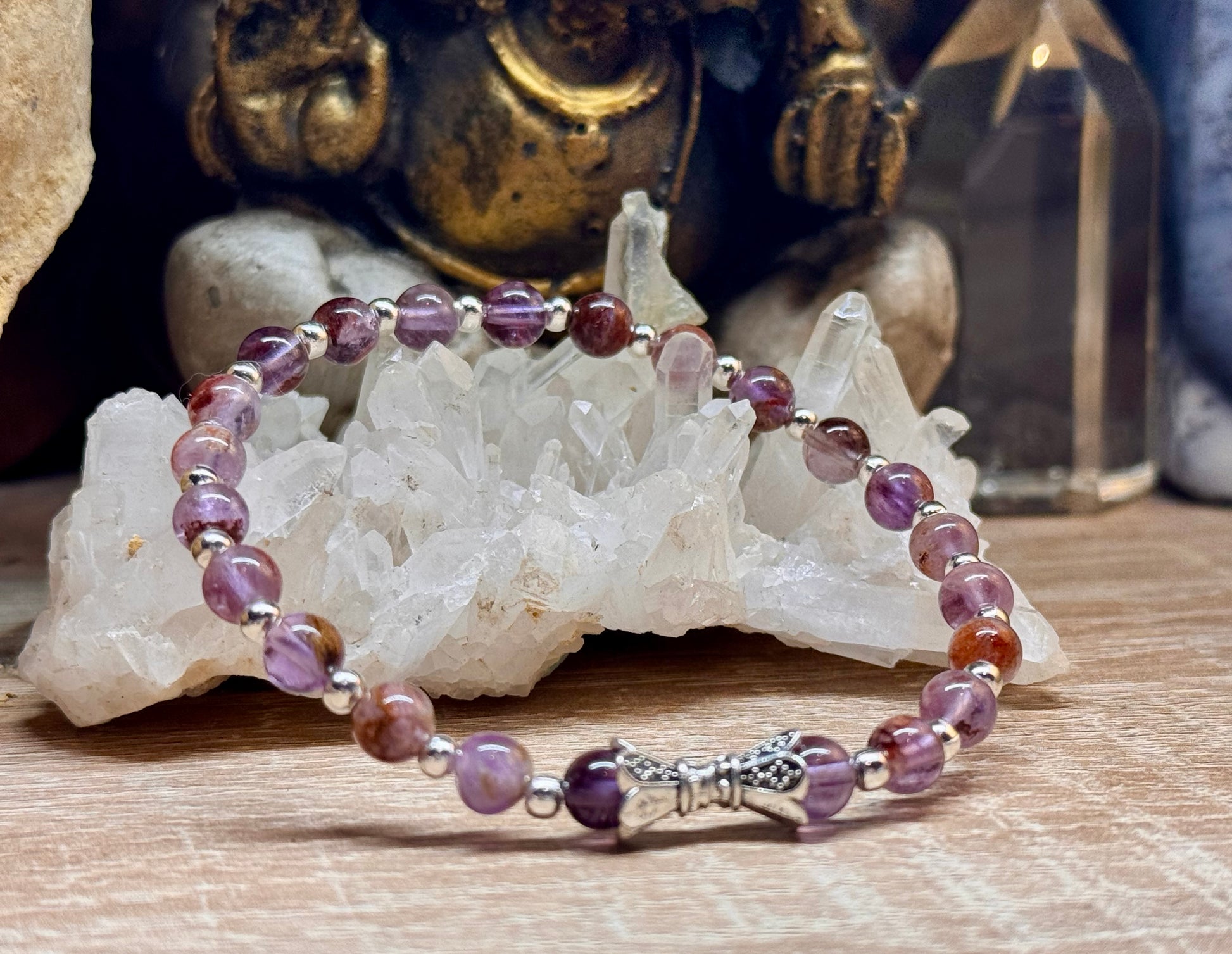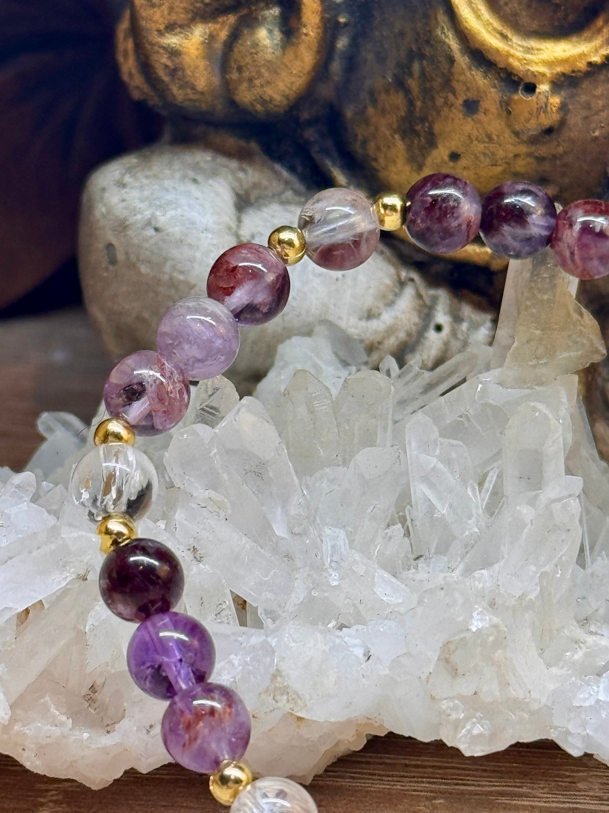 La Cacoxénite ou super seven (nom commercial) se retrouve très souvent en inclusions dans le cœur des gisements d’améthyste. Elle contient de l’améthyste, du cristal, du quartz fumé, de la cacoxénite, de la lepidocrocite, de la goethite et du quartz rutile.