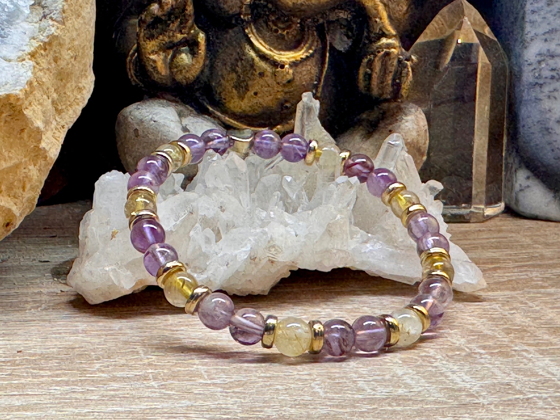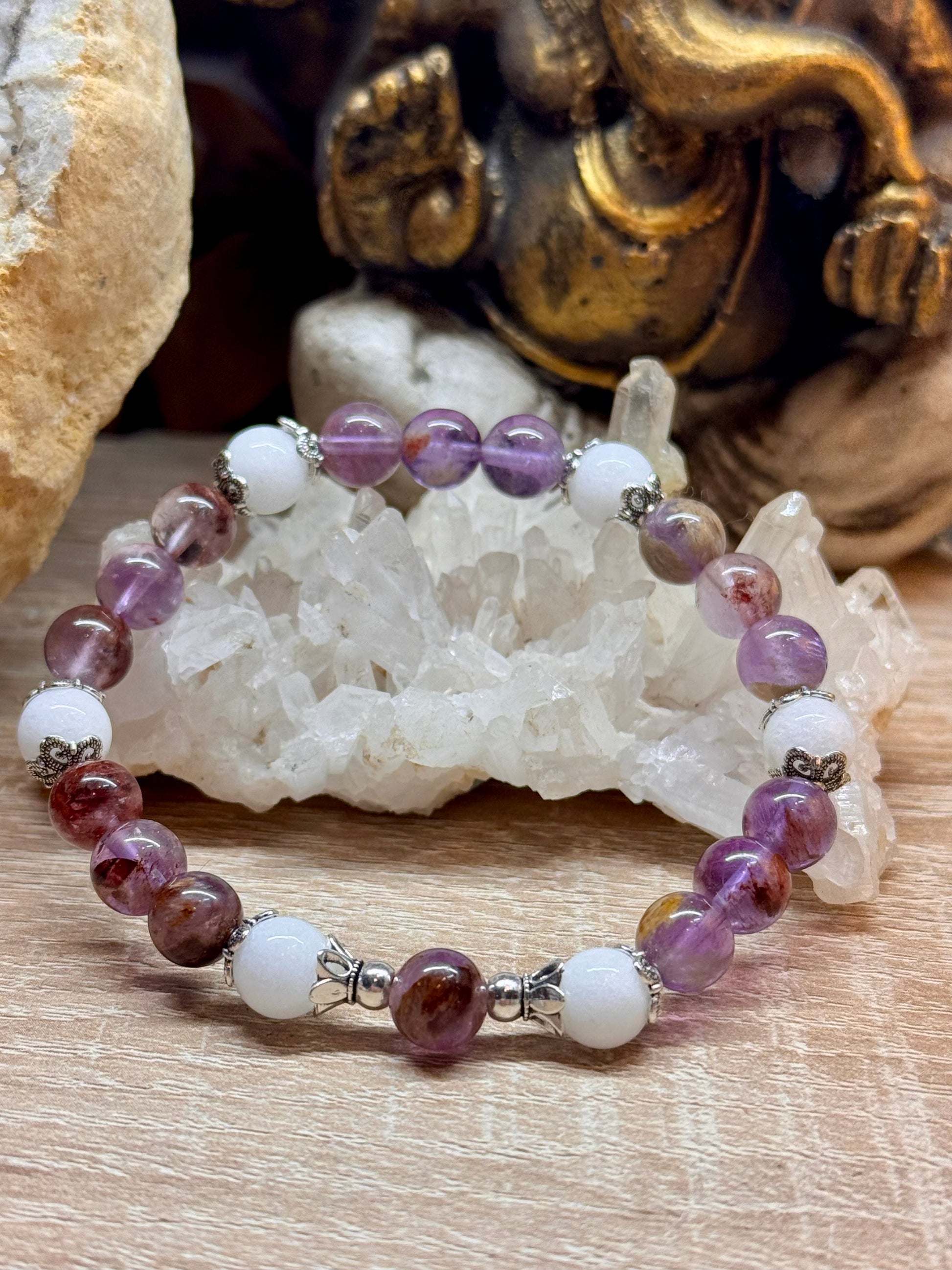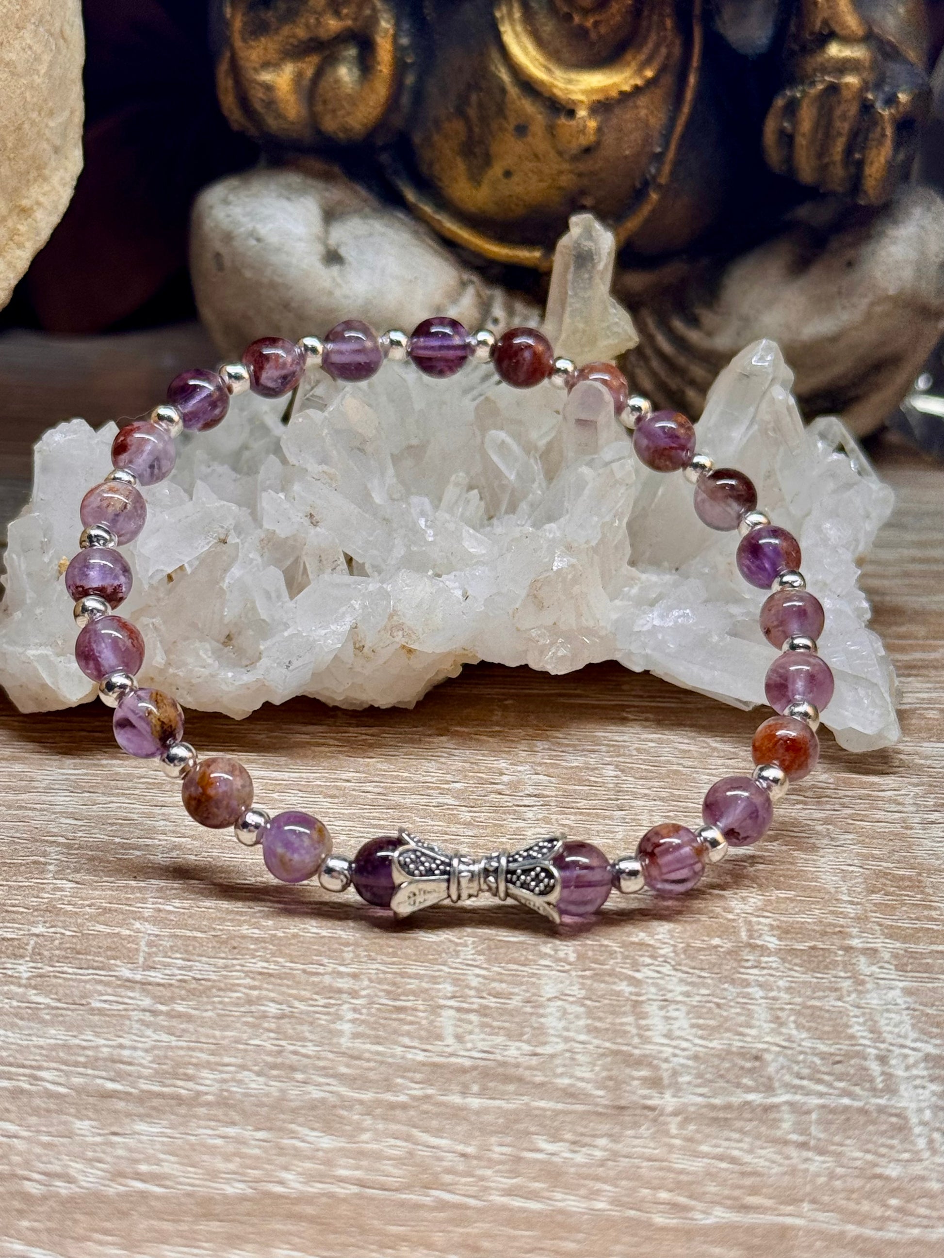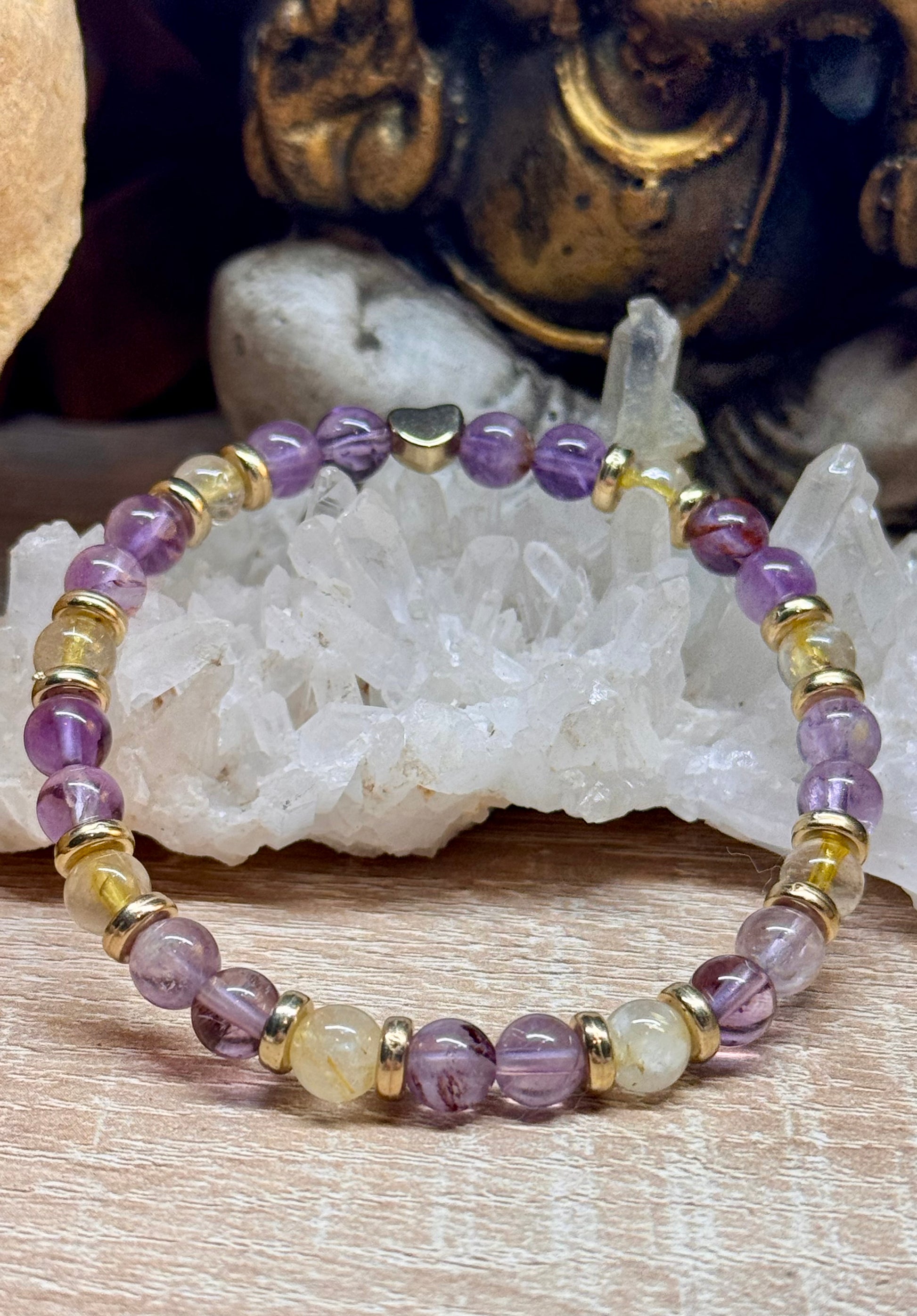 La Cacoxénite ou super seven (nom commercial) se retrouve très souvent en inclusions dans le cœur des gisements d’améthyste. Elle contient de l’améthyste, du cristal, du quartz fumé, de la cacoxénite, de la lepidocrocite, de la goethite et du quartz rutile.
