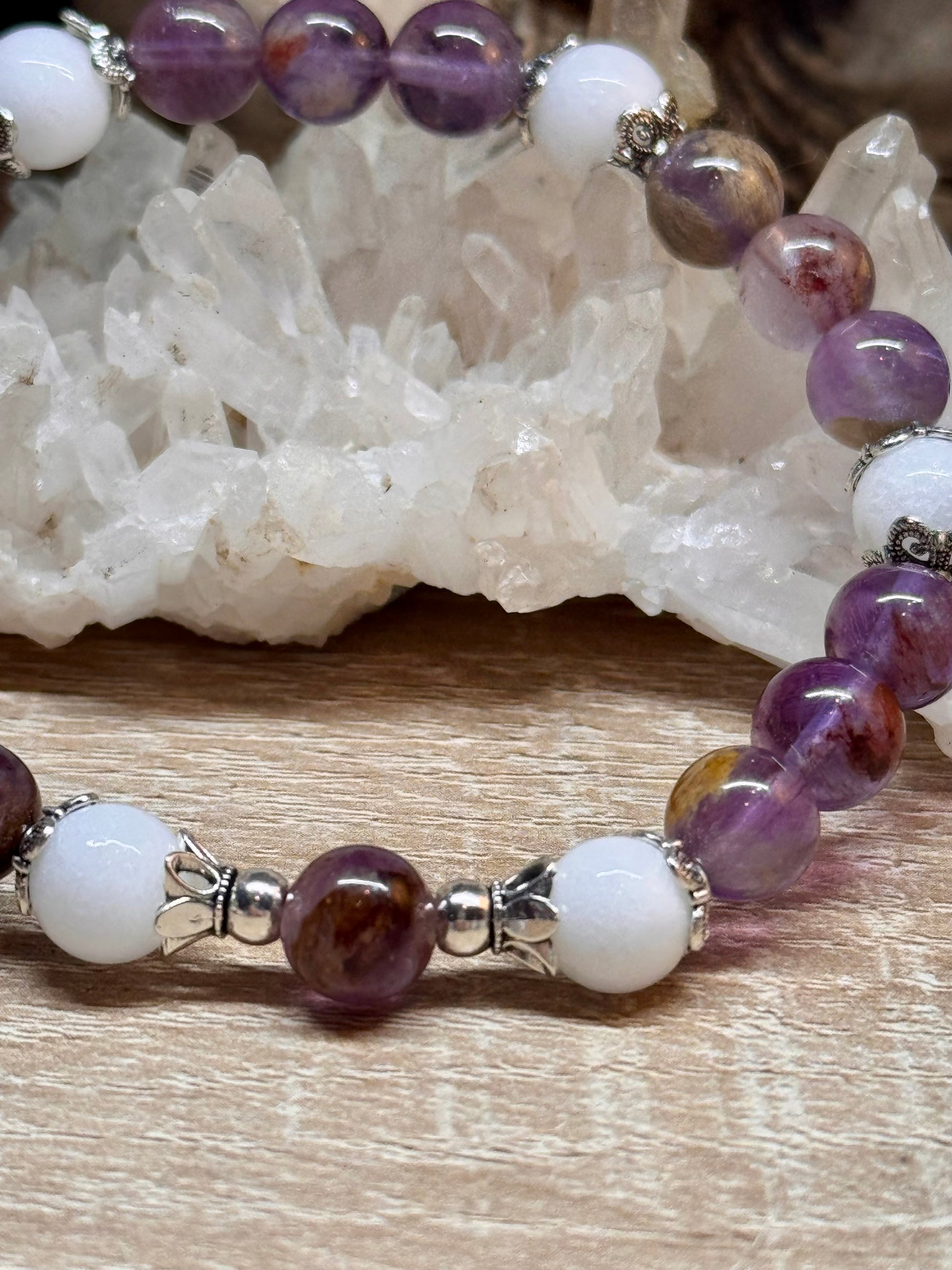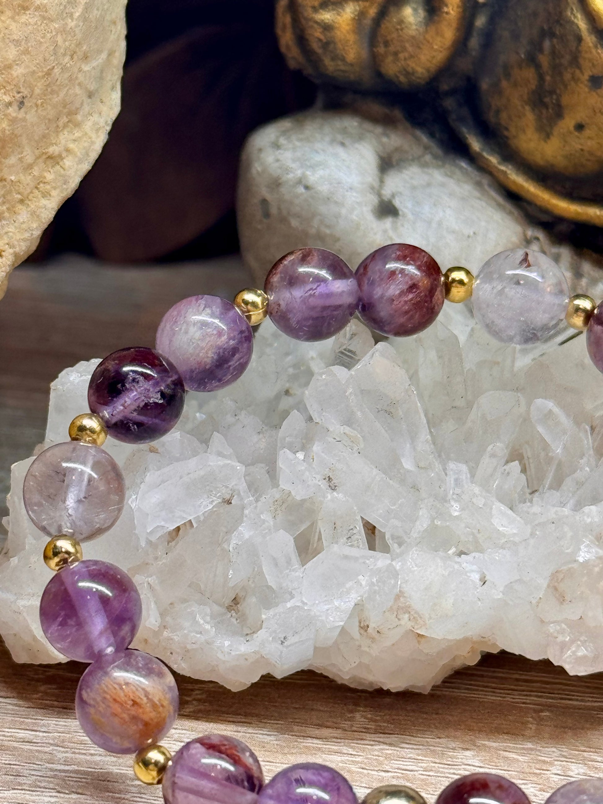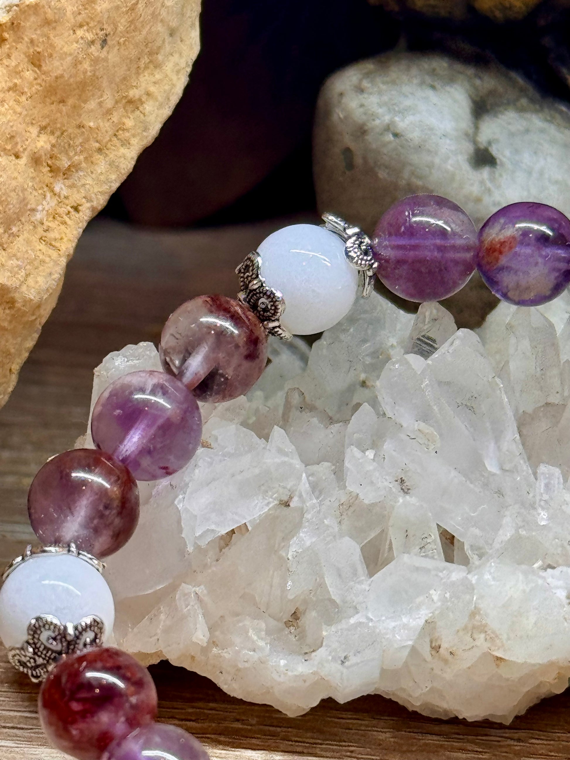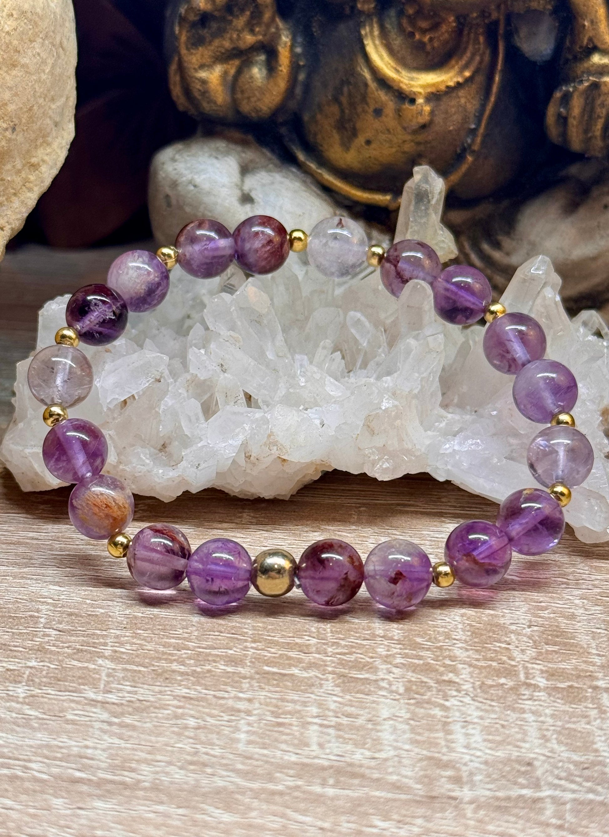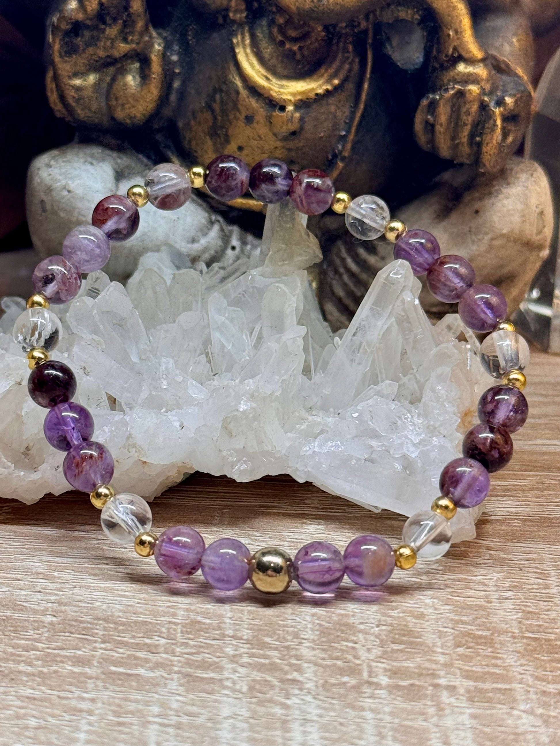 La Cacoxénite ou super seven (nom commercial) se retrouve très souvent en inclusions dans le cœur des gisements d’améthyste. Elle contient de l’améthyste, du cristal, du quartz fumé, de la cacoxénite, de la lepidocrocite, de la goethite et du quartz rutile.