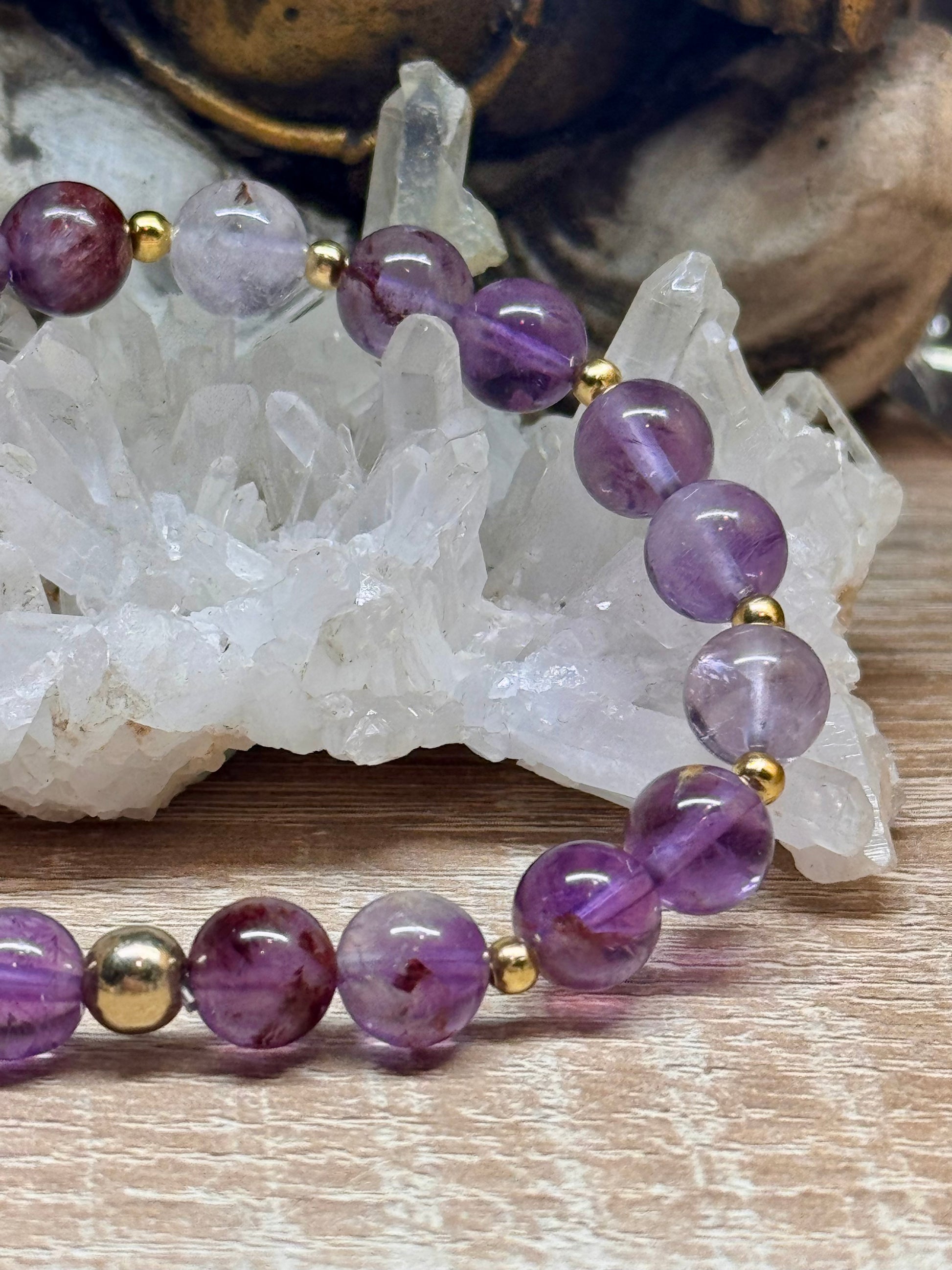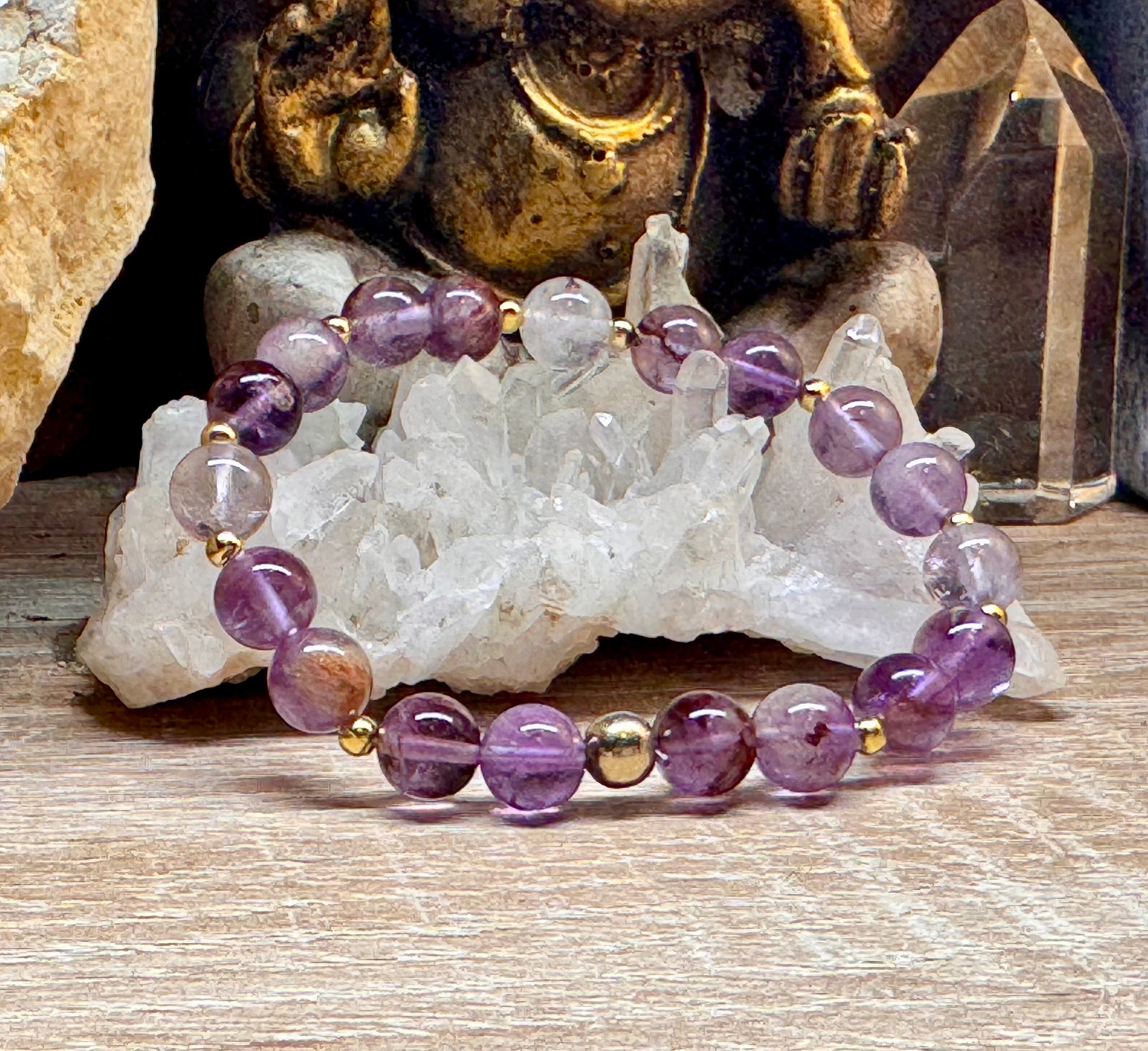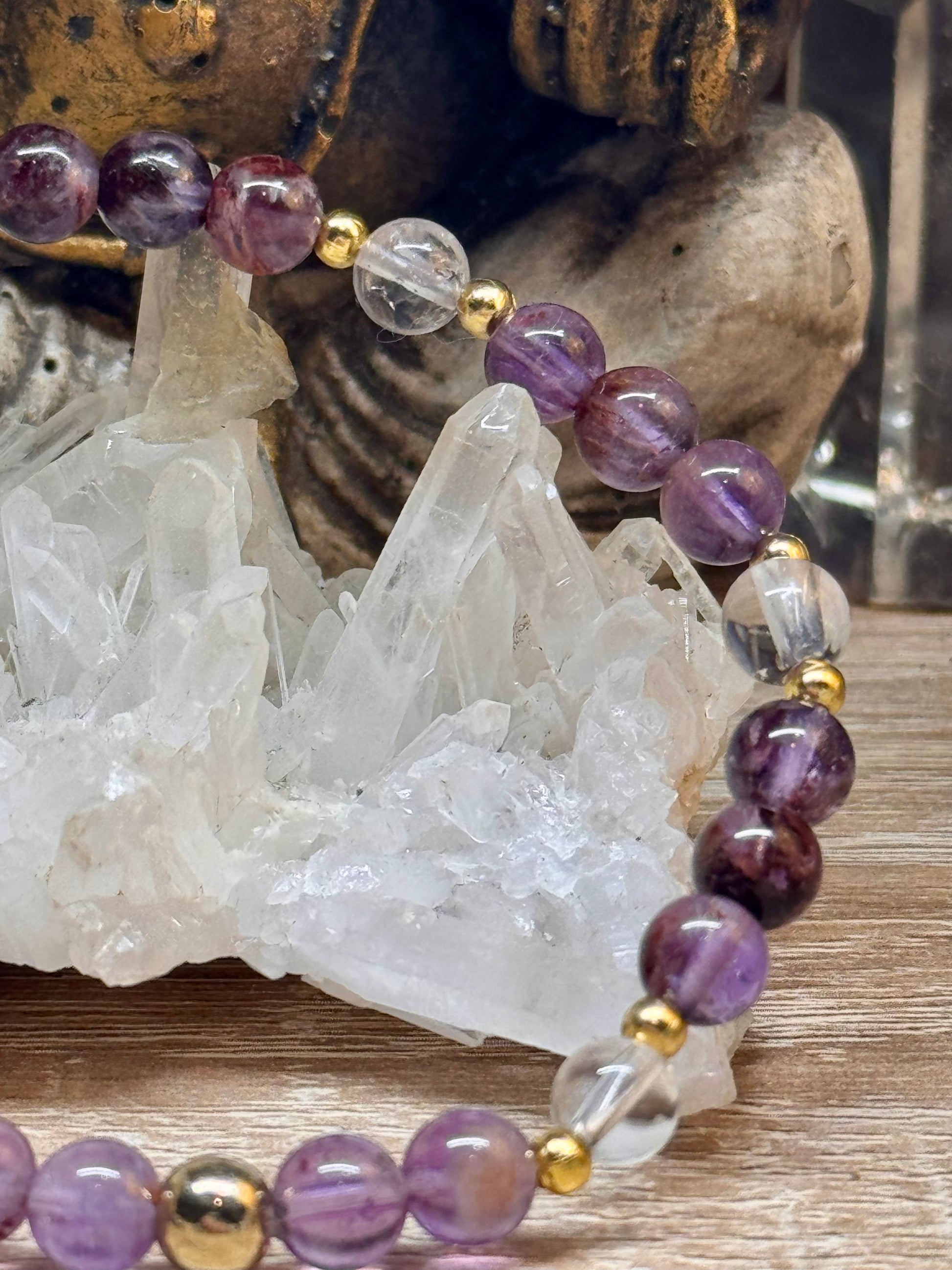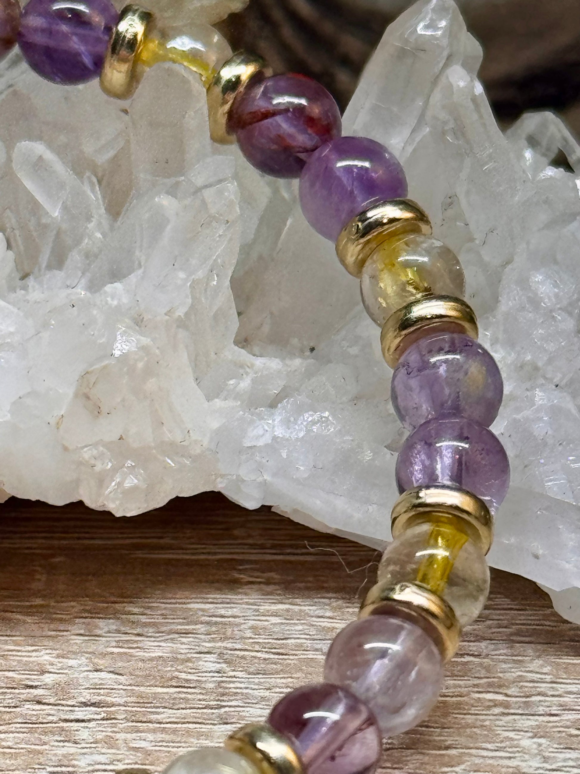 La Cacoxénite ou super seven (nom commercial) se retrouve très souvent en inclusions dans le cœur des gisements d’améthyste. Elle contient de l’améthyste, du cristal, du quartz fumé, de la cacoxénite, de la lepidocrocite, de la goethite et du quartz rutile.