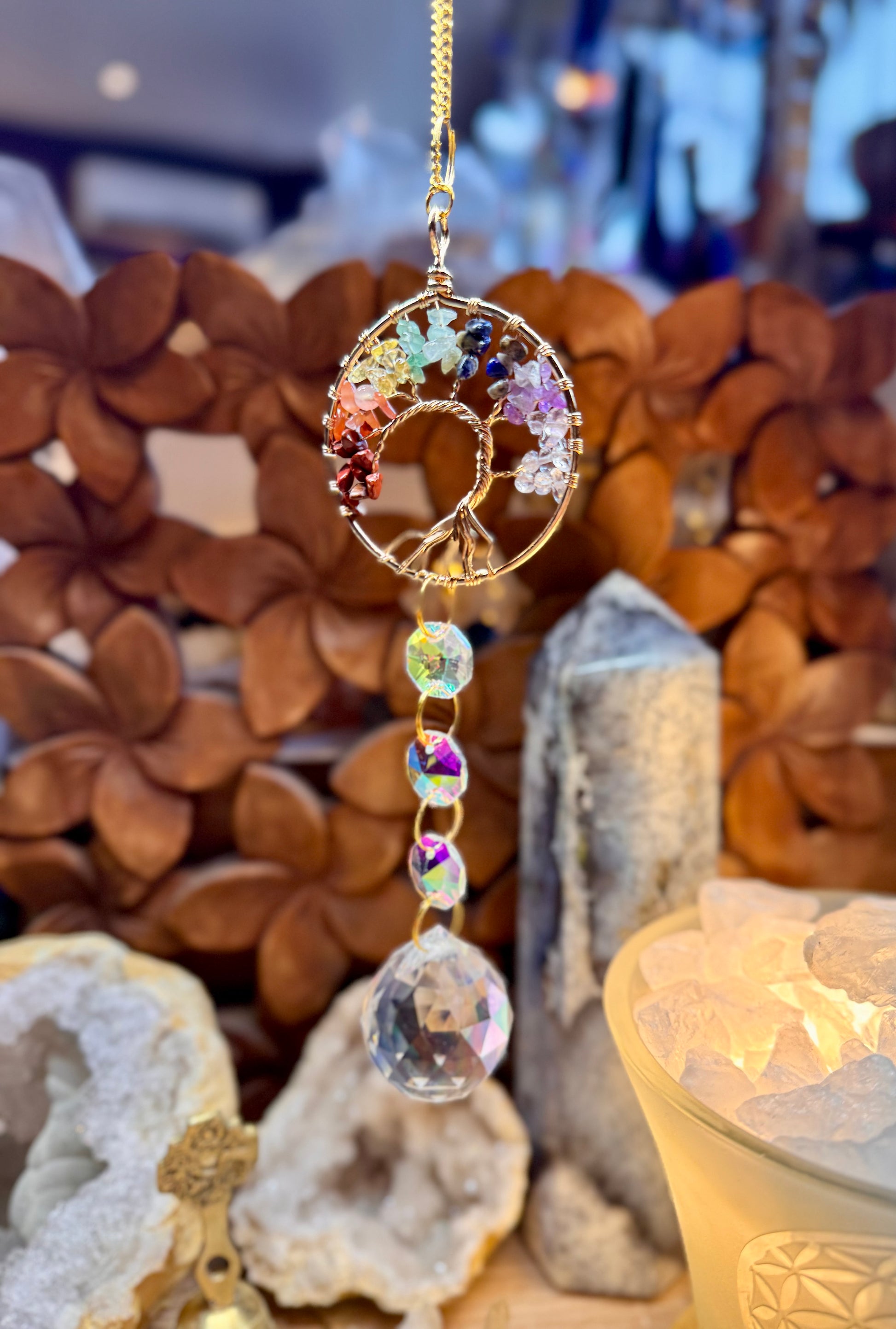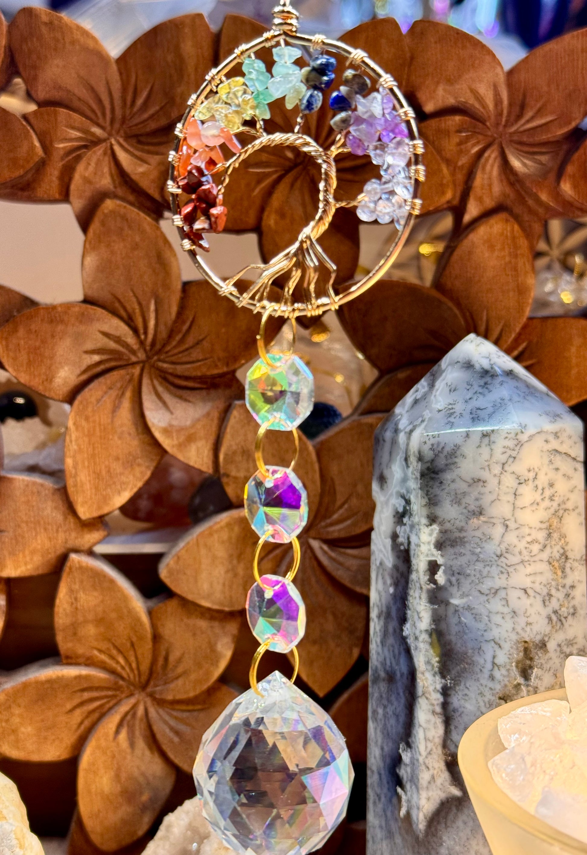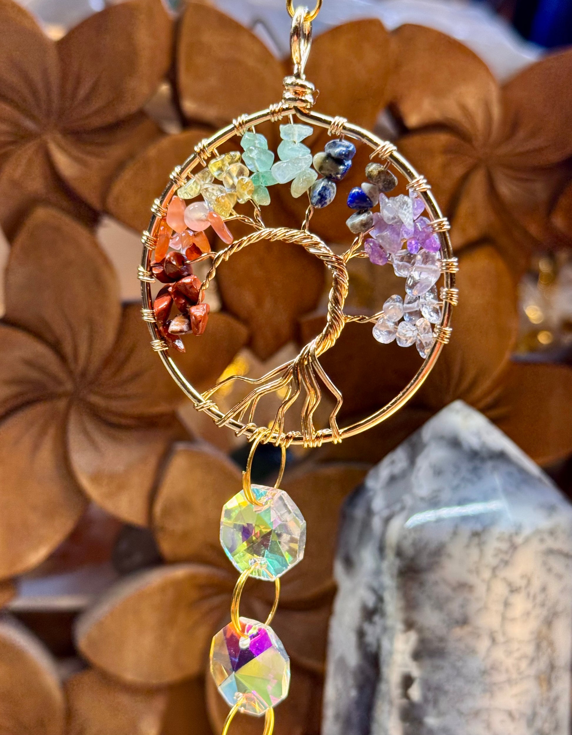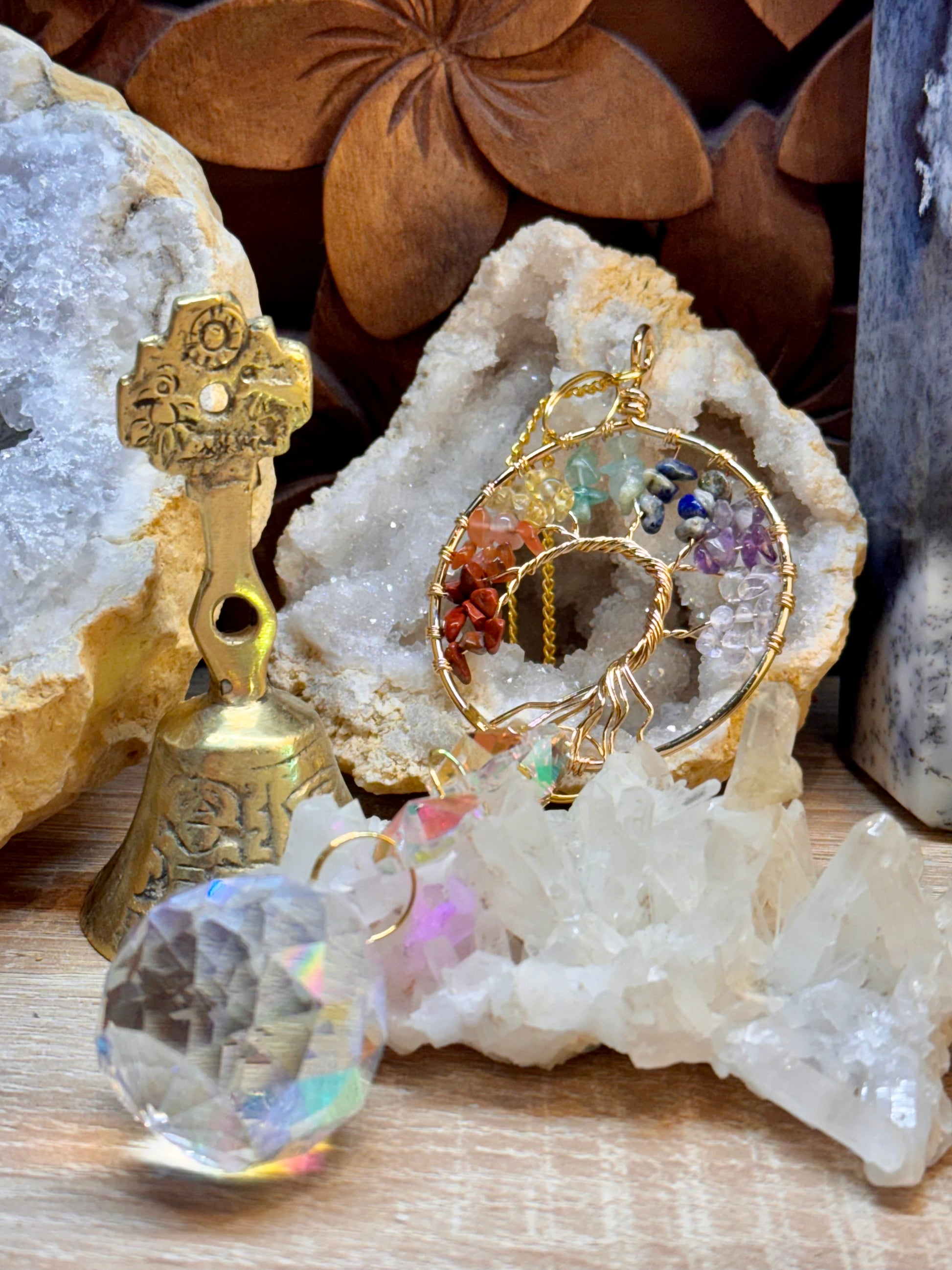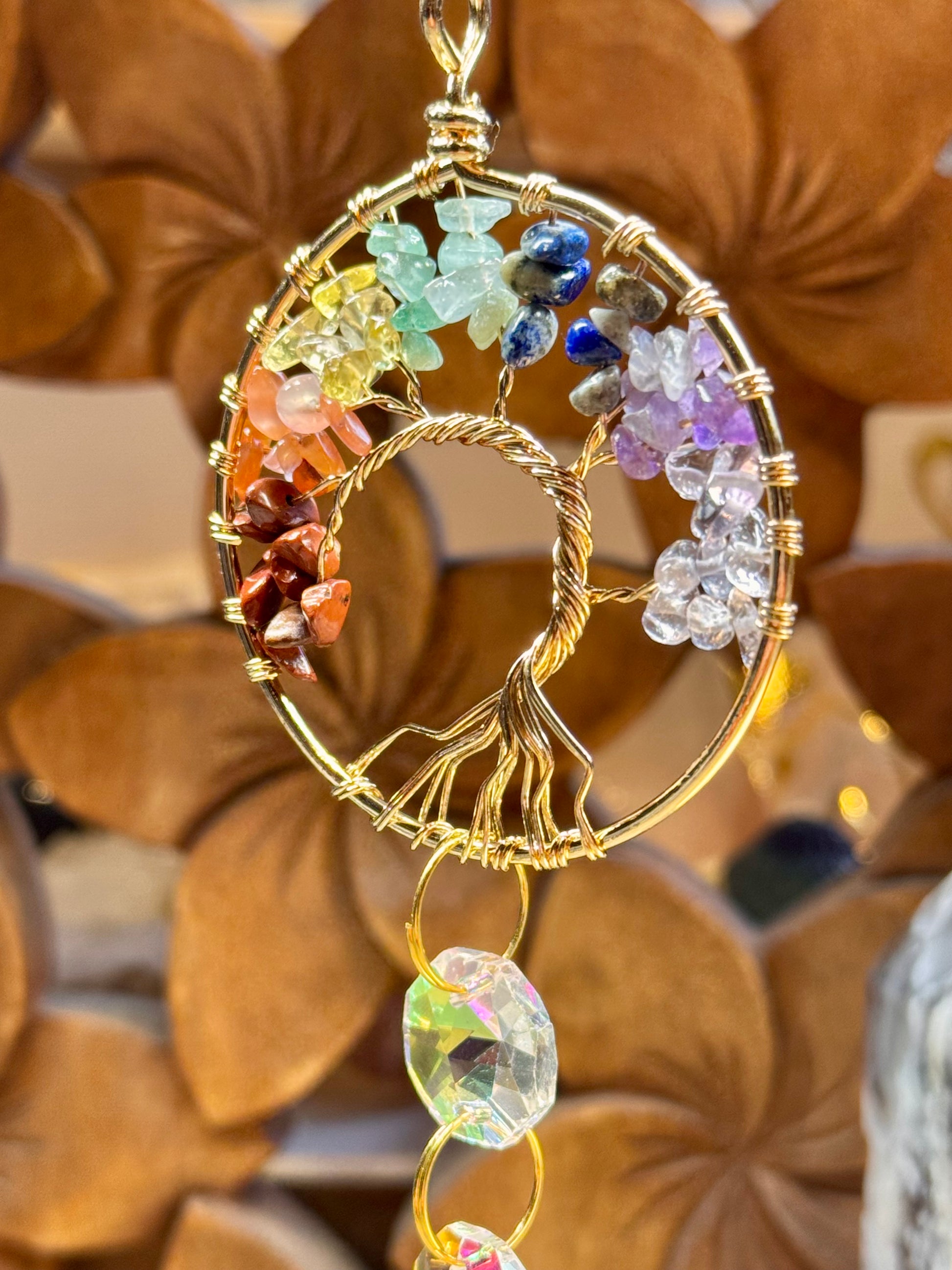 Pierres sur l’arbre de vie : Jaspe rouge, Aventurine orange, Citrine, Aventurine verte, Lapis lazuli, Améthyste et Cristal de roche