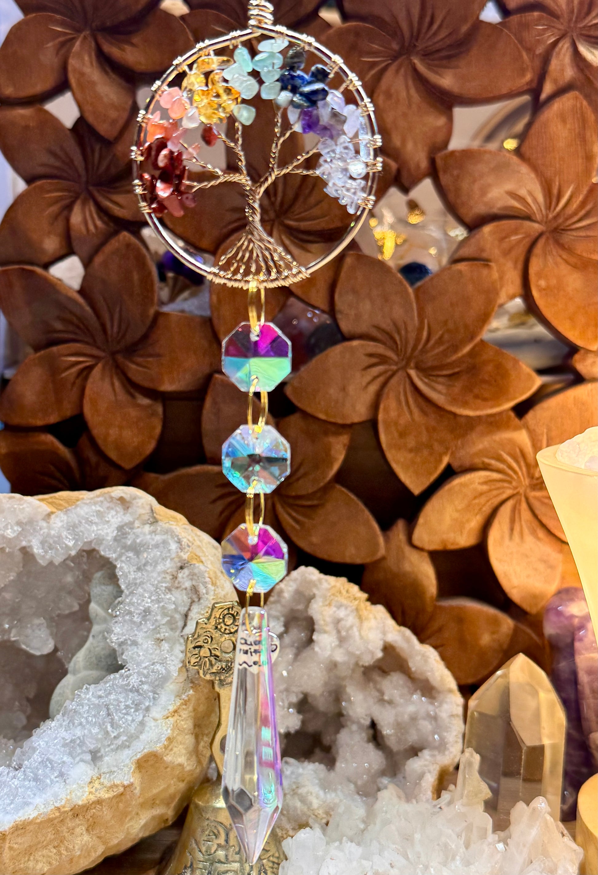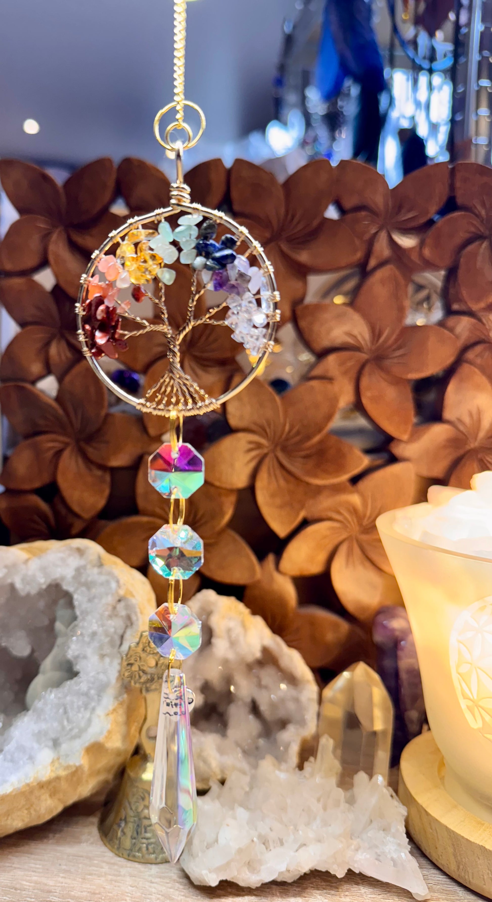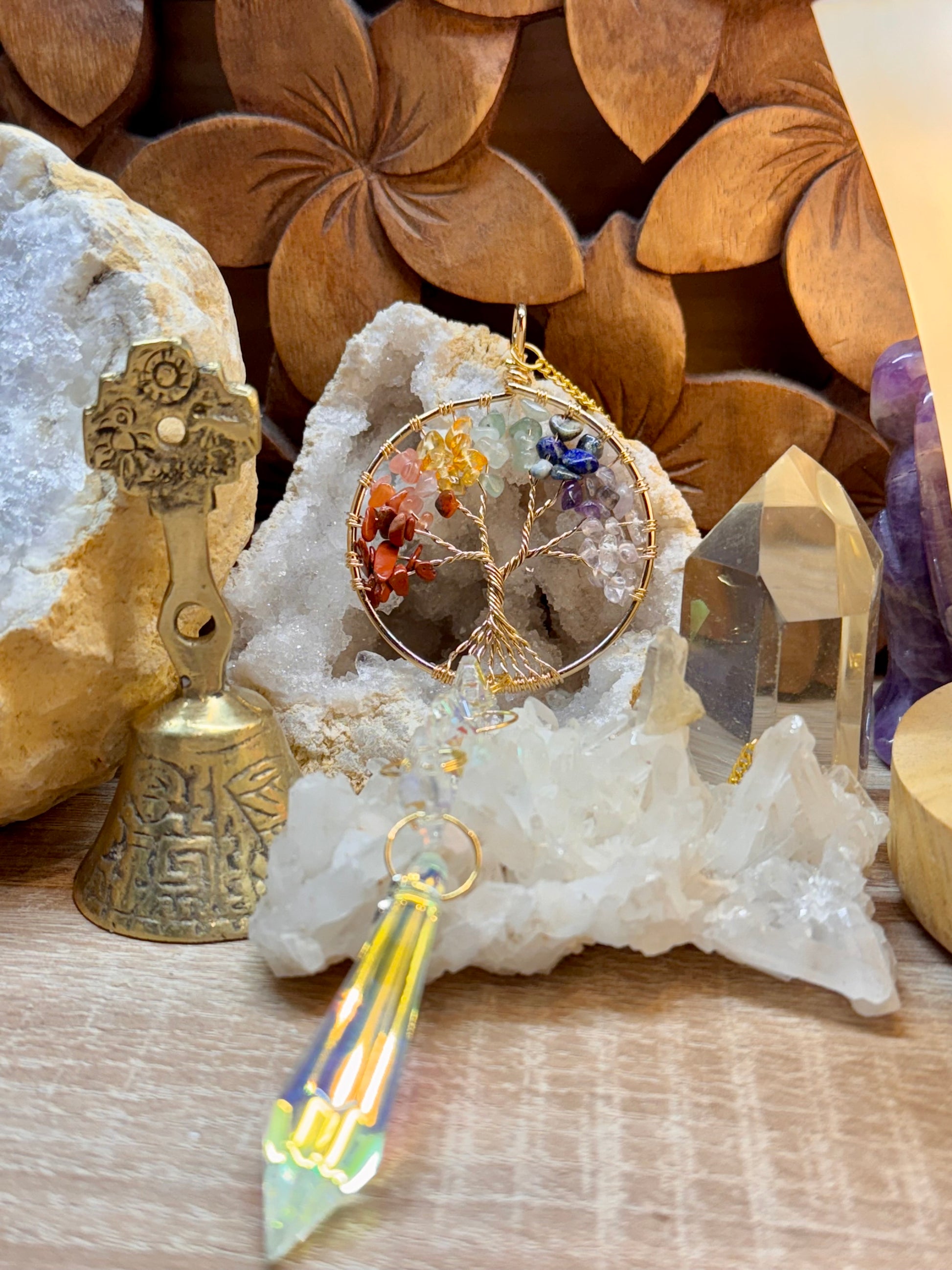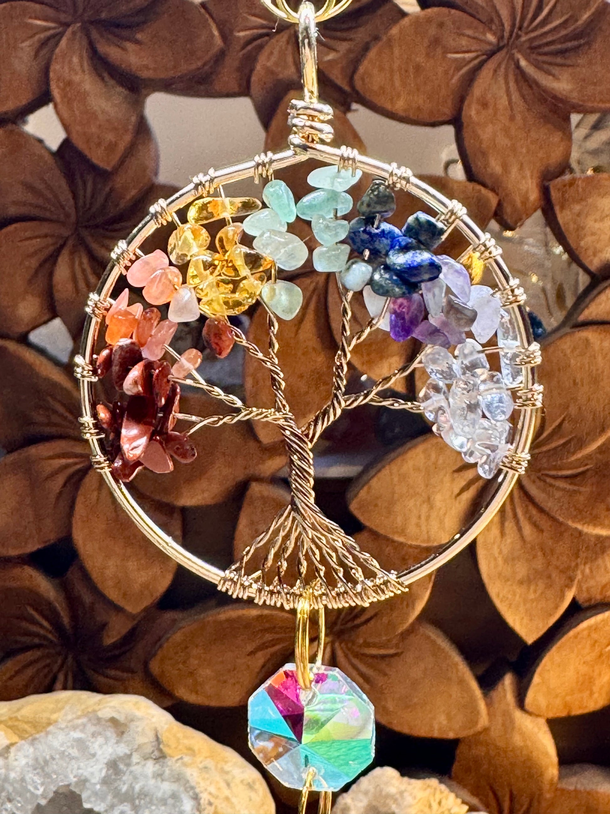 Pierres sur l’arbre de vie : Jaspe rouge, Aventurine orange, Citrine, Aventurine verte, Lapis lazuli, Améthyste et Cristal de roche