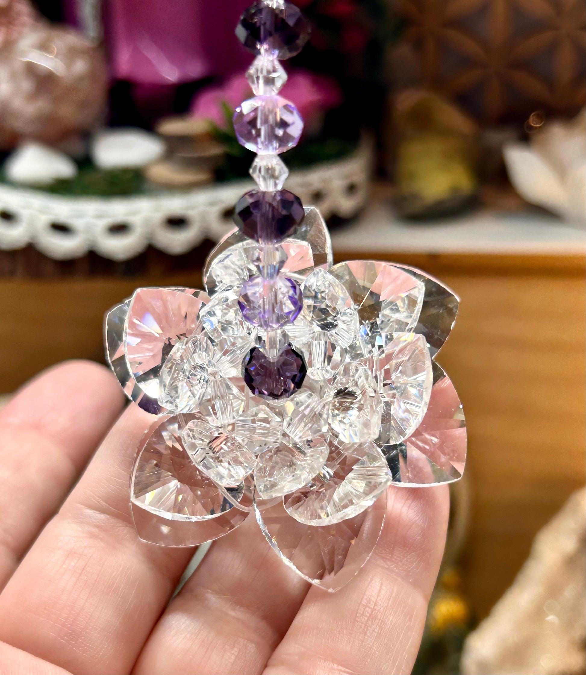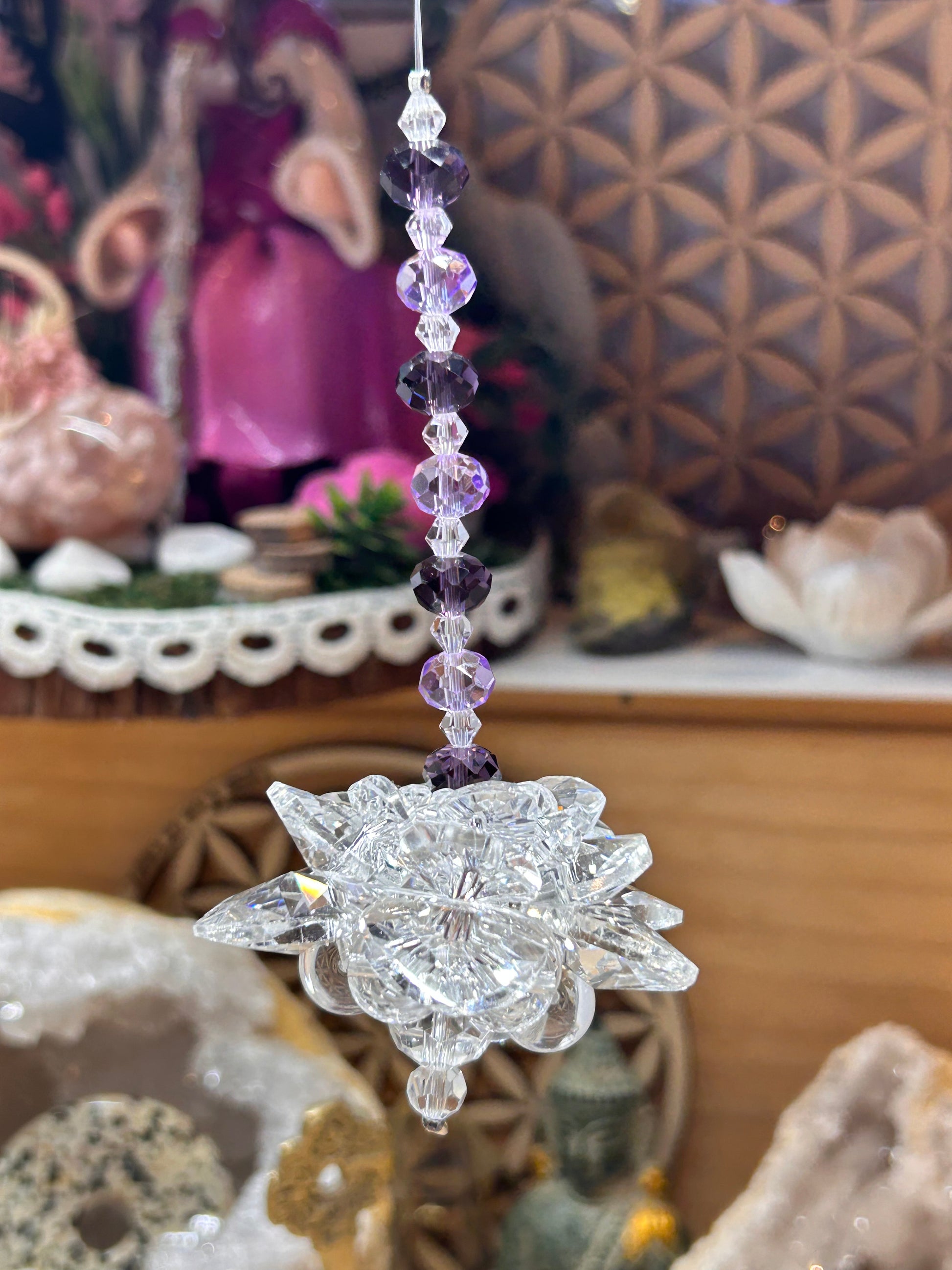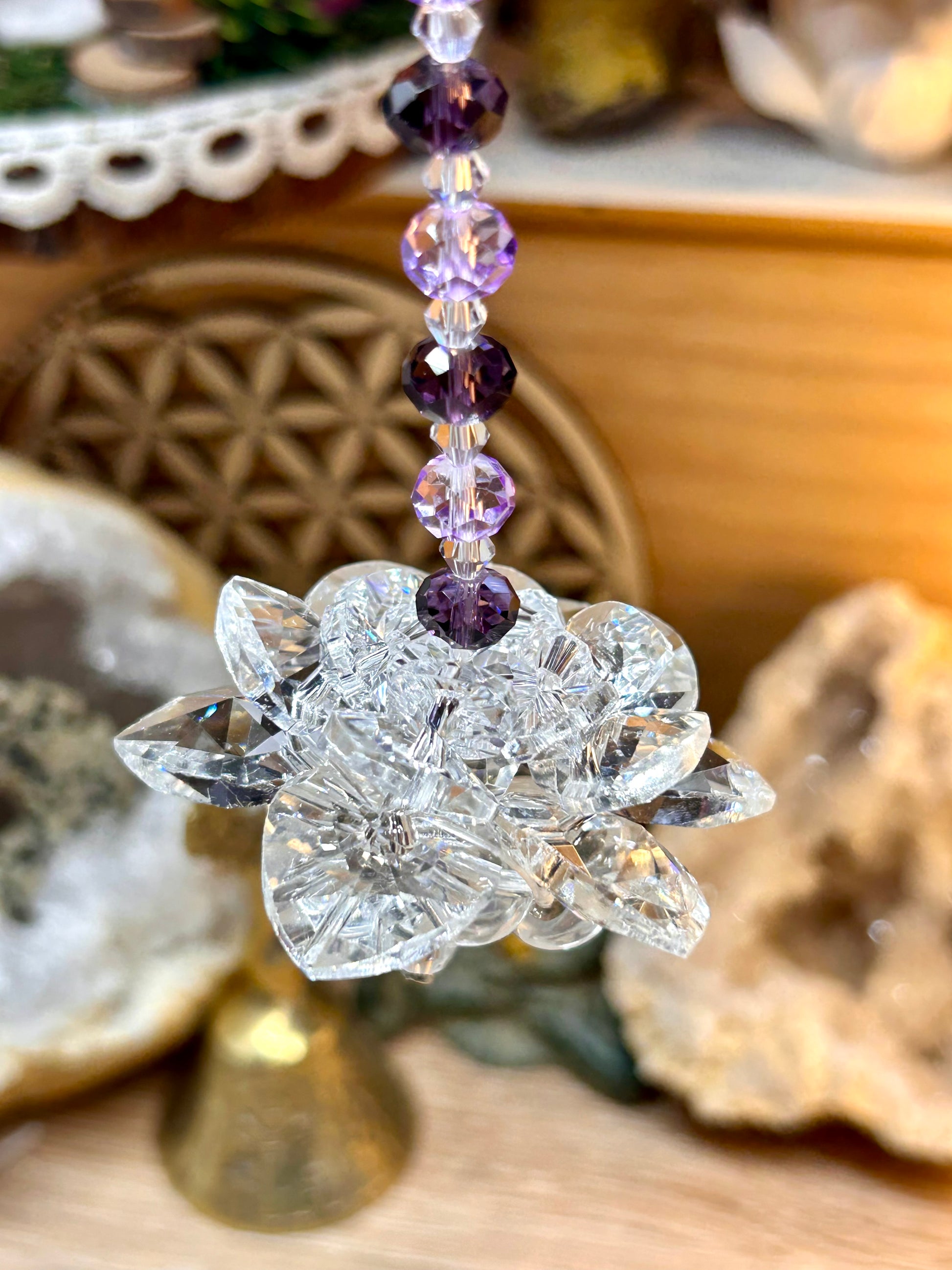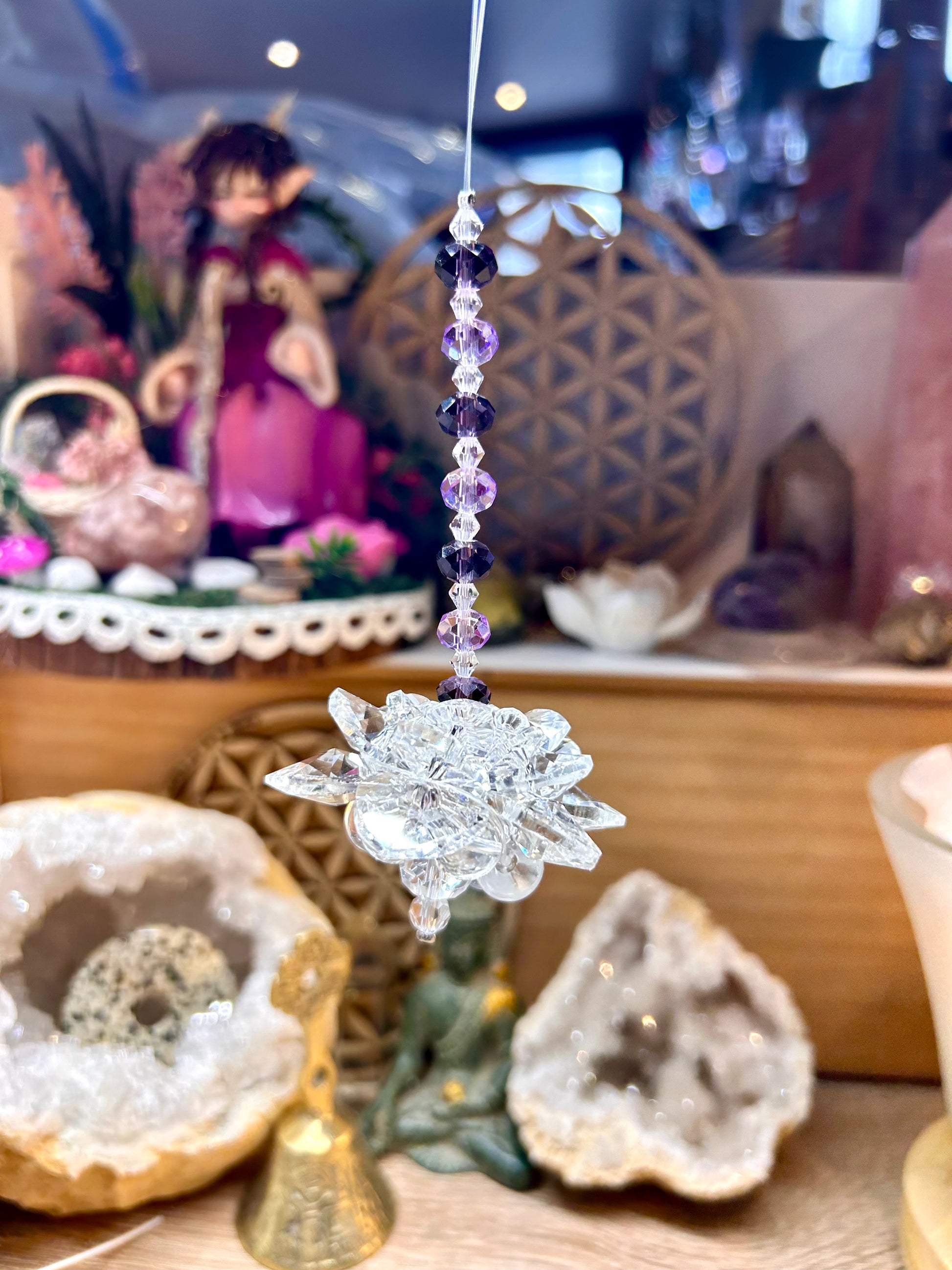 Un capteur de soleil ou pendentif de fenêtre unique avec plusieurs Cristaux arc en ciel et un lotus.