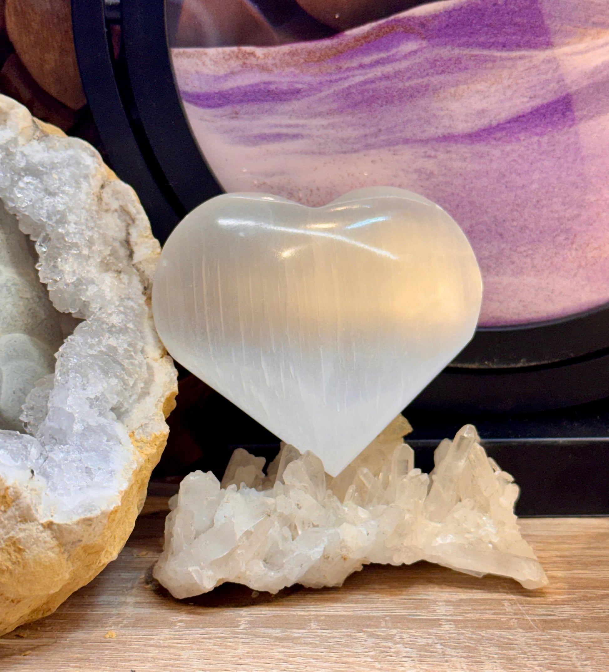 Plan physique : La Sélénite fortifie les organes, aide à résorber les problèmes liés au système osseux et réduit les douleurs articulaires, les migraines ou les douleurs de ventre. Elle aide à effacer les rides, les signes de vieillesse, soigne les maladies cutanées comme l’acné, l’eczéma, le psoriasis. Elle aide à protéger de la calvitie.