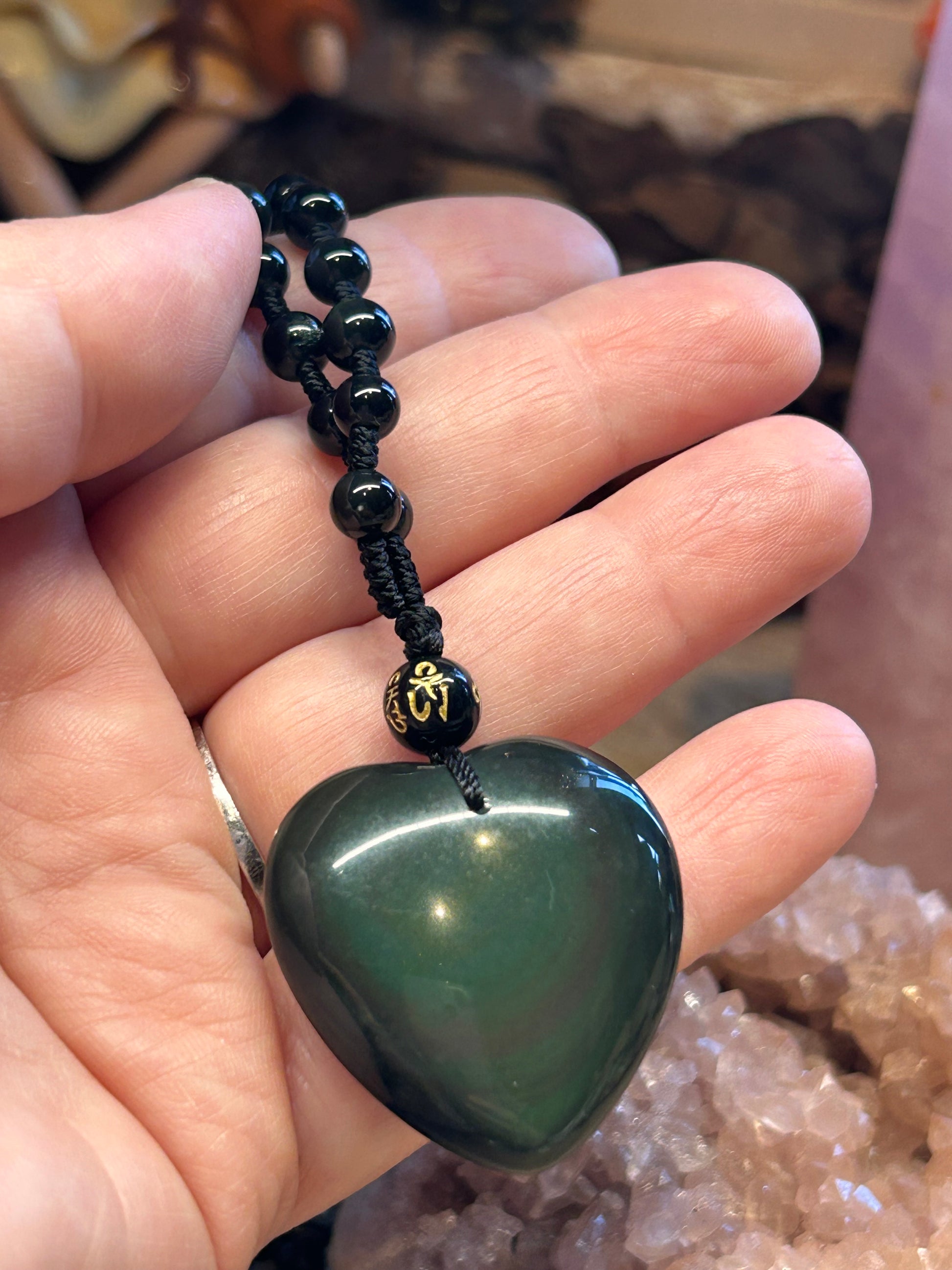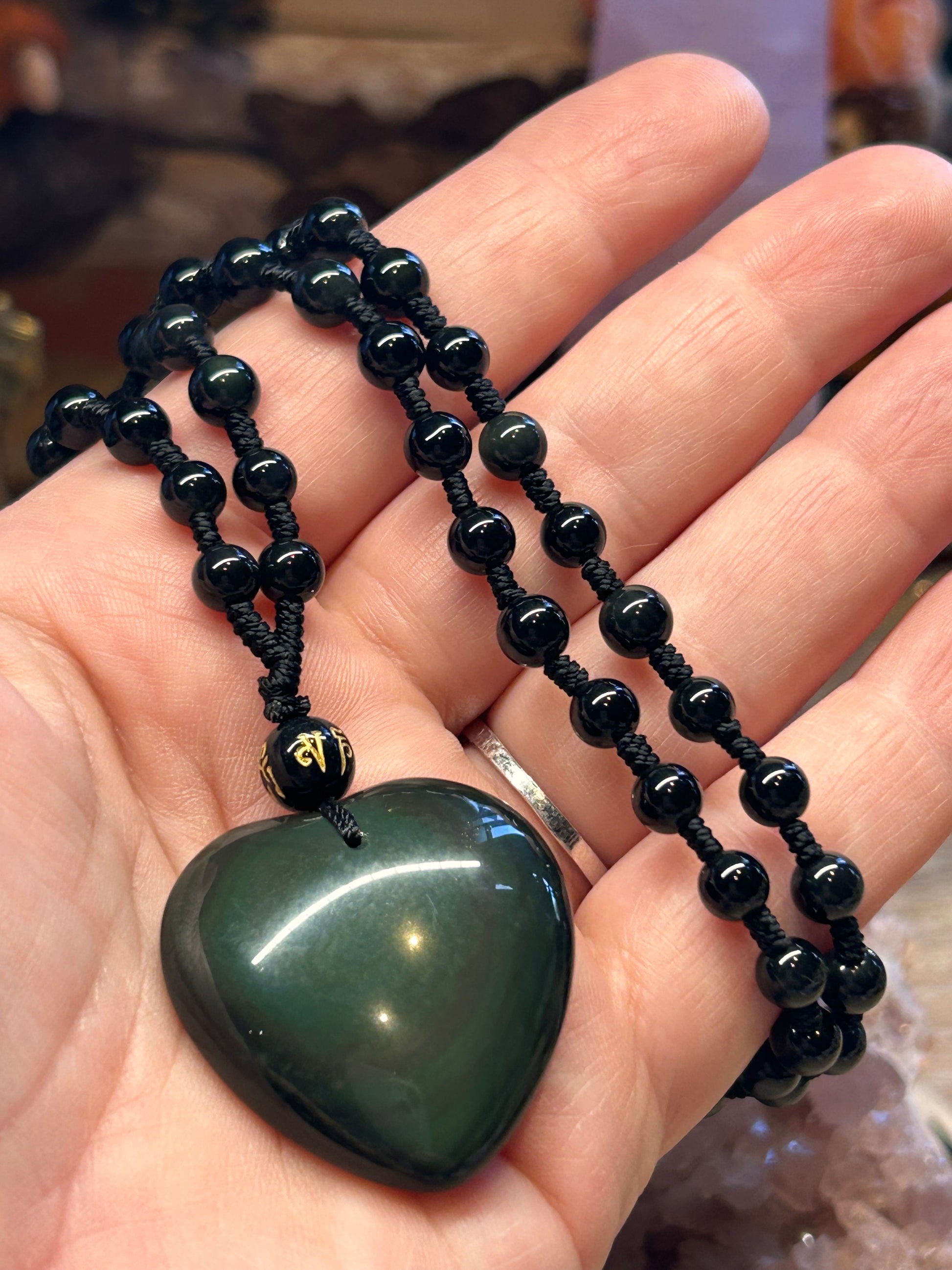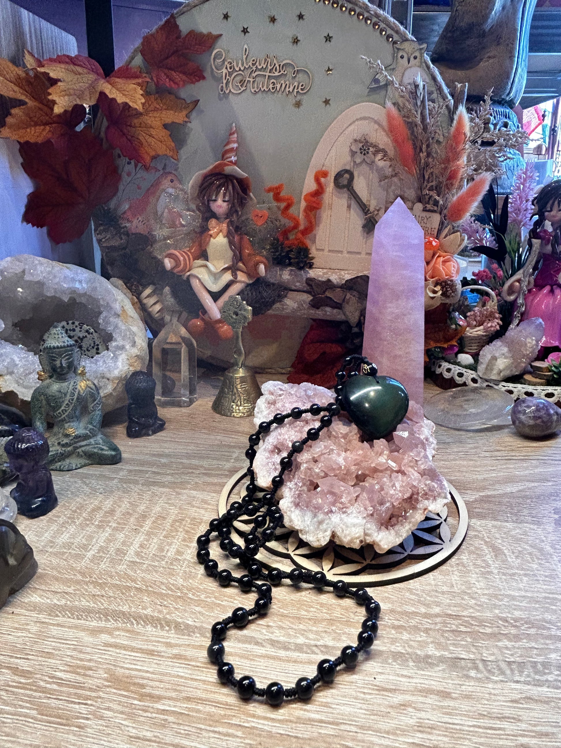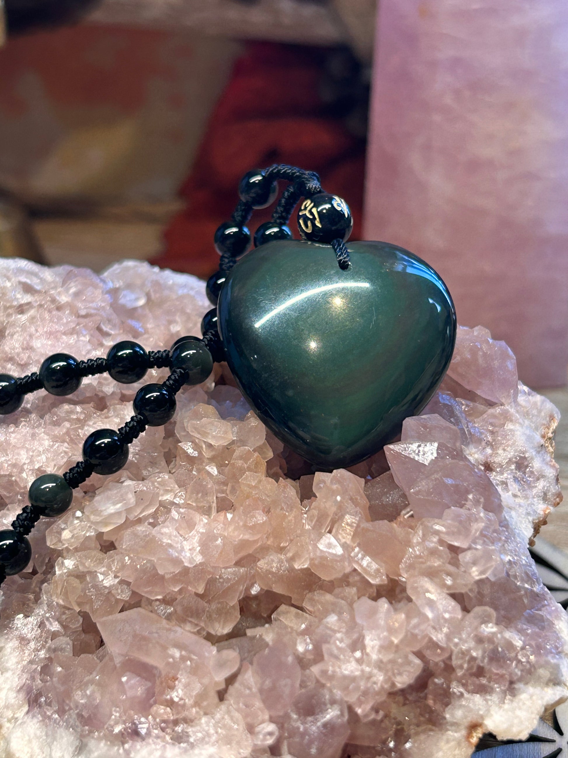 Collier de perles et coeur en obsidienne œil céleste