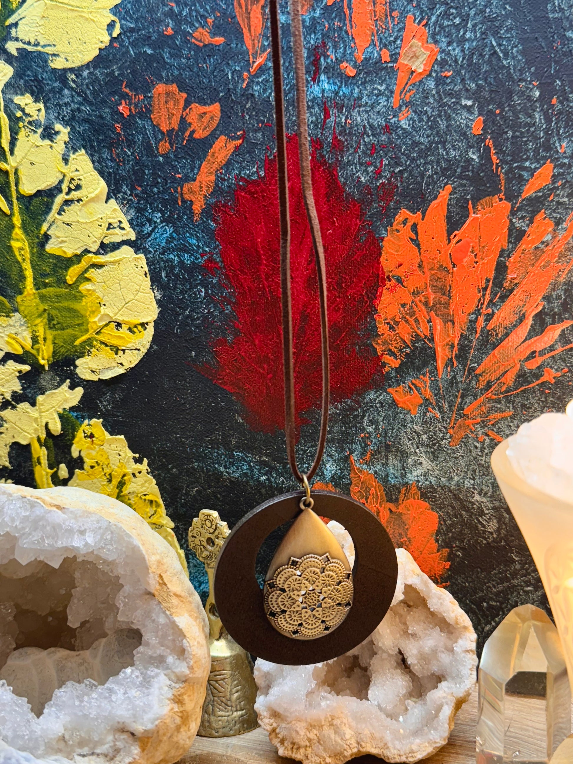 Le collier vintage en bois est fait de bois, de cuir de haute qualité et de métal.
