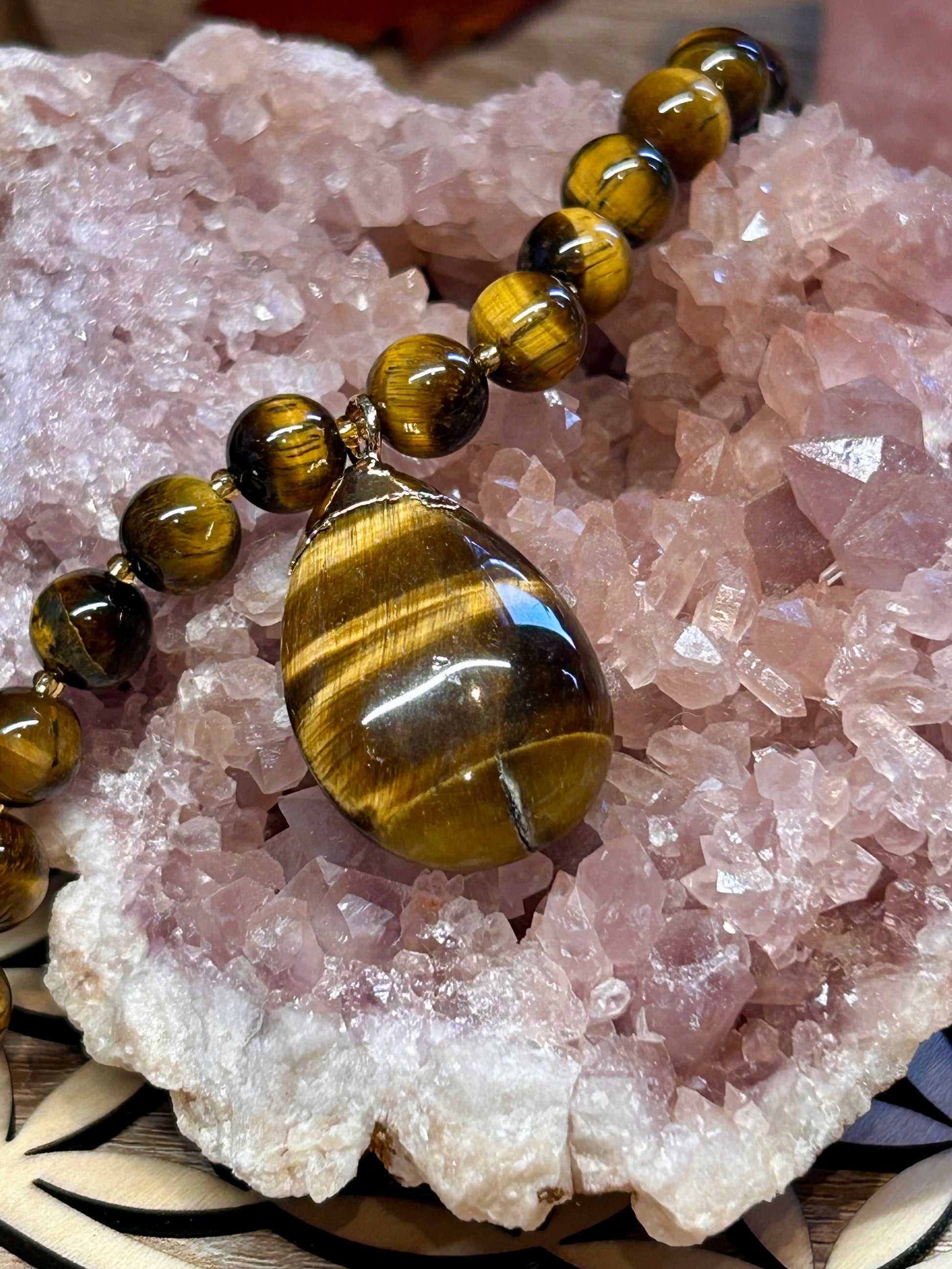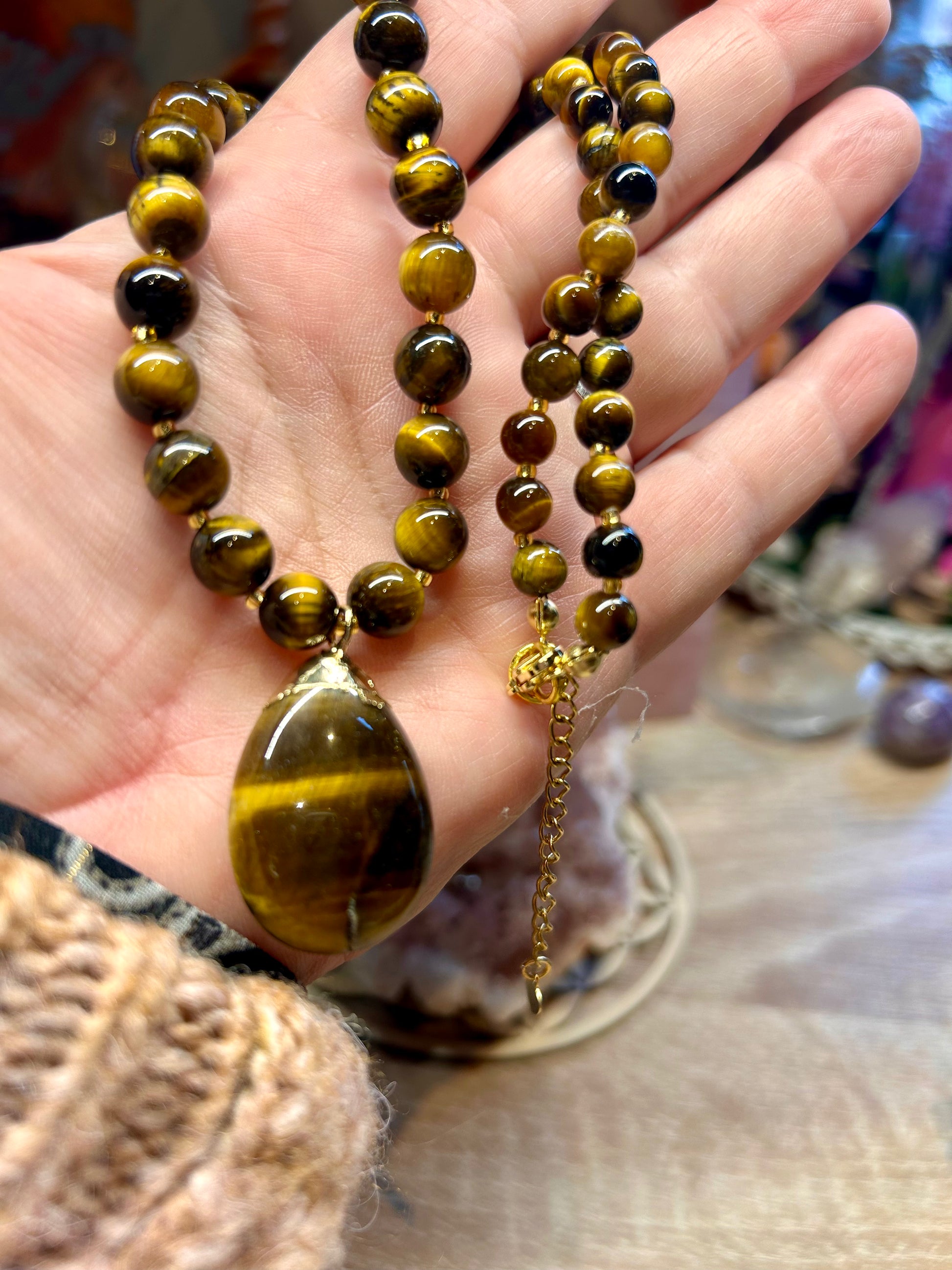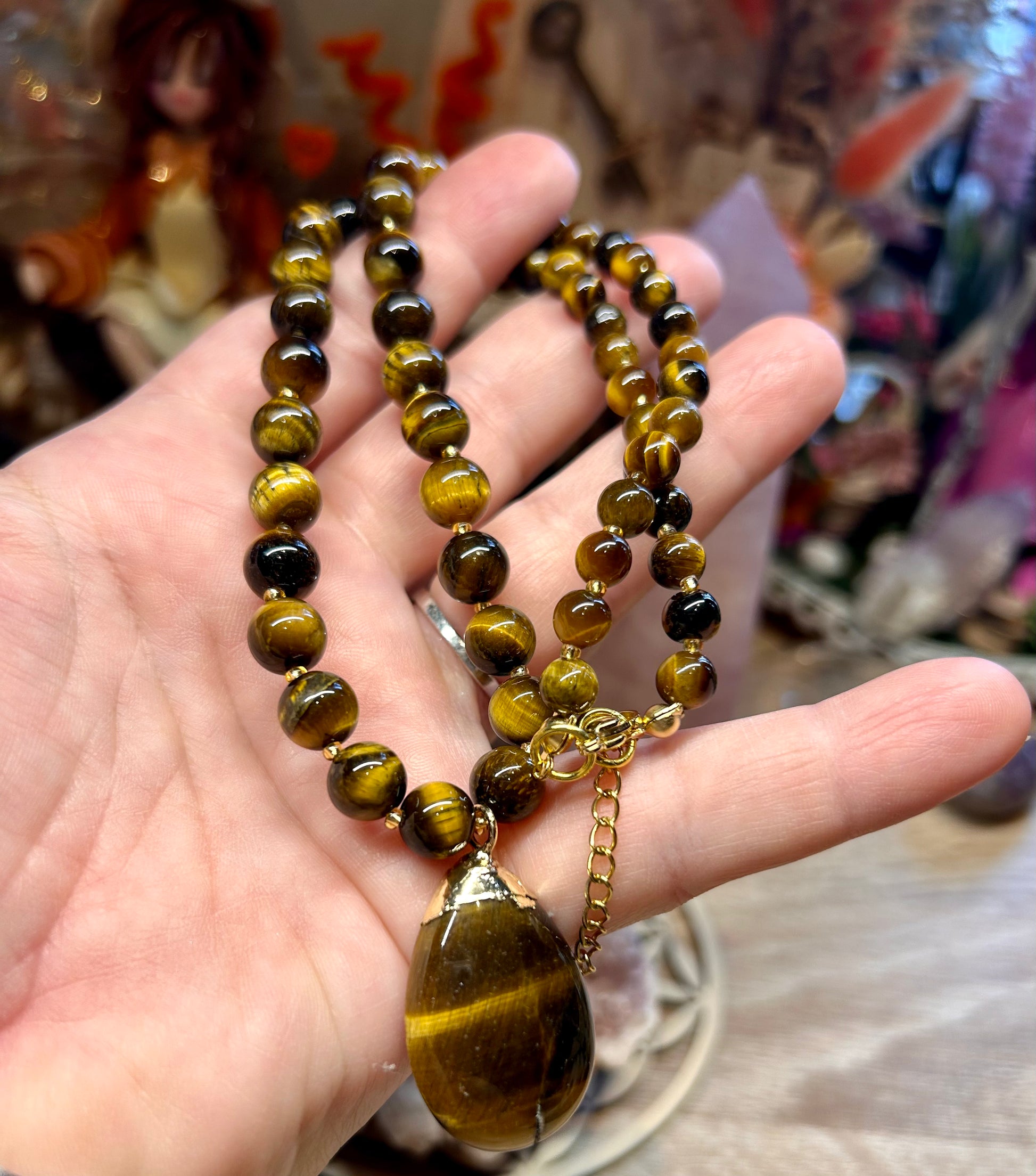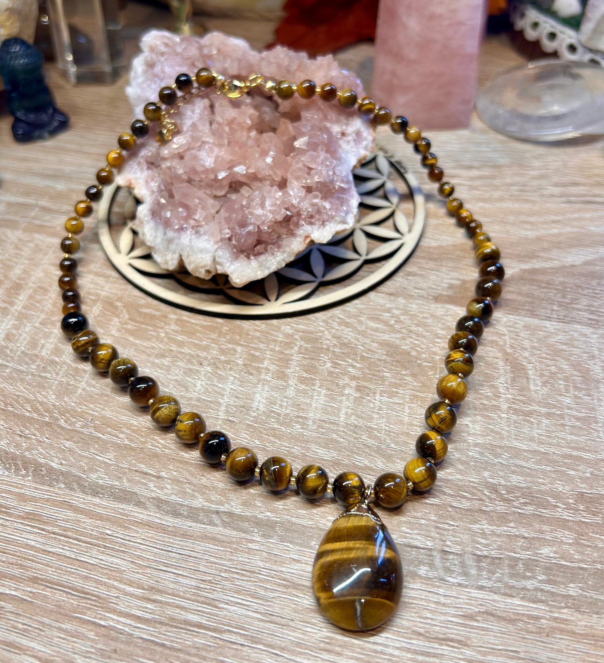 Collier Œil de tigre perles, gouttes et fermoir doré