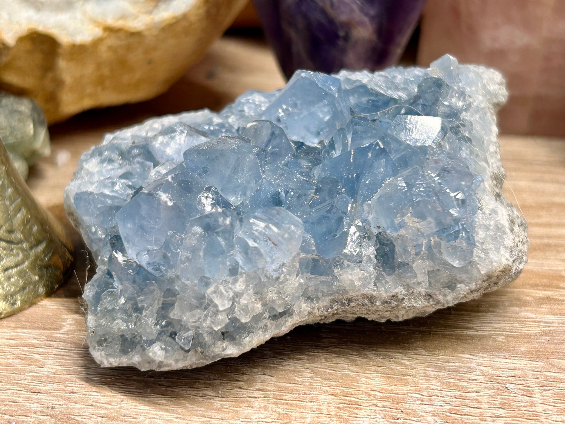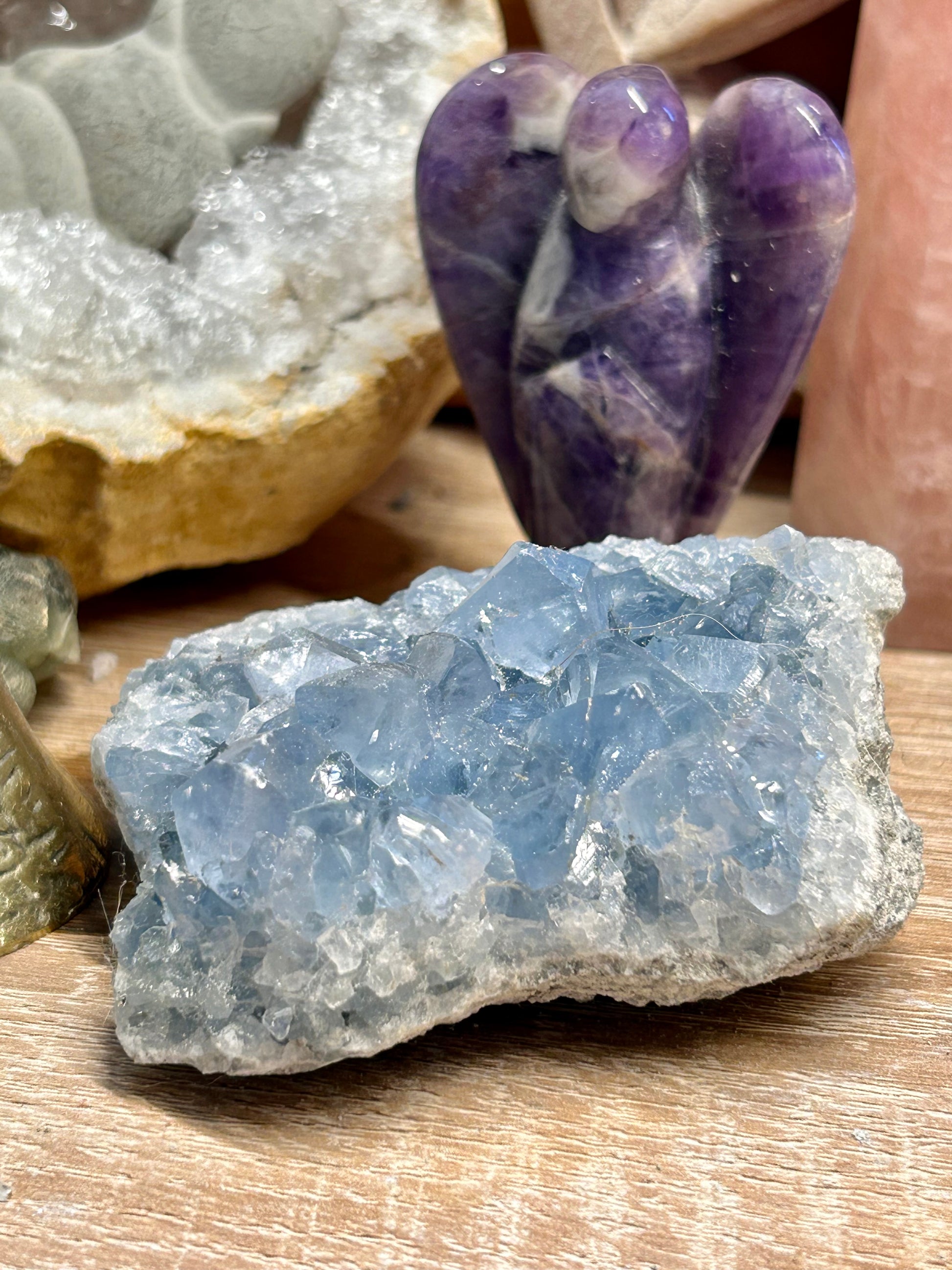 Plan émotionnel : La Célestine, est une pierre réconfortante et apaisante, elle apporte la tendresse maternelle tout en agissant avec douceur. Elle relaxe aussi les tensions et calme l’esprit. (idéale pour les enfants).