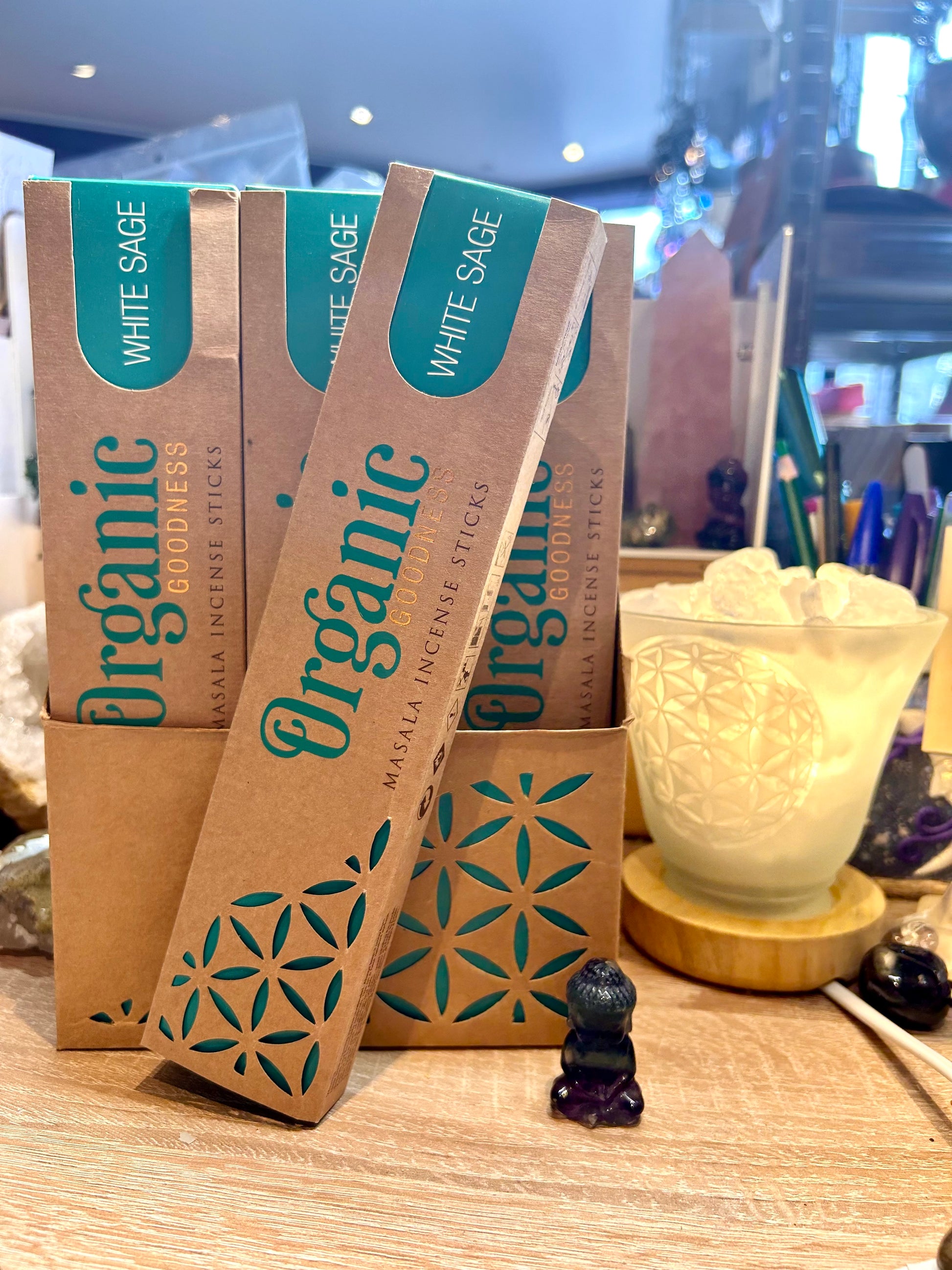 Encens en bâtonnets à la sauge blanche. Song of India nous invite à plonger dans la tradition indienne de l'encens au travers de sa gamme d'encens naturels ORGANIC. L'encens permet de se libérer l'esprit, augmente la conscience de soi pendant la méditation et crée une aura d'énergie positive. Ces bâtons d'encens masala, roulés à la main, ont été soigneusement préparés à partir de poudre de bois naturelle et d'extraits d'huiles essentielles.