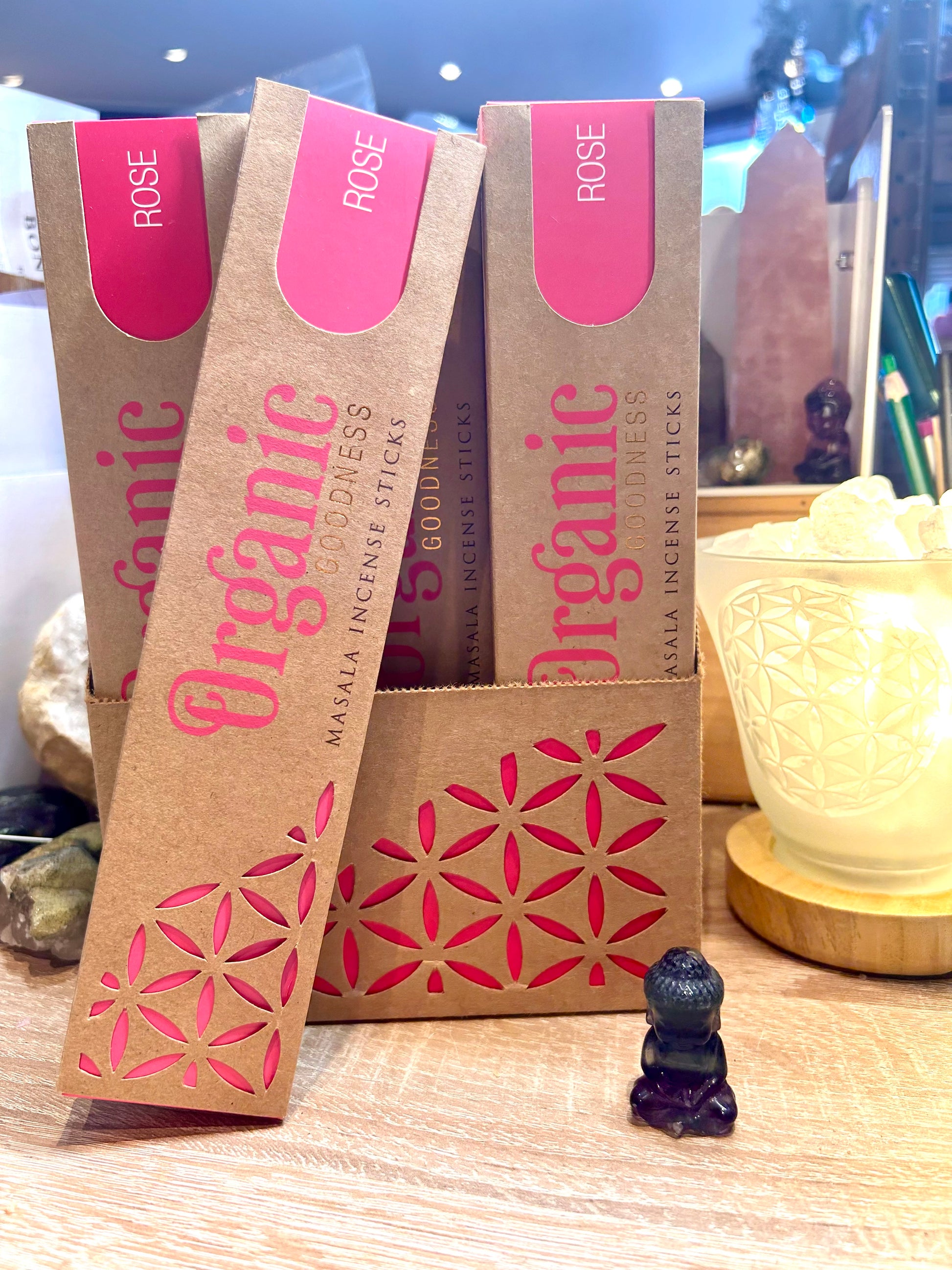 Encens en bâtonnets à la rose. Song of India nous invite à plonger dans la tradition indienne de l'encens au travers de sa gamme d'encens naturels ORGANIC. L'encens permet de se libérer l'esprit, augmente la conscience de soi pendant la méditation et crée une aura d'énergie positive. Ces bâtons d'encens masala, roulés à la main, ont été soigneusement préparés à partir de poudre de bois naturelle et d'extraits d'huiles essentielles.