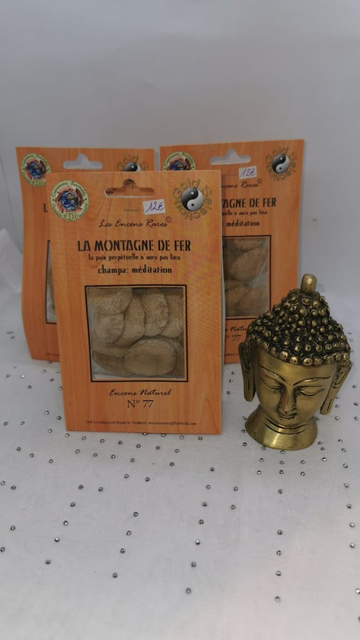 Encens rares : la montagne de fer, vertus de méditation grâce au champa. Sachet de 25 gr. Les encens rares de DVF (marque, modèles et technique déposée) sont fabriqués artisanalement dans un petit village de Thailande à 350 kms de Bankok au cœur des rizières, et dans le plus grand respect des droits et de la dignité de chacun. Ces encens ont la particularité de se consumer naturellement sans charbon ni bois, et les parfums en sont parfaitement restitués. C’est donc un encens naturel sans bois, ni charbon, ni polymère servant de liant. Fabrication 100% artisanale (ni machine, ni four). Composition : base de plantes, d’herbes, de feuilles, de paille de riz, de résines naturelles (benjoin, myrrhe, copal…). Utilisation d’eau de pluie comme liant, du soleil comme moyen de séchage, de paille de riz et de racines comme combustible. Année de création : 1999 [PACKAGING] Sachet plastique avec fourreau brochable