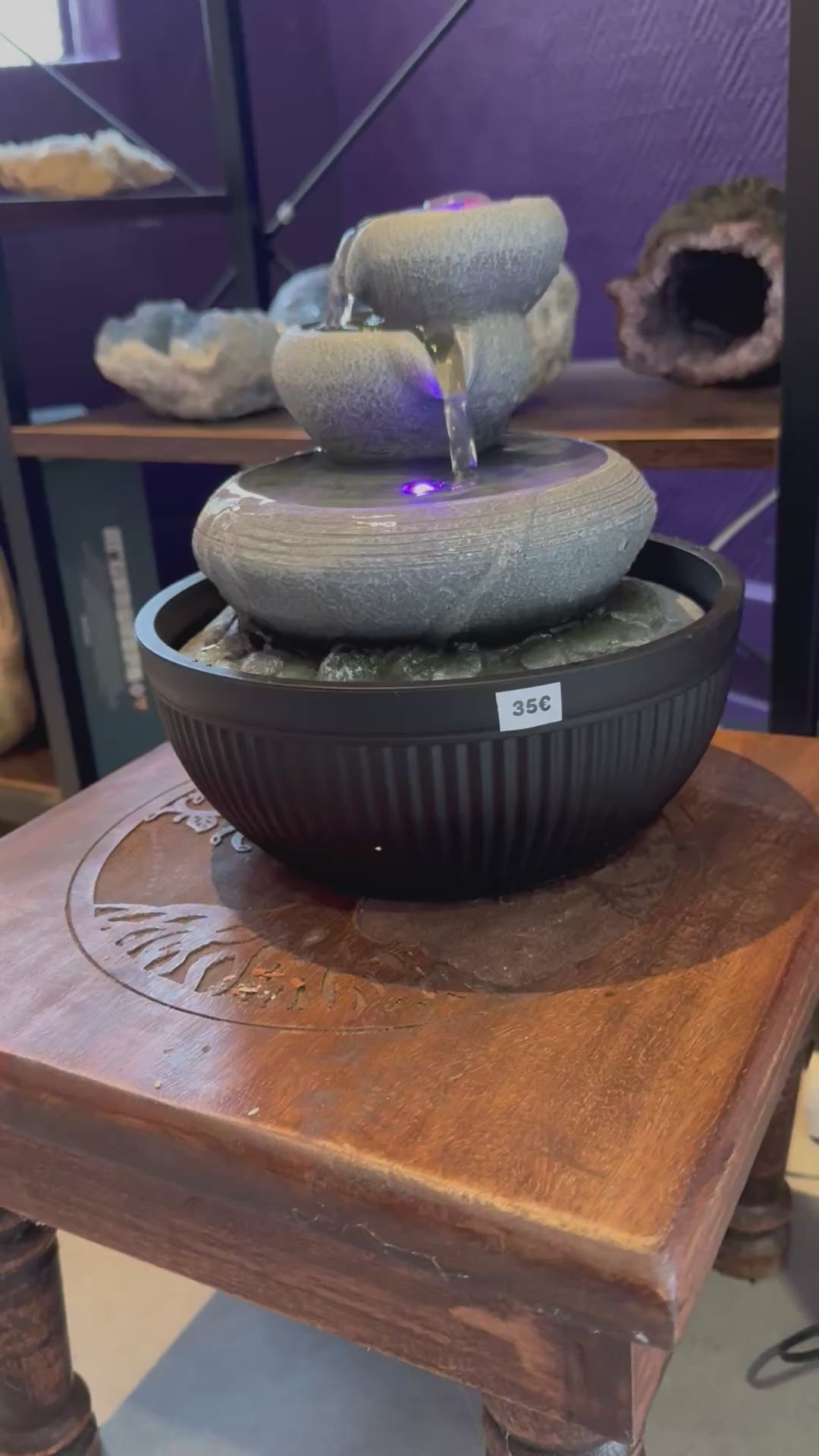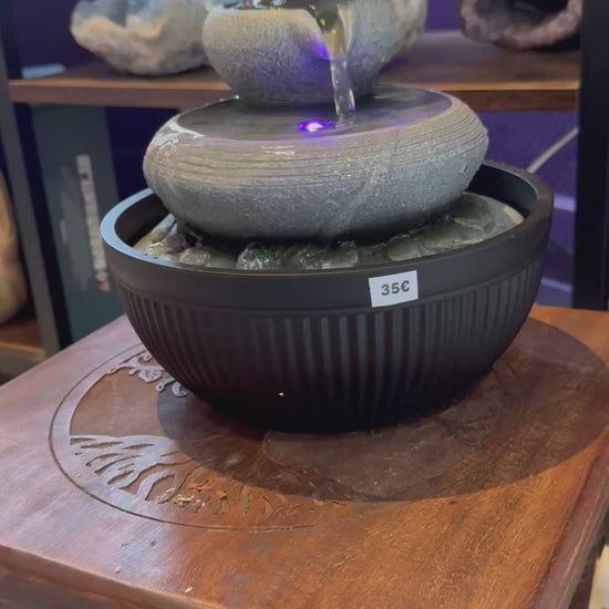 Design simplifié et épuré, imitation pierre naturelle avec un écoulement d’eau de jarre en jarre illuminé par éclairage led à variation de couleur.