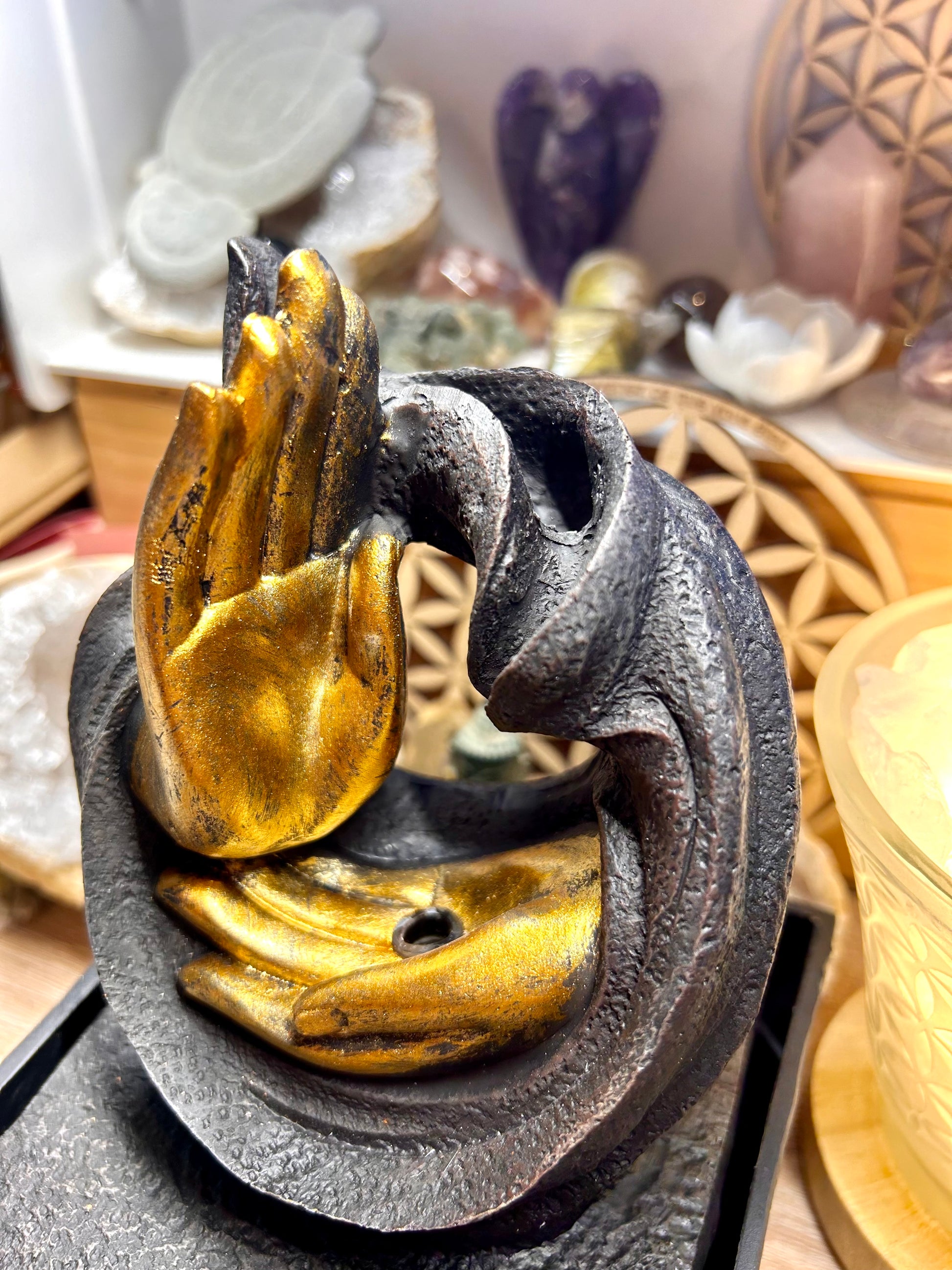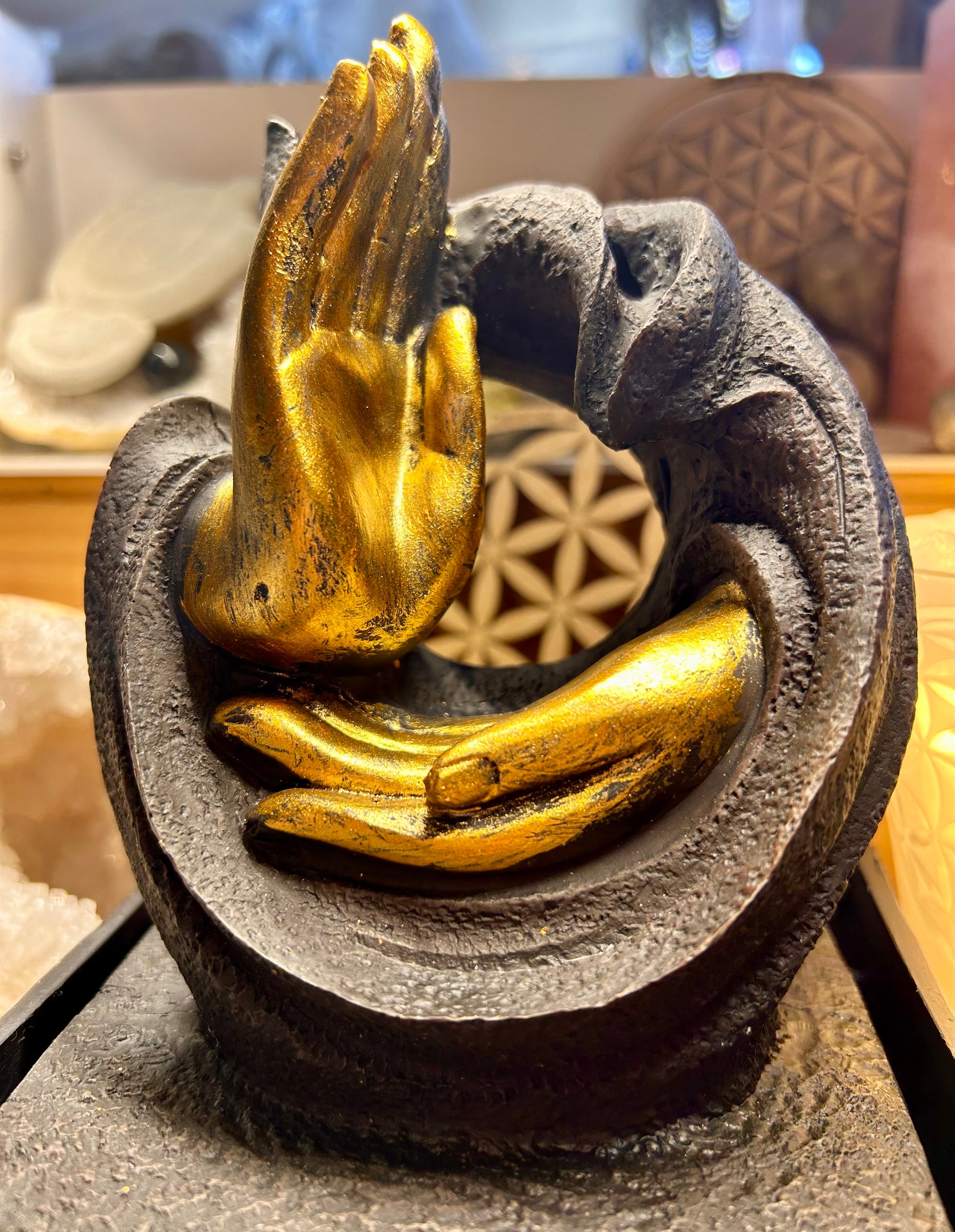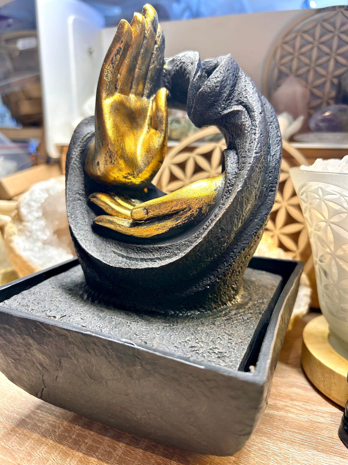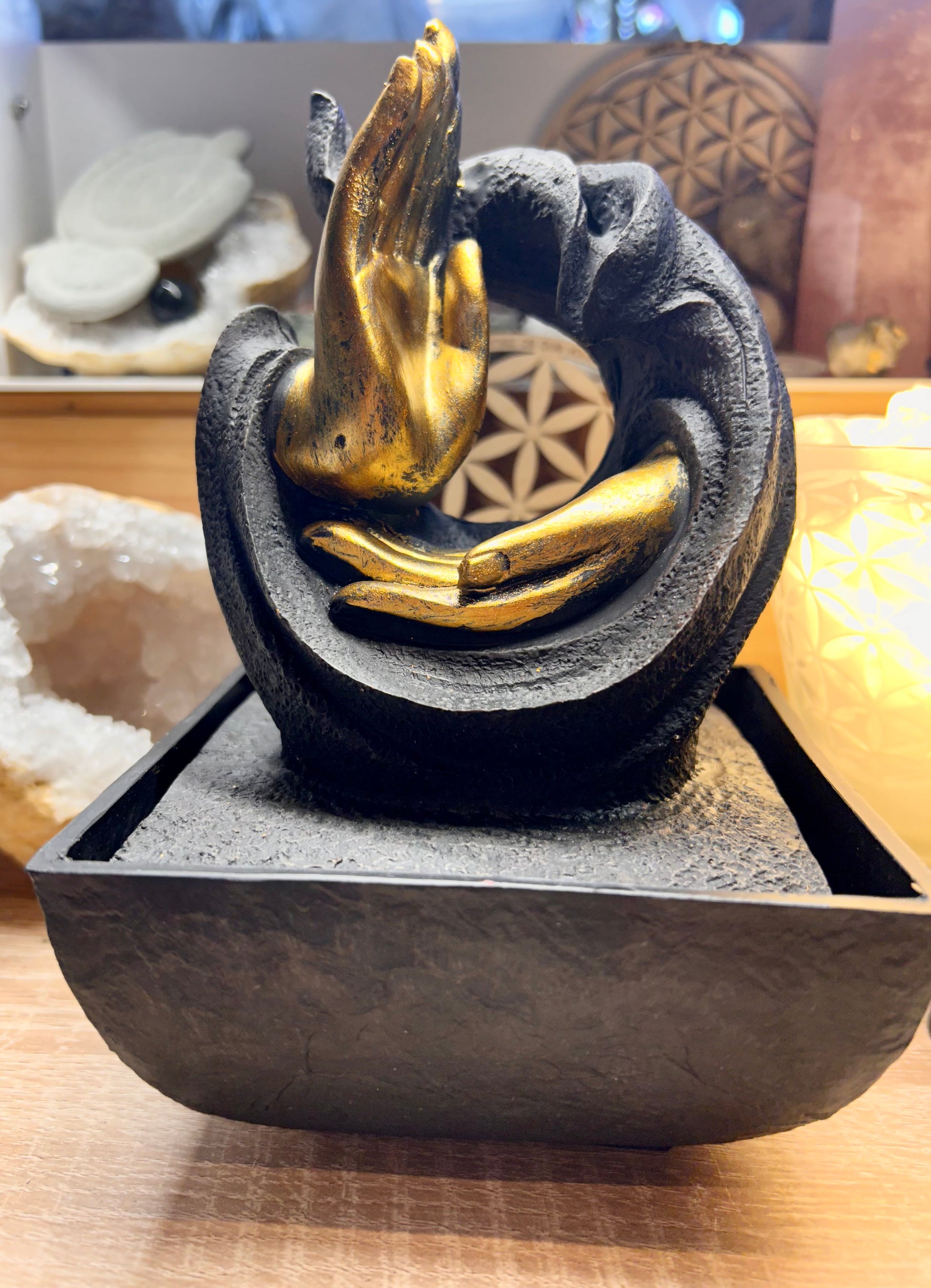 L’eau coule jusqu’au creux de la main où une LED est placée avec variateur de couleur.