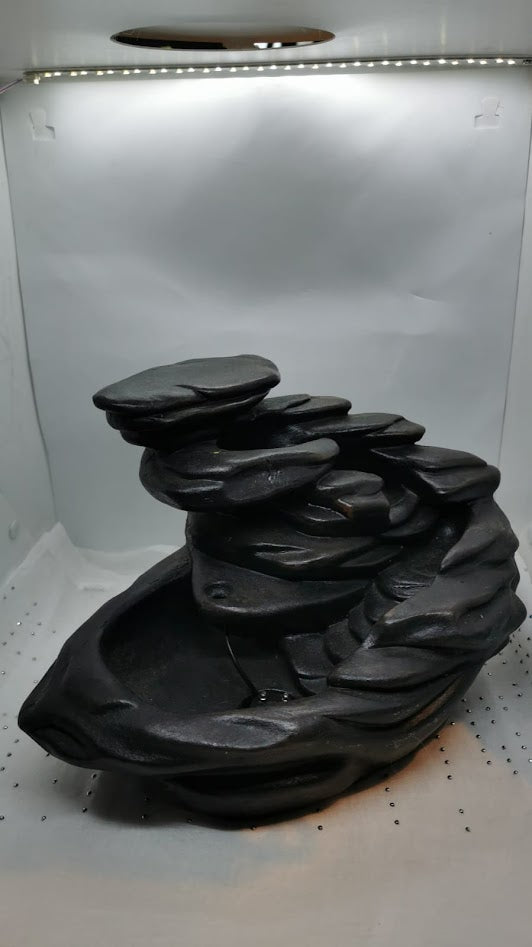 Un éclairage led à variation de couleur vient mettre en valeur le relief du décor et le mouvement d’eau.