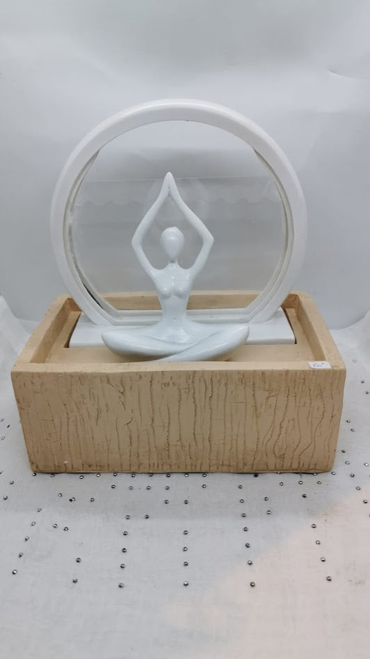La Vitality est une élégante fontaine au design volontairement moderne et épuré. Sous son arche blanche est assise une jeune femme en pleine méditation dans la position du lotus.