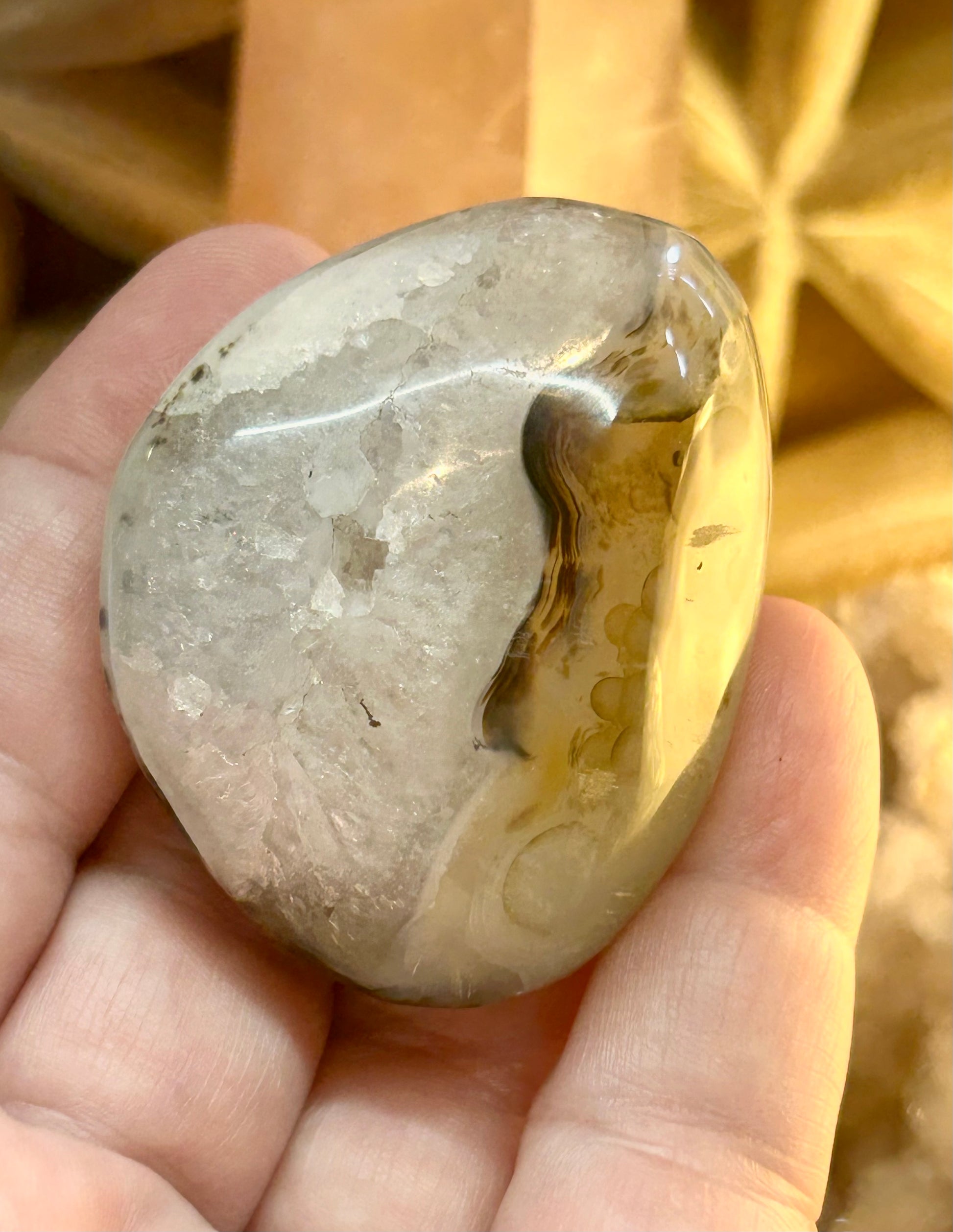 Plan spirituel : Pierre d’ancrage, elle est parfaite pour centrer l’énergie. L’Agate fait le pont entre le ciel et la terre, c’est la pierre de la clairvoyance et de la contemplation. Elle stimule le développement spirituel. Durant une méditation, elle agit à l’image de ses couches : elle vous dirige vers une connexion profonde, dans vos expériences de vie pour y rechercher le meilleur, laissant les difficultés derrière.