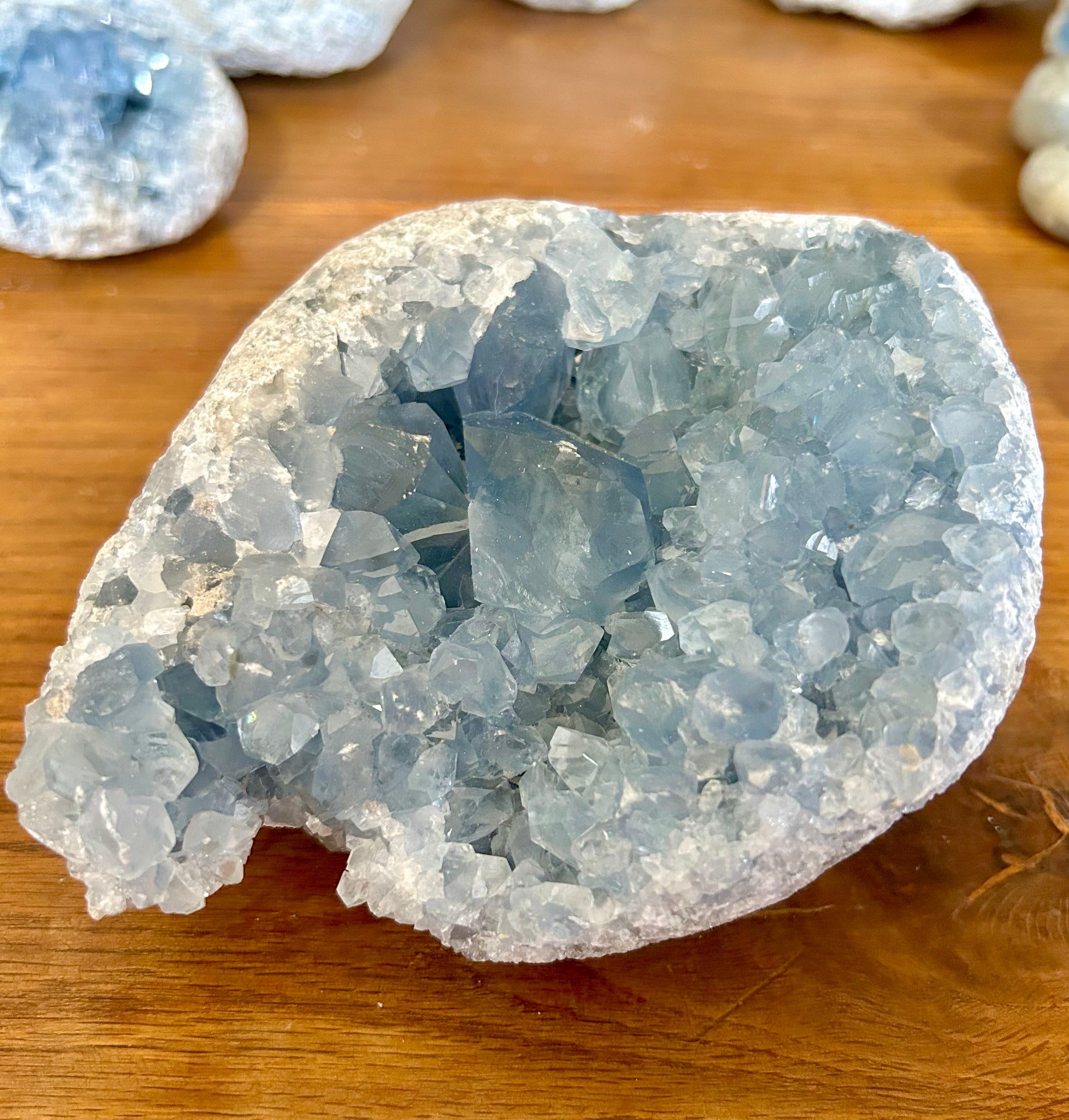 Plan émotionnel : La Célestine, c’est une pierre réconfortante et apaisante, elle apporte la tendresse maternelle tout en agissant avec douceur. Elle relaxe aussi les tensions et calme l’esprit. (idéale pour les enfants).