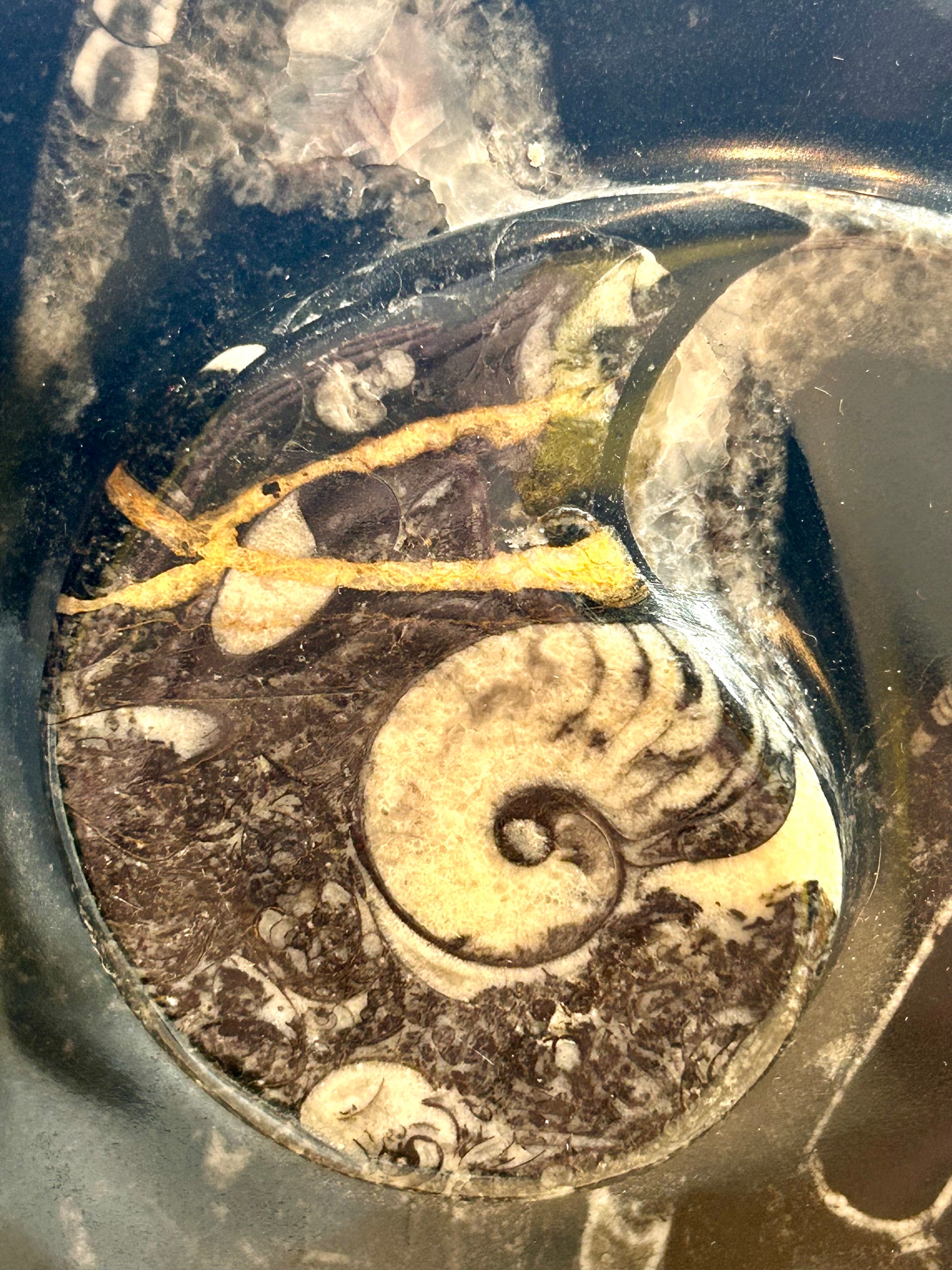 Céphalopodes, les orthoceras sont des cousins lointains des nautiles que nous connaissons aujourd’hui. À la différence de l’ammonite, son siphon intérieur a une position axiale. Malgré ce que l’on croit, les animaux qui sont aujourd’hui fossilisés étaient de grands prédateurs à l’époque. On en trouve essentiellement au Maroc.