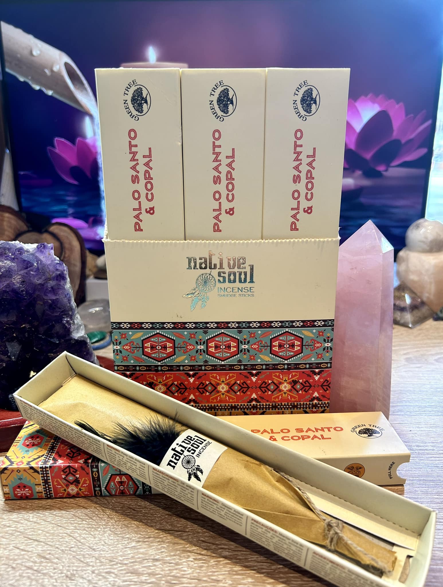 Le Copal et le Palo Santo sont utilisés depuis des millénaires par les chamanes autochtones pour soigner le corps et l'esprit, purifier les espaces, libérer les énergies négatives et se préparer à la méditation. Le Copal est une résine autrefois considérée comme sacrée par les Mayas et les Aztèques au Mexique et en Amérique Centrale. Le Palo Santo est un arbre mystique qui pousse sur les côtes de l'Amérique du Sud. Ces bâtonnets d'encens associent à merveille l'odeur douce et verdoyante du Copal, l'odeur balsamique du bois de Palo Santo renforçant ainsi la concentration et apportant paix et harmonie.