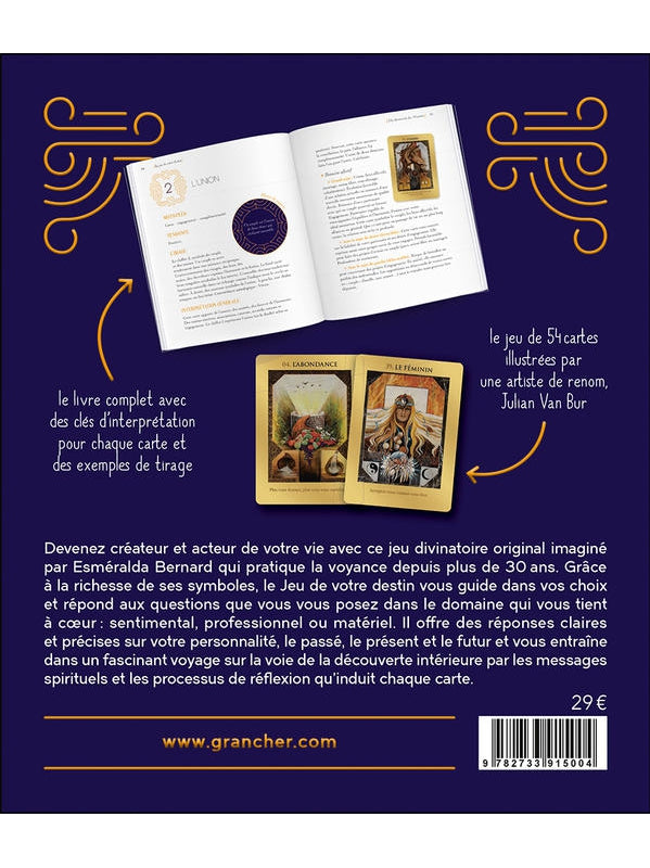 Devenez créateur et acteur de votre vie avec ce jeu divinatoire original imaginé par Esméralda Bernard qui pratique la voyance depuis plus de 30 ans. Grâce à la richesse de ses symboles, le Jeu de votre destin vous guide dans vos choix et répond aux questions que vous vous posez dans le domaine qui vous tient à cœur : sentimental, professionnel ou matériel. Il offre des réponses claires et précises sur votre personnalité, le passé, le présent et le futur et vous entraîne dans un fascinant voyage sur la voie de la découverte intérieure par les messages spirituels et les processus de réflexion qu’induit chaque carte.
