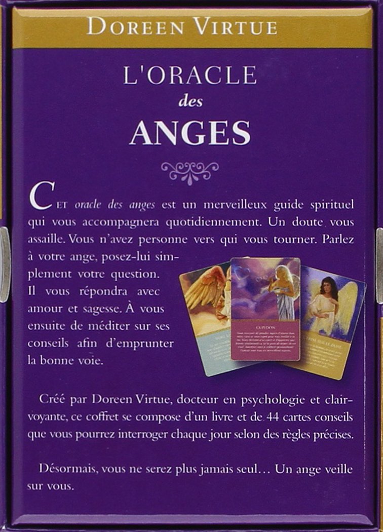 Créé par Doreen Virtue, docteur en psychologie et clair-voyante, ce coffret se compose d'un livre et de 44 cartes conseils que vous pourrez interroger chaque jour selon des règles précises.