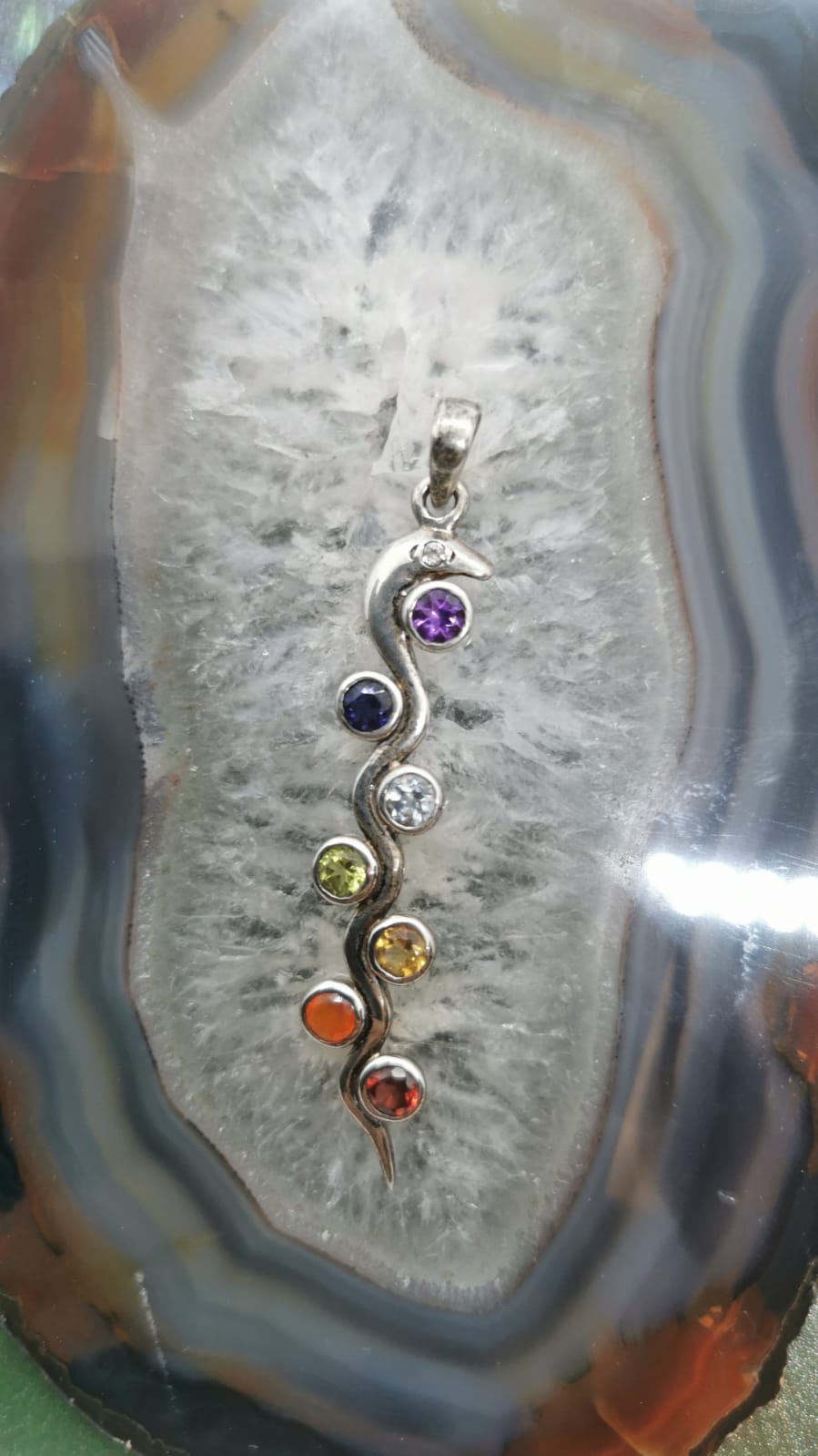 Ce pendentif contient : du grenat, de la cornaline, de la citrine, du péridot, de la topaze bleue, de la iolite et de l'améthyste.