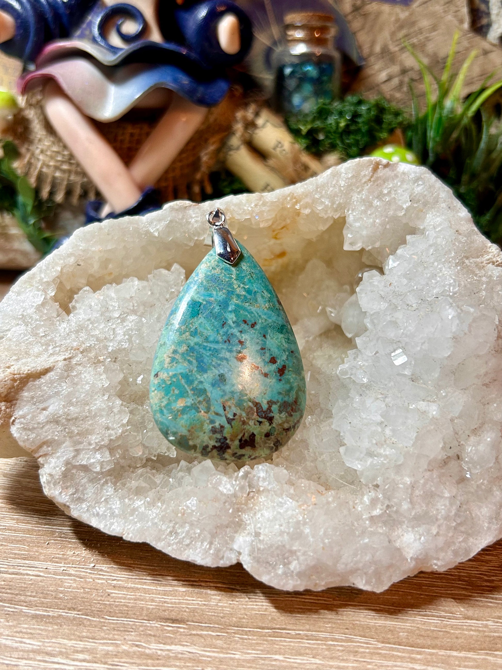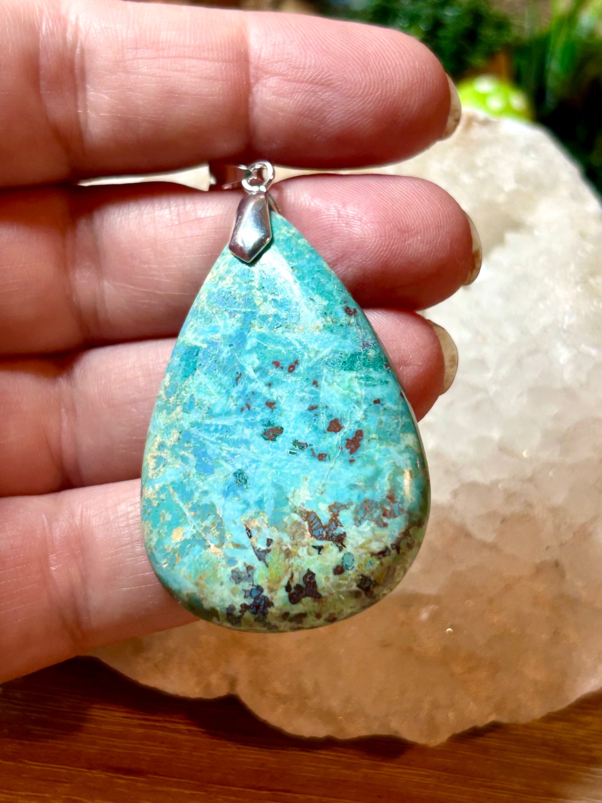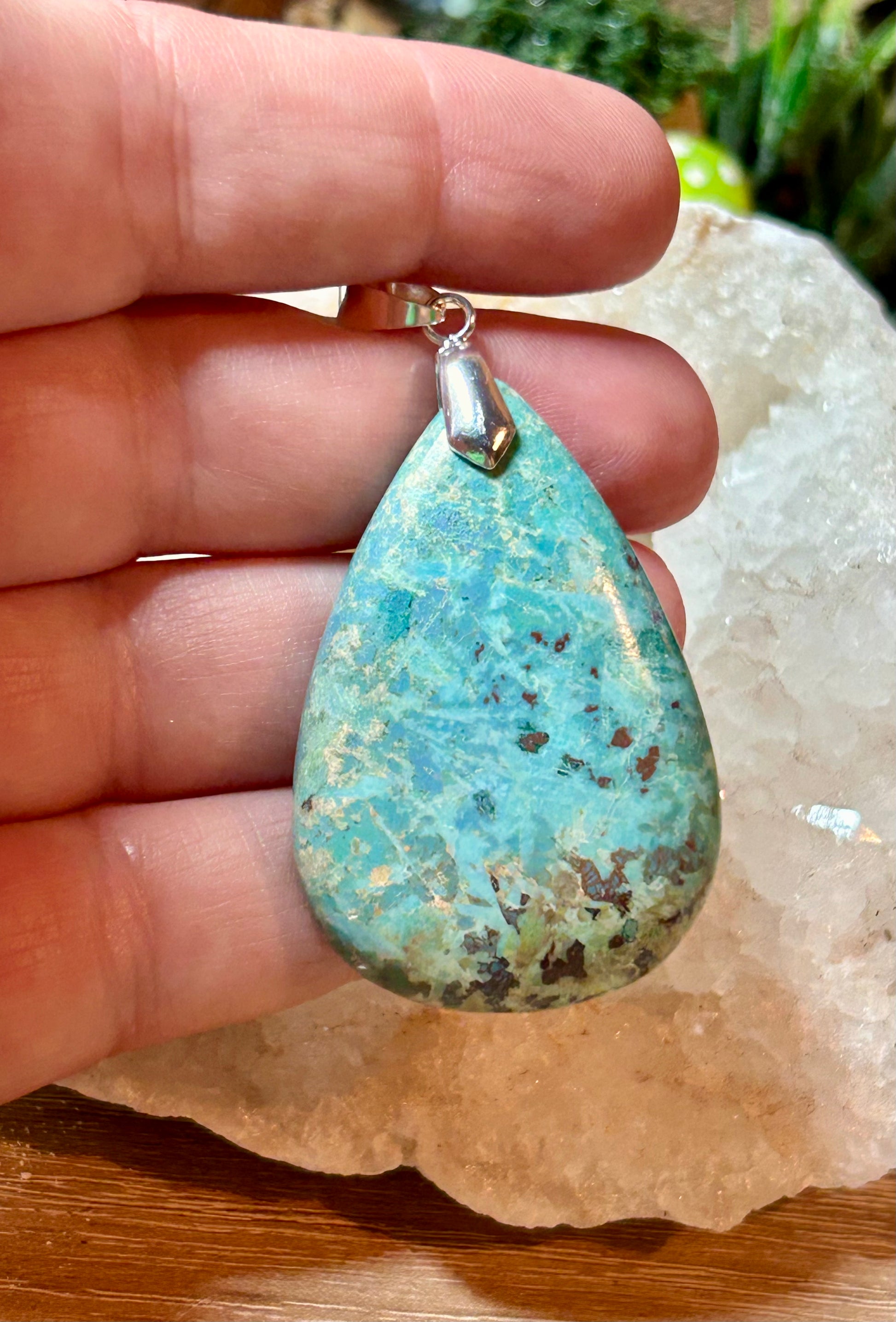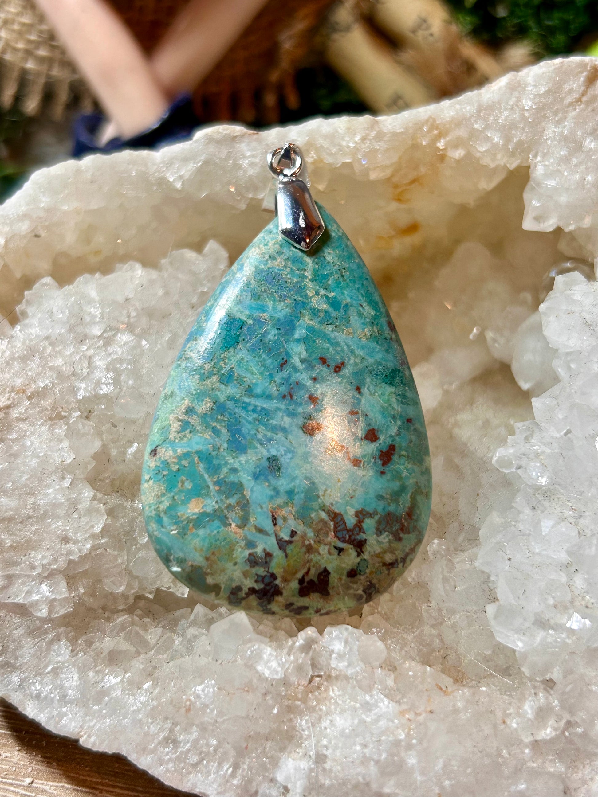Plan physique : La chrysocolle la faculté de soulager avec brio les affectations de la gorge (bronchite, angine, trachéite, etc.), des poumons, du dos et de l’estomac. Elle aide également à apaiser les rhumatismes, les brûlures, la fièvre et les articulations douloureuses. Cette pierre améliore la coordination motrice et favorise l’oxydation du sang et le bon fonctionnement du foie, des poumons, et du bulbe rachidien. Cette pierre aide également à neutraliser l’hypertension artérielle, la production d’insuline et les problèmes de thyroïde. Elle est bénéfique pour les douleurs menstruelles et les cystites.