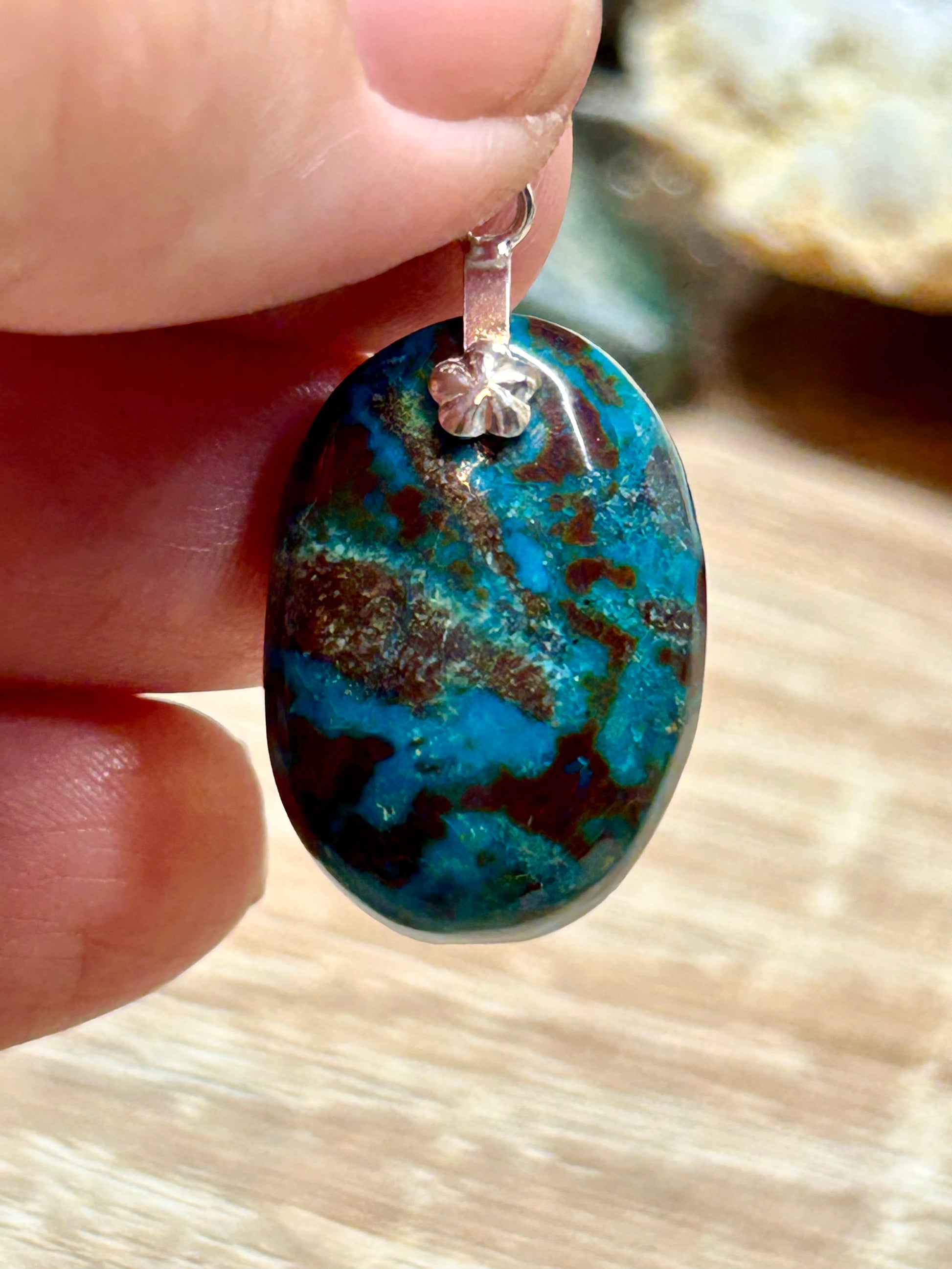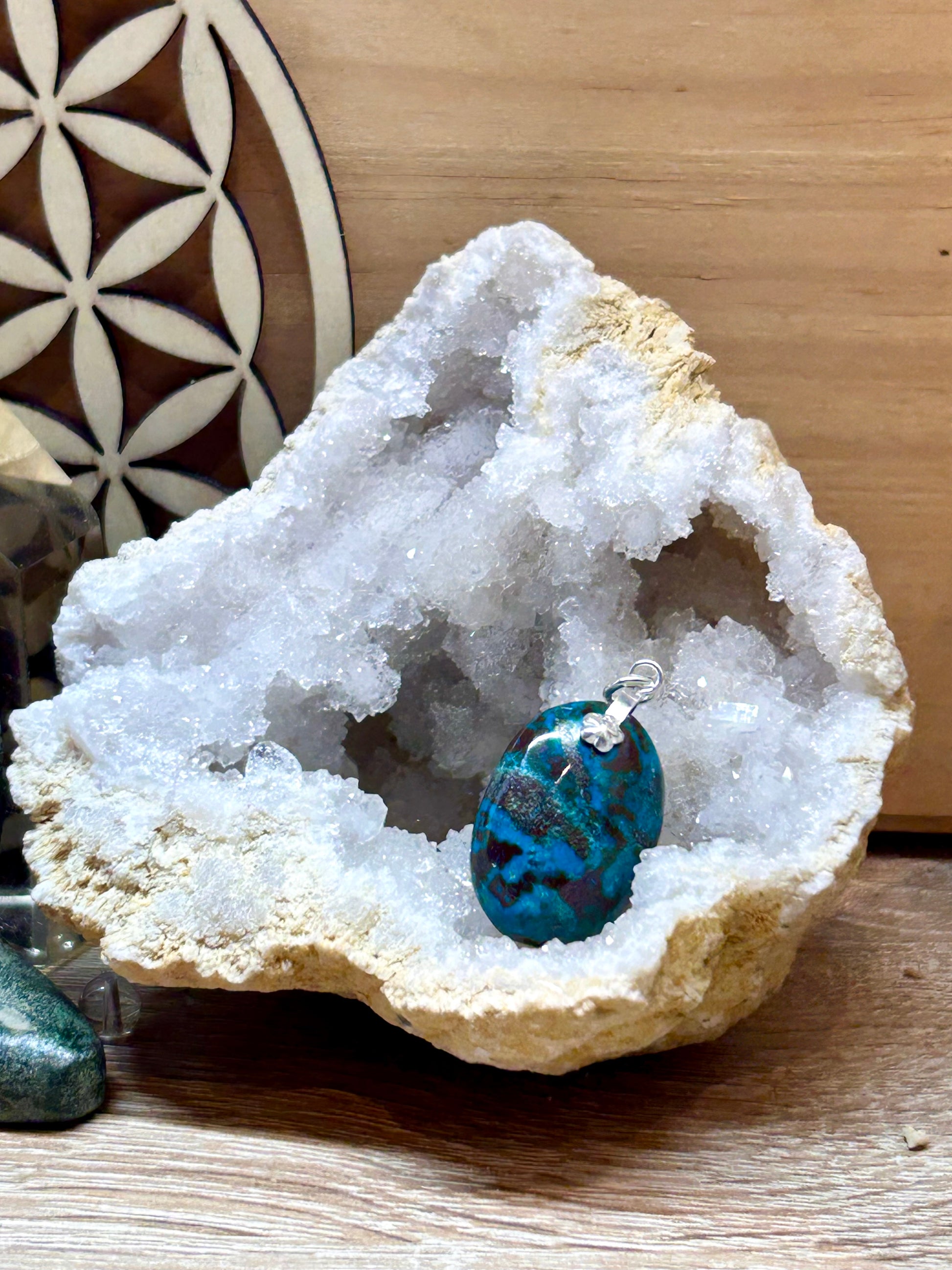Plan physique : La chrysocolle la faculté de soulager avec brio les affectations de la gorge (bronchite, angine, trachéite, etc.), des poumons, du dos et de l’estomac. Elle aide également à apaiser les rhumatismes, les brûlures, la fièvre et les articulations douloureuses. Cette pierre améliore la coordination motrice et favorise l’oxydation du sang et le bon fonctionnement du foie, des poumons, et du bulbe rachidien. Cette pierre aide également à neutraliser l’hypertension artérielle, la production d’insuline et les problèmes de thyroïde. Elle est bénéfique pour les douleurs menstruelles et les cystites.