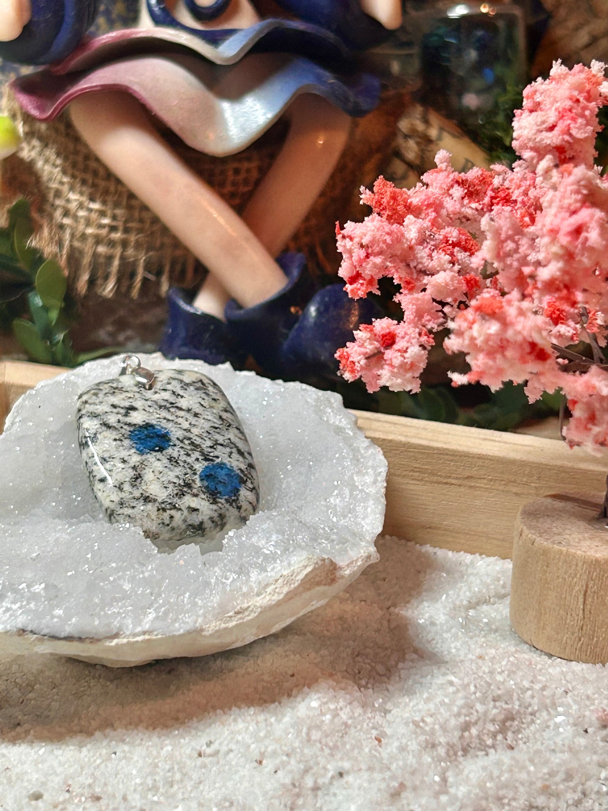 Plan physique : Le jaspe K2 améliore pour notre tonus, notre rectitude. Sur le plan psychologique, elle favorise l’assurance et la communication, elle ouvre le cœur en créant une aimante ouverture à l’autre. Les aspects thérapeutiques associés du granit et de l’azurite, génèrent une vibration de guérison merveilleuse. On peut l’employer pour les maux liés à la gorge et à la tête.