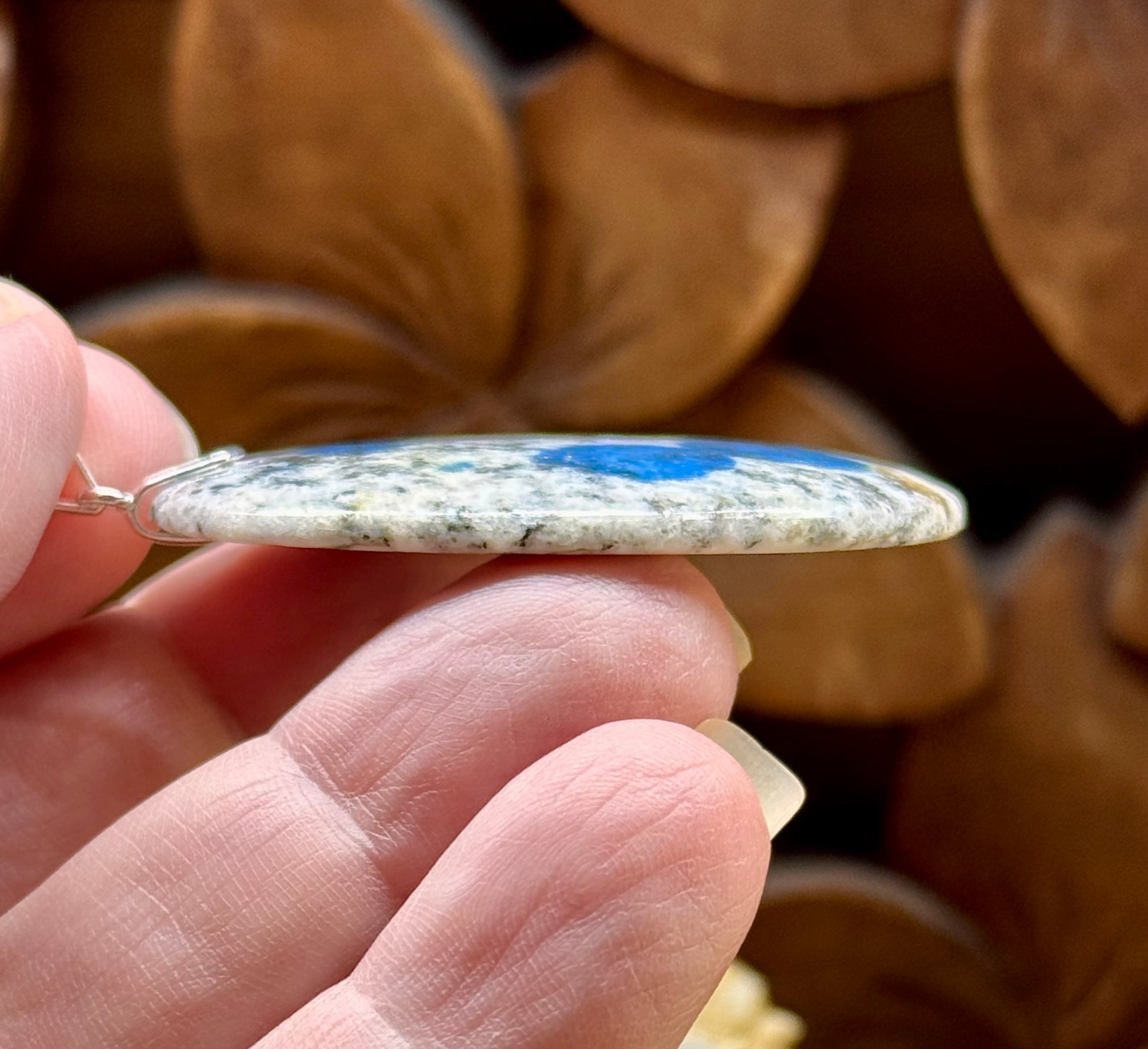 Le jaspe K2 est une pierre provenant d’un lieu exceptionnel, la montagne himalayenne K2 (2ème plus haut sommet du monde), située sur la frontière sino-pakistanaise. Malgré son nom commercial, ce n’est pas un jaspe, mais un granit blanc composé de nodules d’azurite bleue. C’est une combinaison très rare dans la nature.