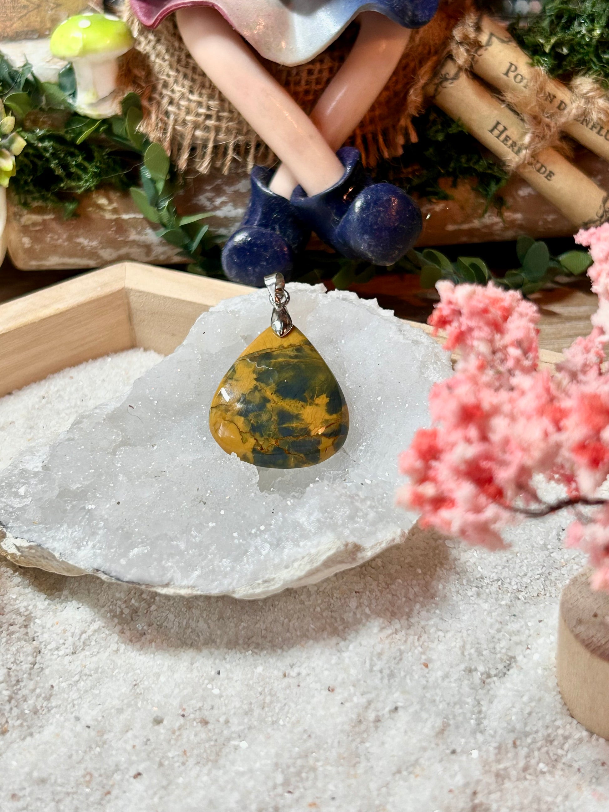 Elle est composée de Pietersite bleue et de l’Oeil de tigre jaune doré qui fusionnent pour former une apparence extrêmement rare et unique qui scintille et montre sa véritable chatoyance.