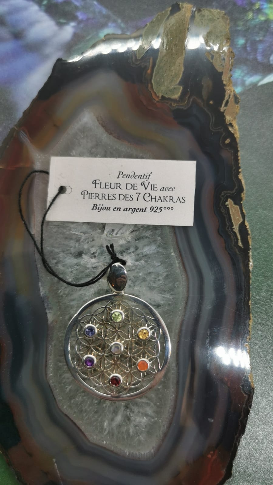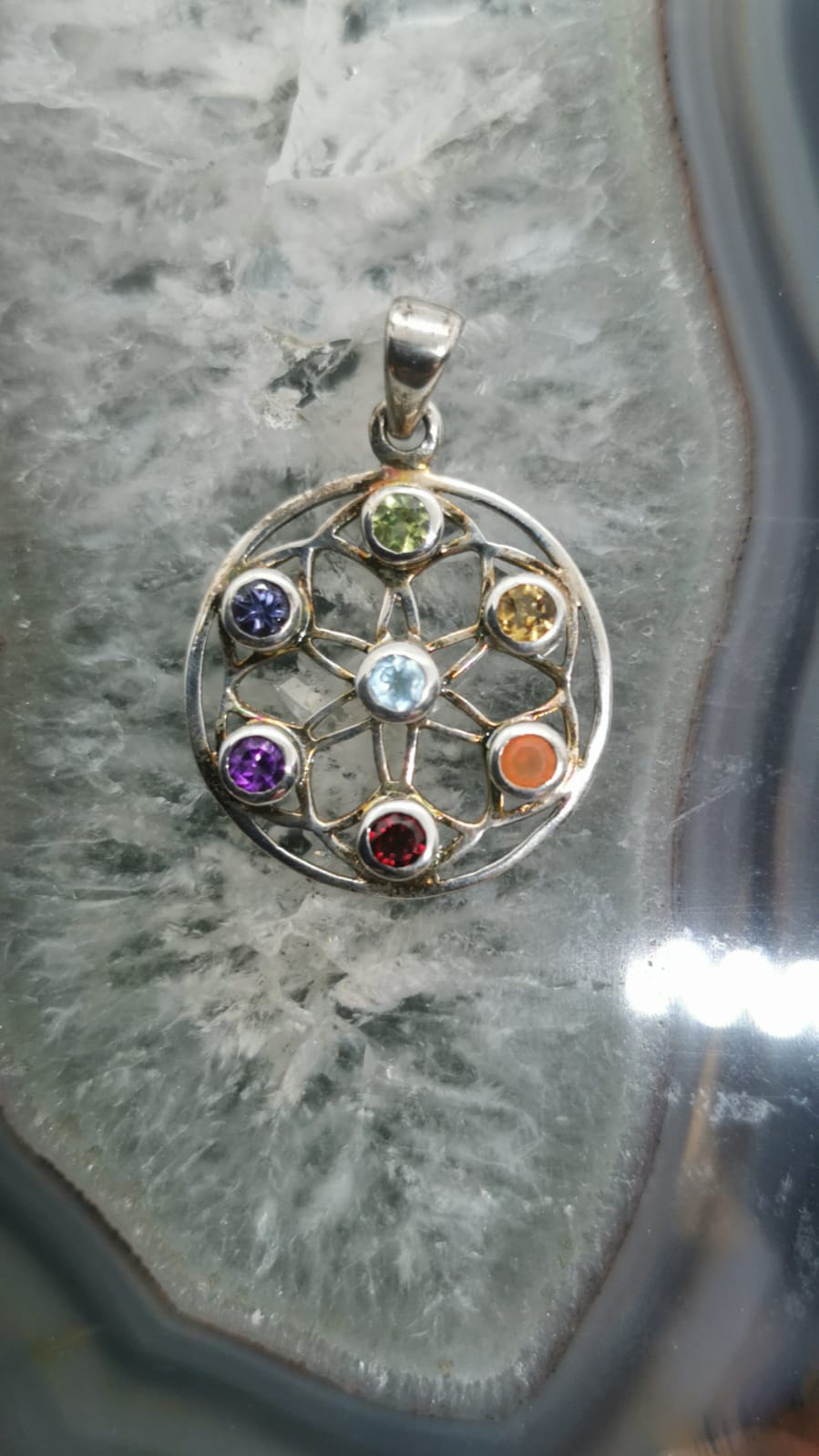 Minéraux présents : grenat, cornaline, citrine, péridot, pierre de lune, topaze bleue, cyanite et améthyste.