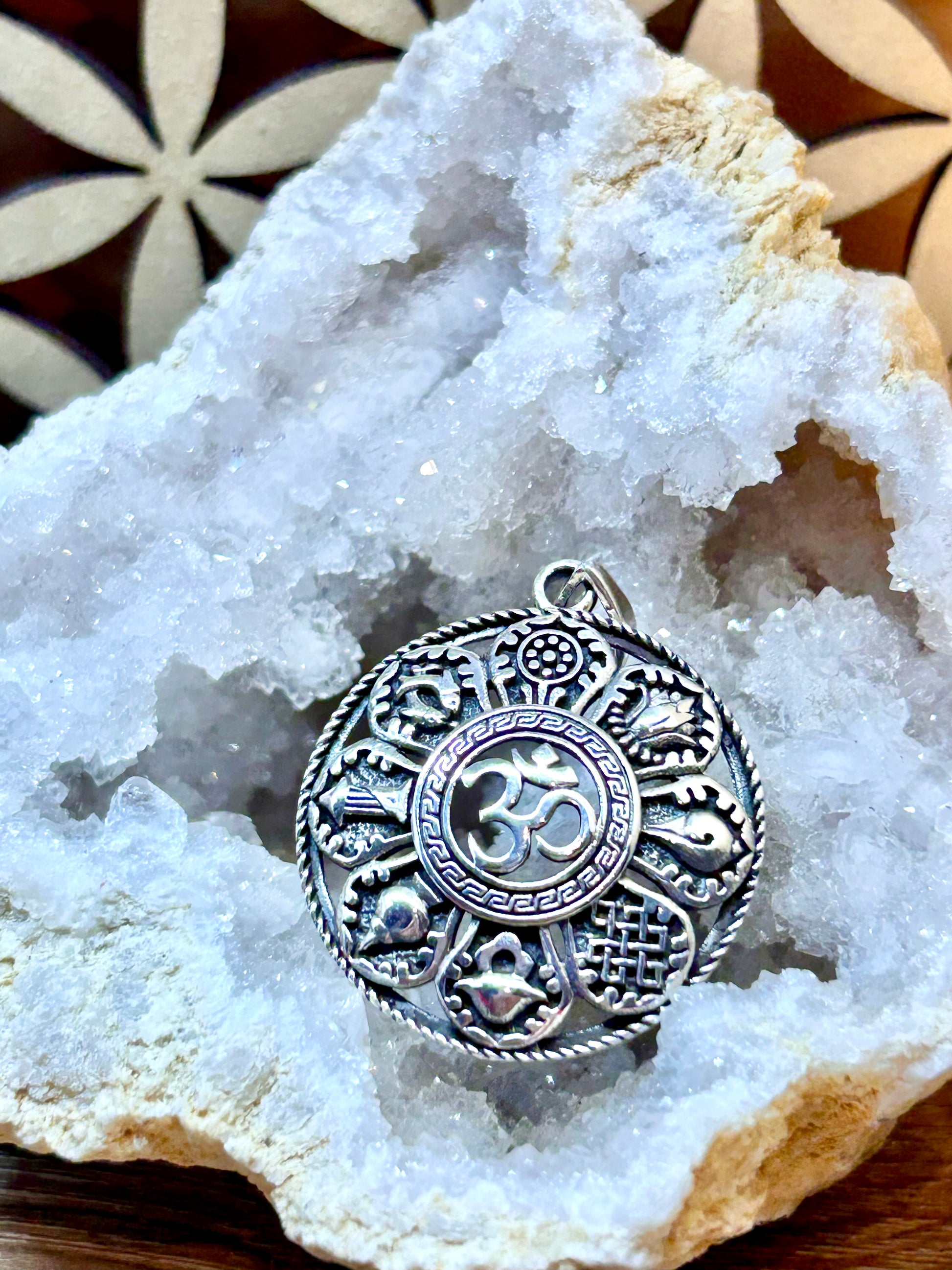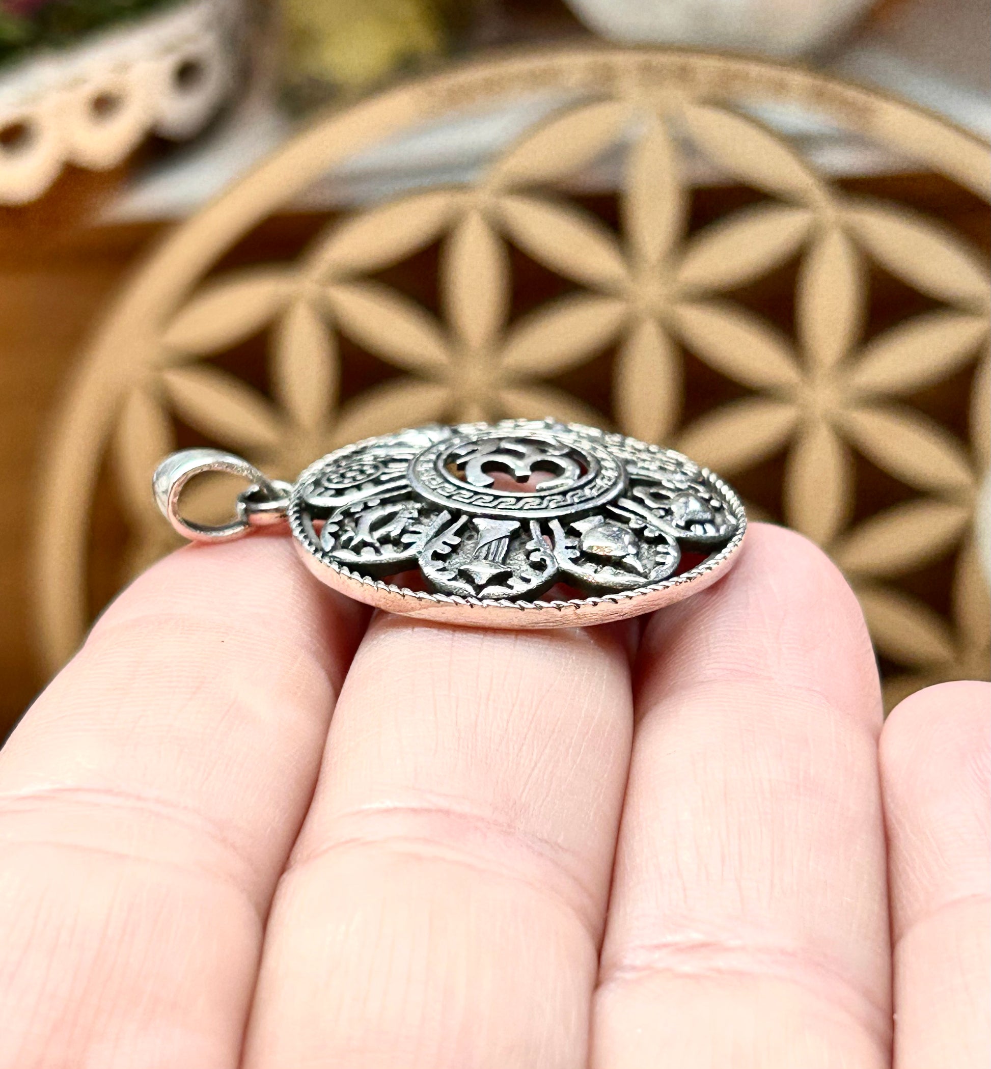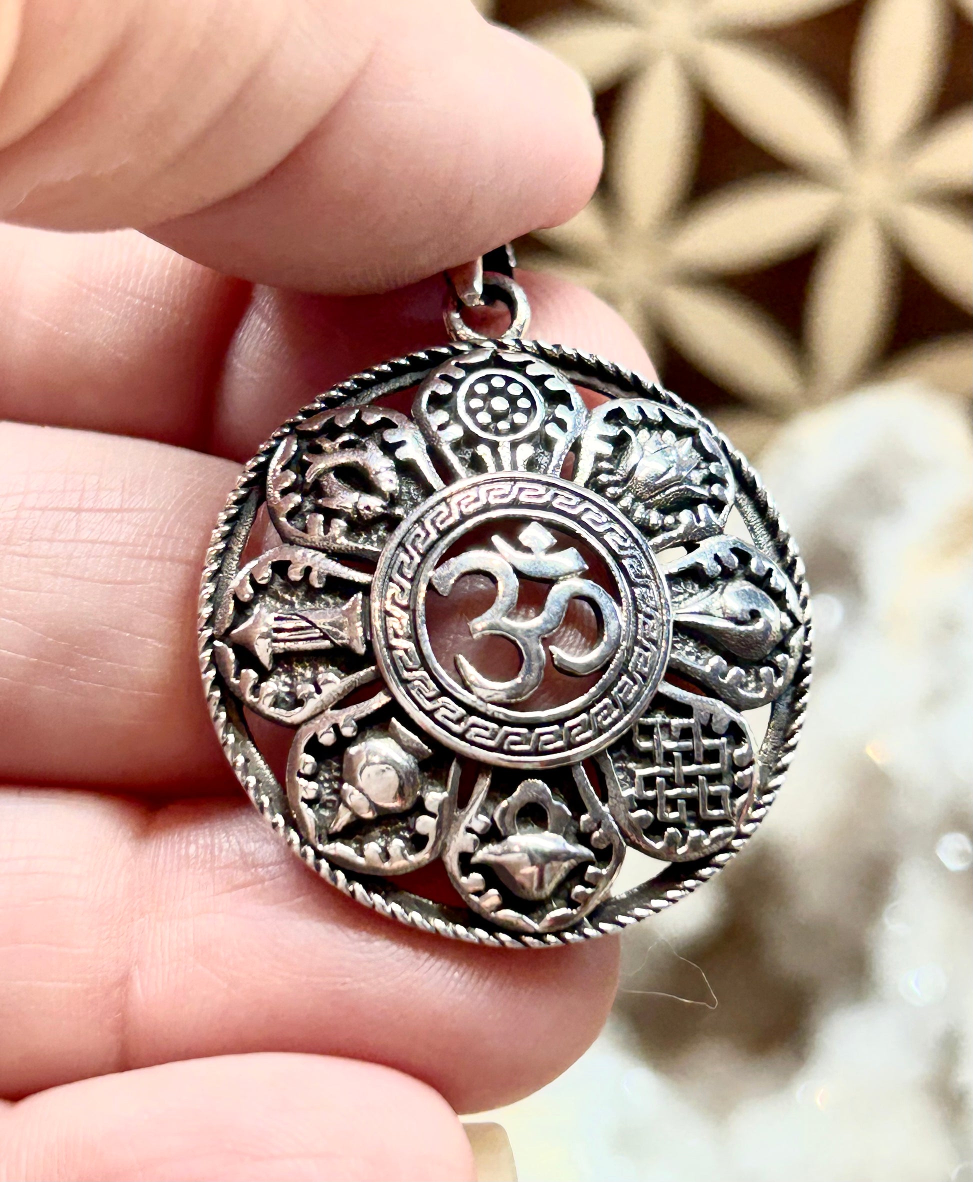Pendentif Ôm en argent gravé de symboles tibétains