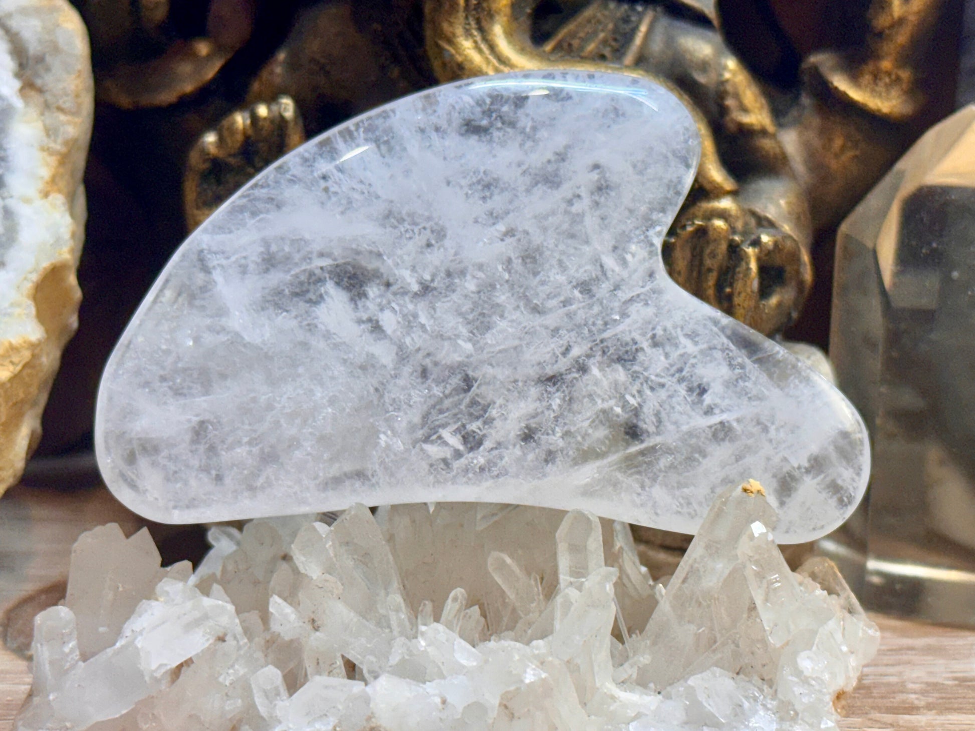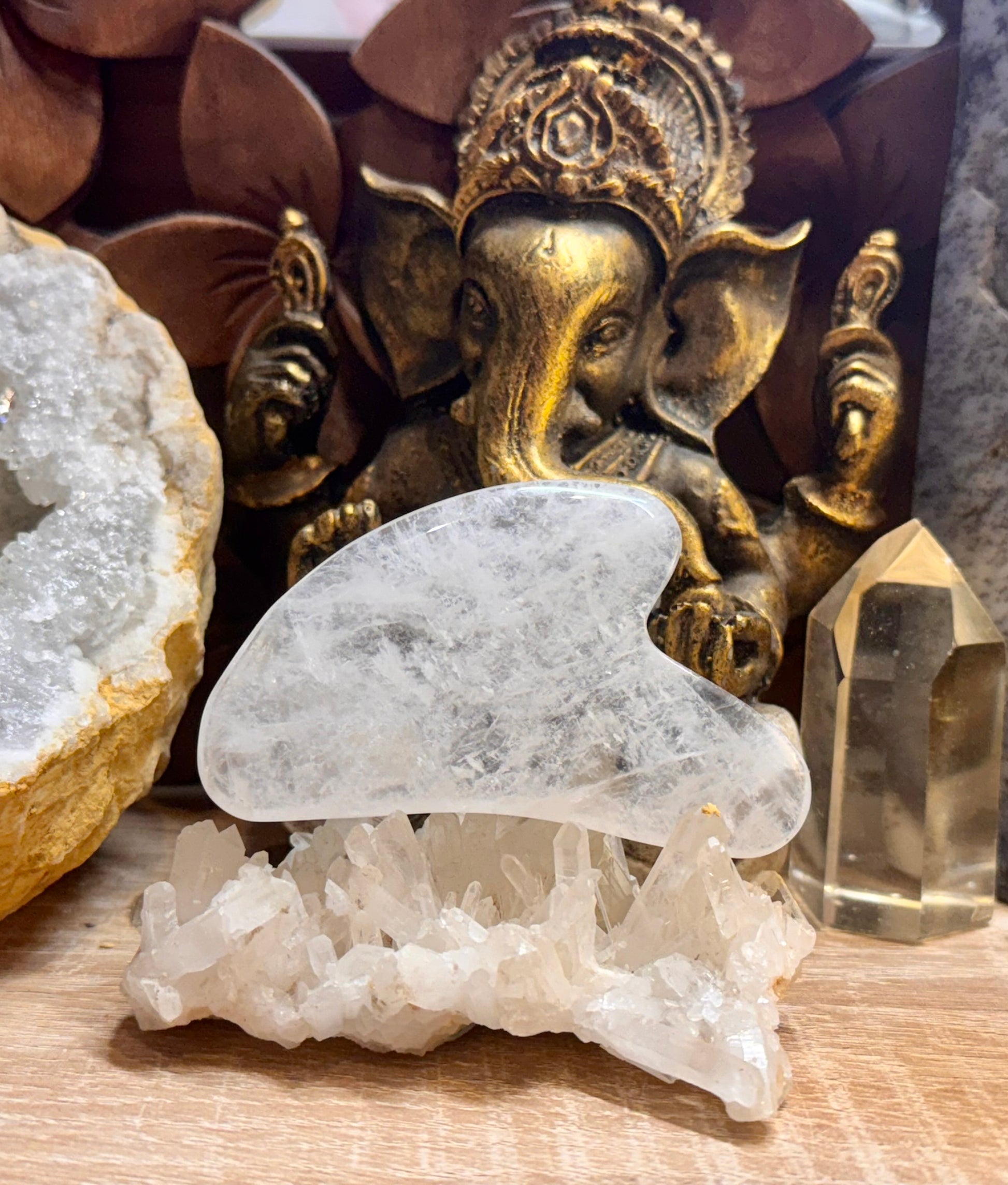 Le Gua Sha Sun&Sia se décline en version Cristal de Roche, pierre reine en lithothérapie avec une fraîcheur incroyable, sa couleur est une pureté apaisante.